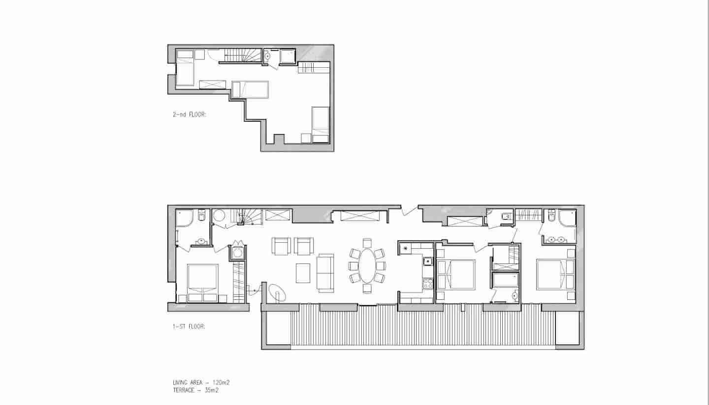 Inside, the apartment features three elegant bedrooms, each with a double bed and its own en-suite bathroom. A cozy mezzanine level provides an additional sleeping area with four single beds and a private shower. Please note that the mezzanine has a lower ceiling height, ranging from 96 cm to 173 cm, and accessing the beds requires bending. The total living space spans 135 square meters (1,453 square feet), with an additional 35 square meter (377 square feet) terrace offering stunning views of the surrounding mountains.