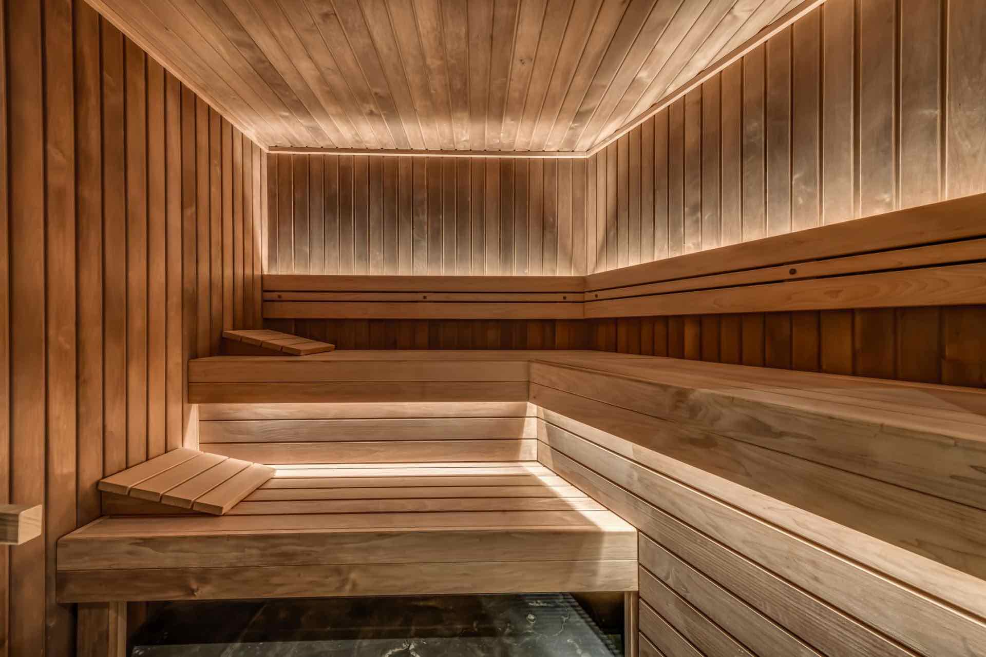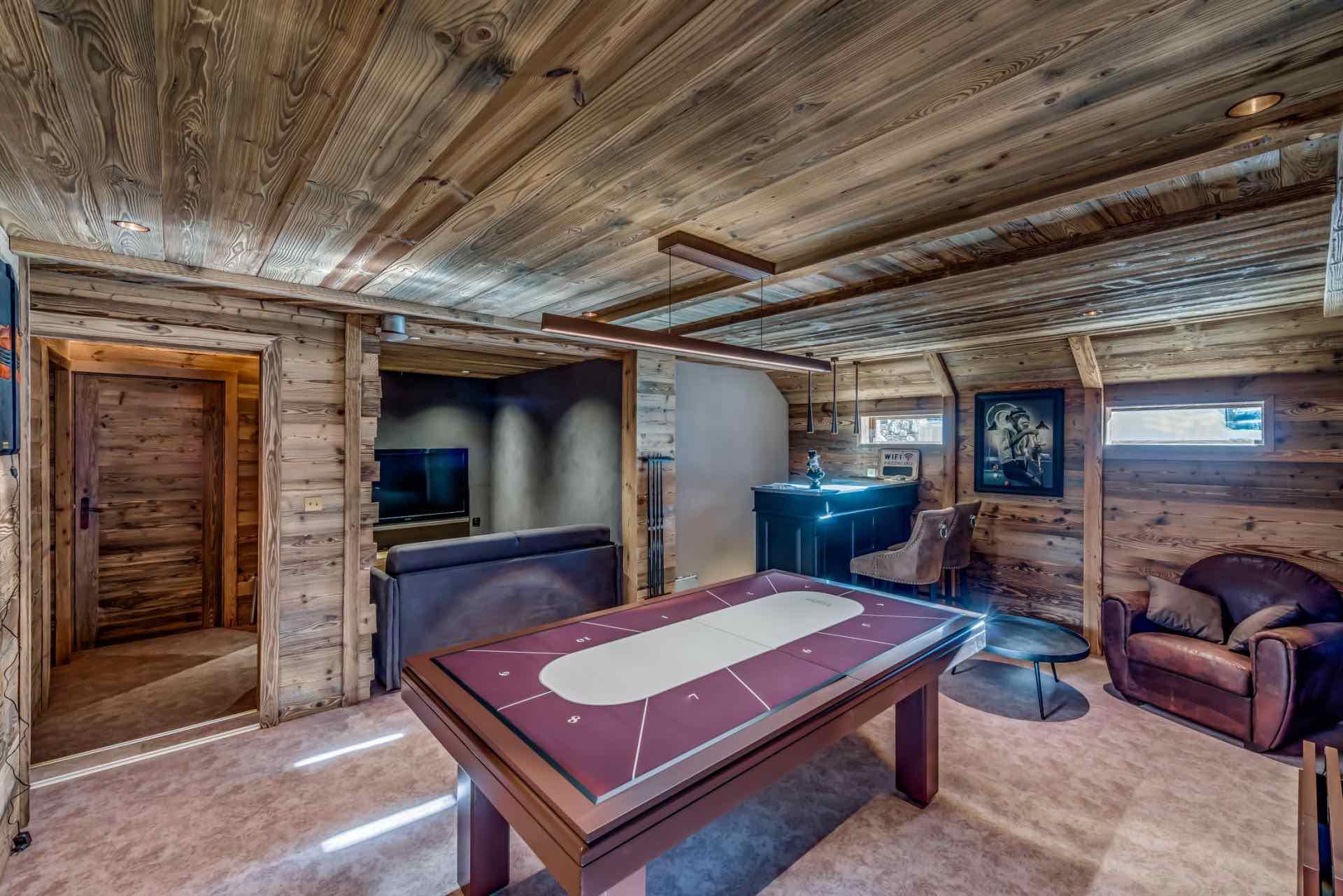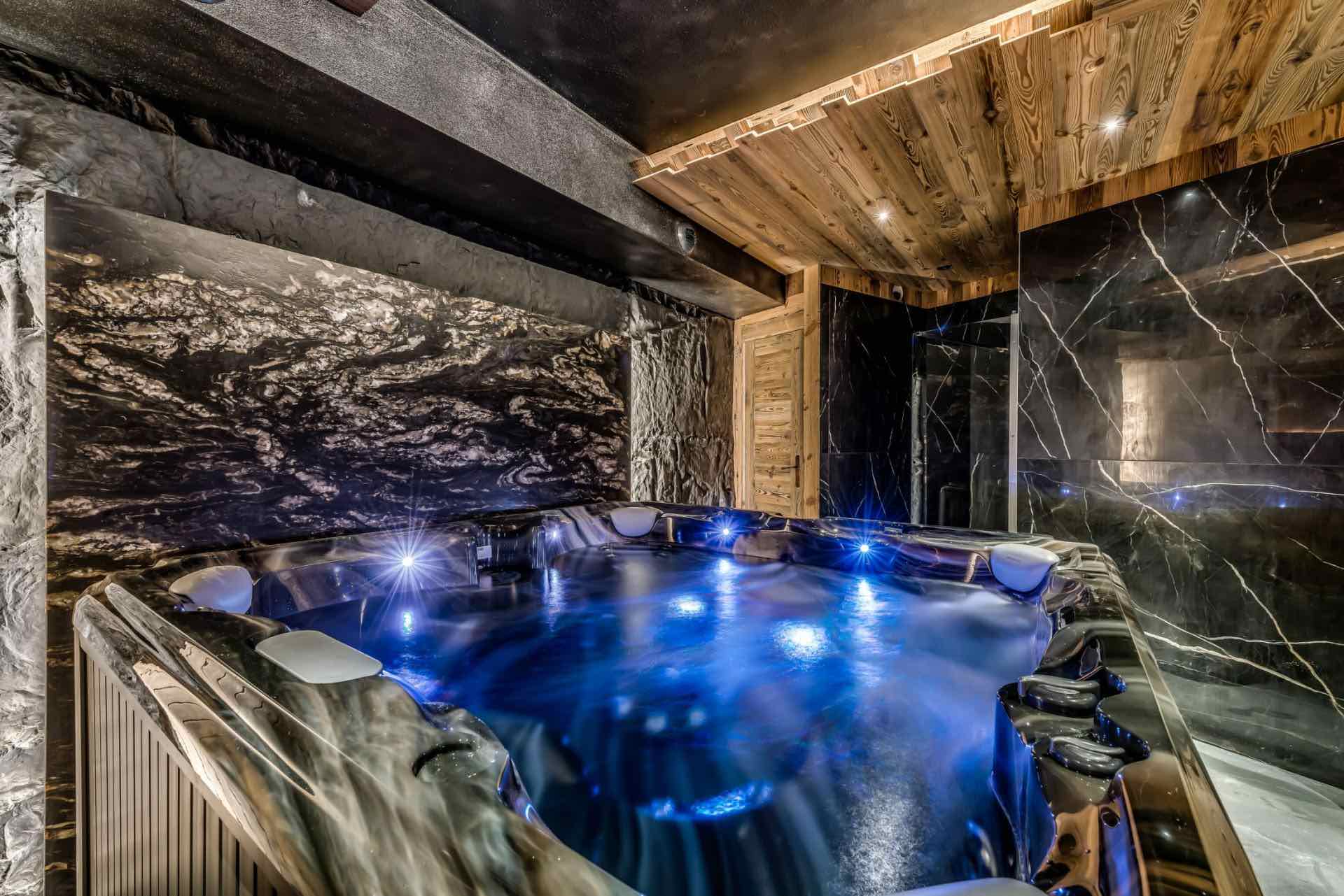On the ground floor, the chalet’s private spa invites relaxation. A seven-seat hot tub forms the centrepiece, set against natural wood and granite walls for a mountain-spring ambiance. An Aspen-wood sauna and a refreshing Italian shower complete this luxurious retreat.