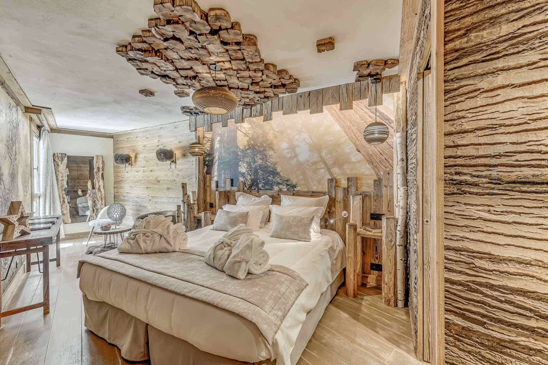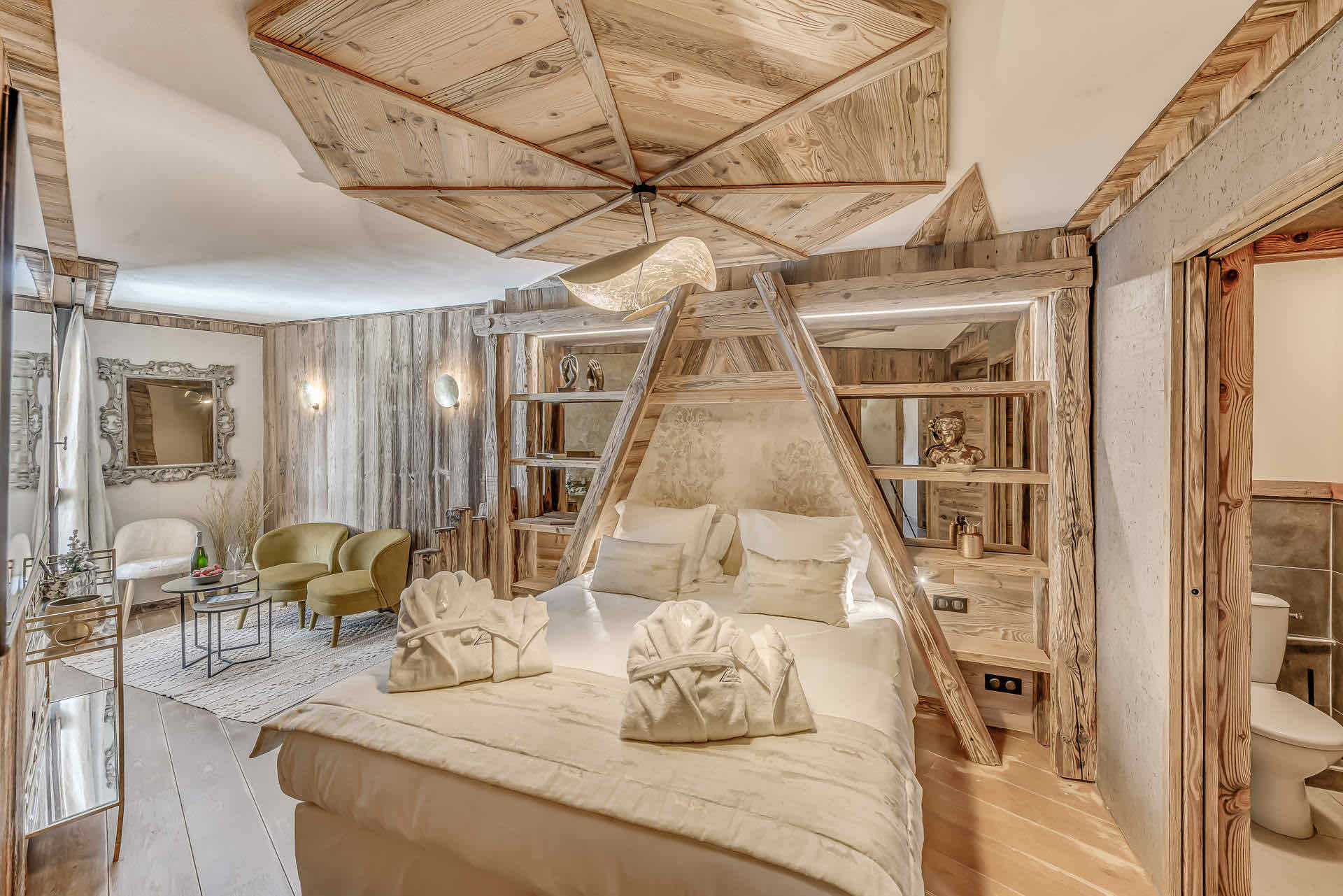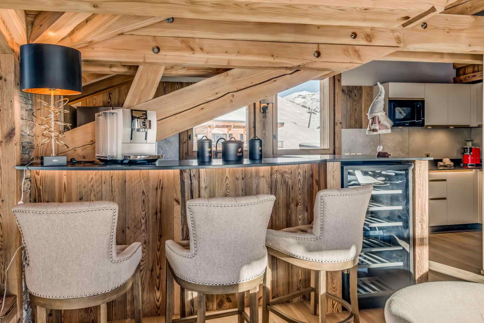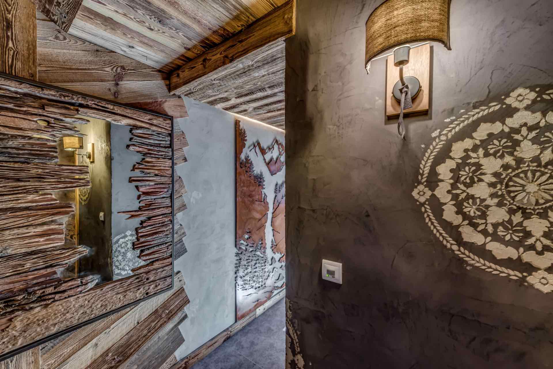 On the ground floor, the chalet’s private spa invites relaxation. A seven-seat hot tub forms the centrepiece, set against natural wood and granite walls for a mountain-spring ambiance. An Aspen-wood sauna and a refreshing Italian shower complete this luxurious retreat.