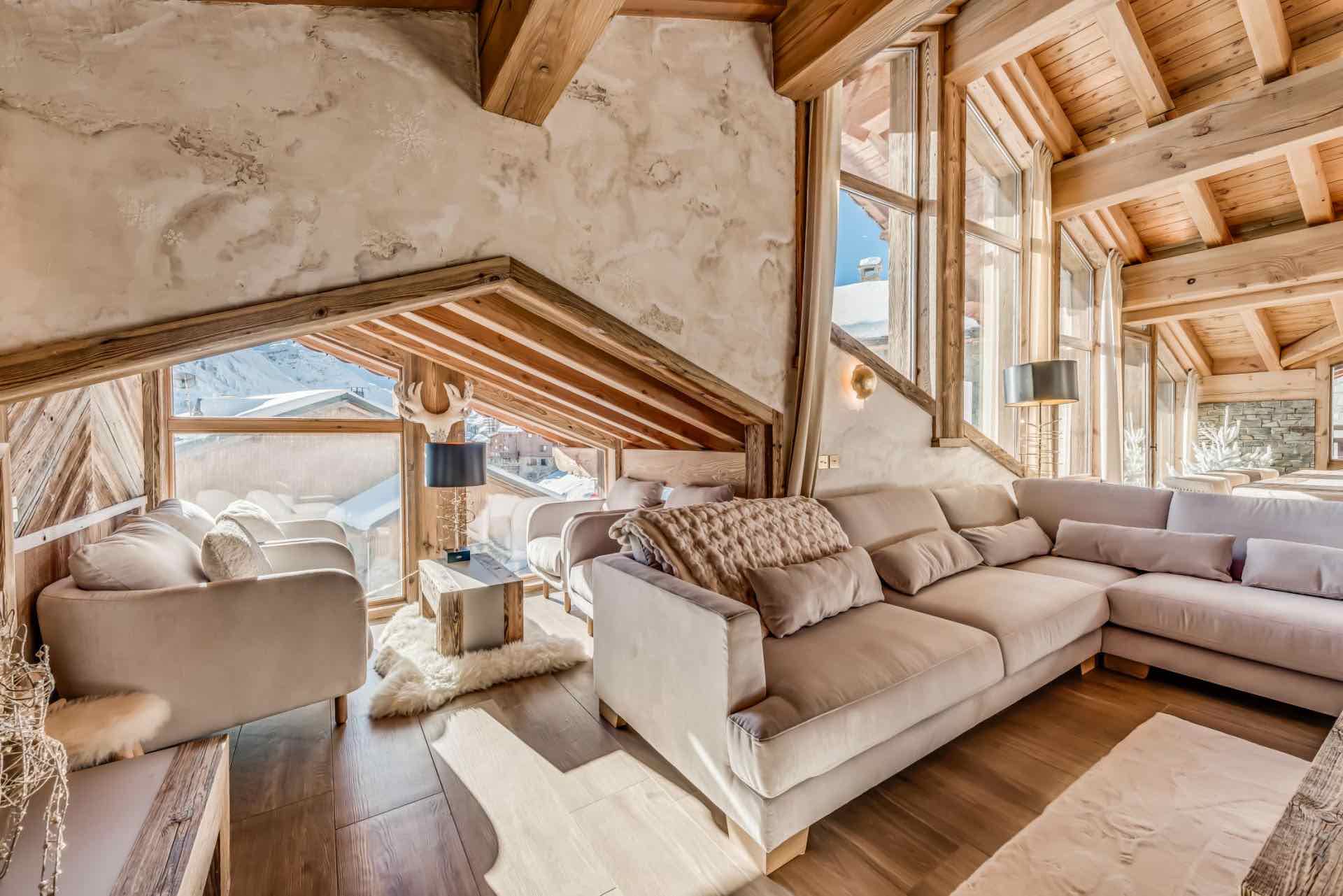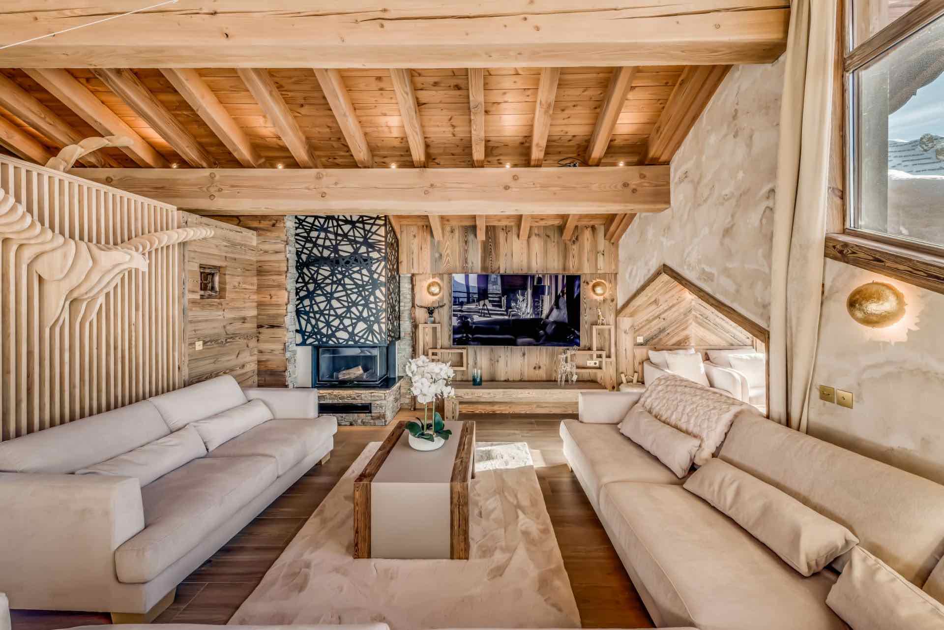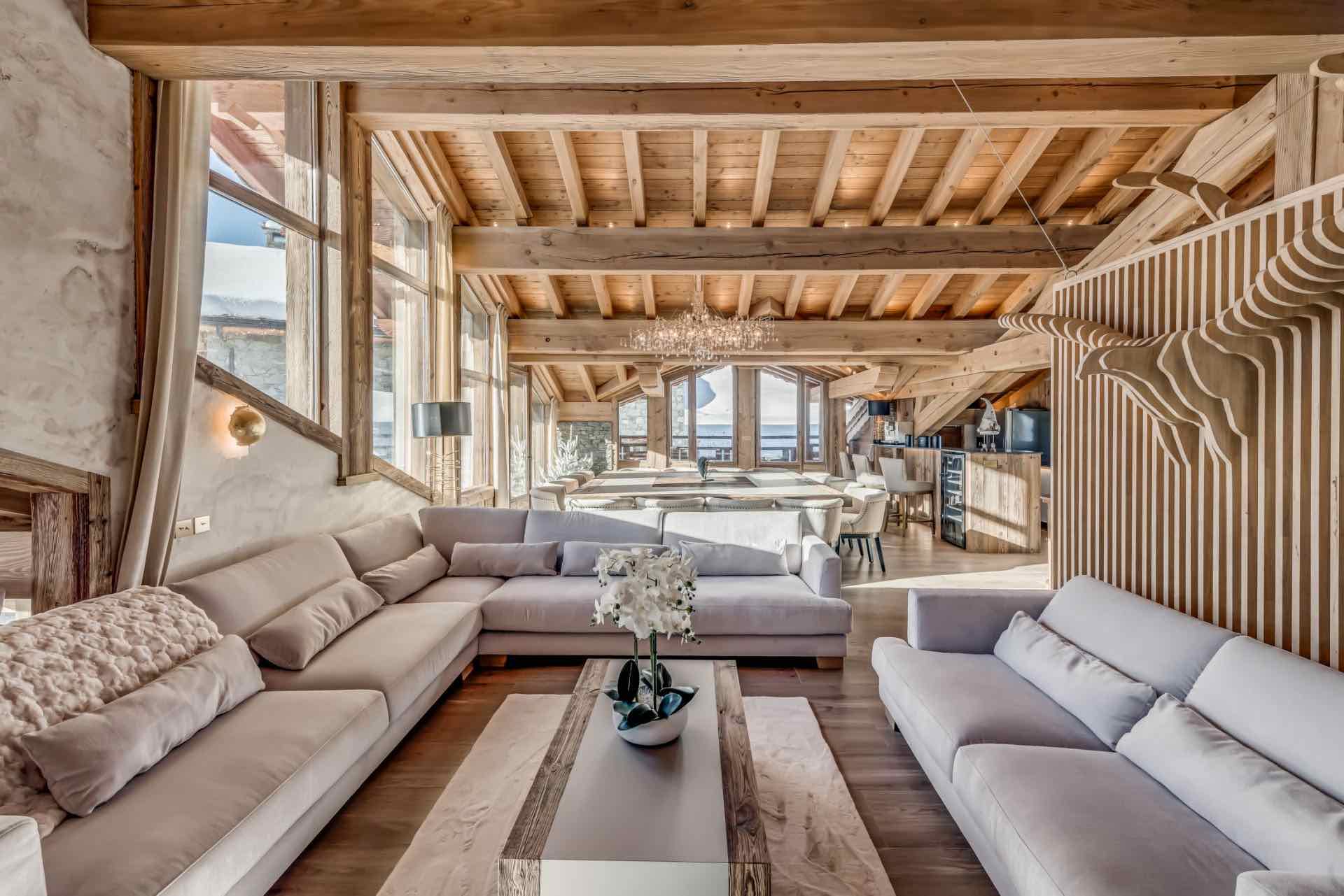 The main living area occupies the top floor, designed with a soaring cathedral ceiling and exposed timber beams that evoke a classic alpine atmosphere. A striking feature fireplace anchors the lounge, while a cosy seating nook frames panoramic views of the surrounding peaks. Attention to detail is evident throughout, from the wooden slats adorned with carved ibex and eagle figures to the plush sofas, sparkling chandeliers, and a bespoke square dining table seating 16. The modern kitchen is fully equipped for preparing gourmet meals, while floor-to-ceiling windows flood the space with natural light and open onto multiple balconies overlooking the mountains.