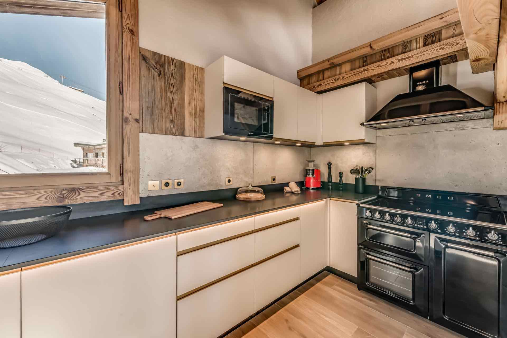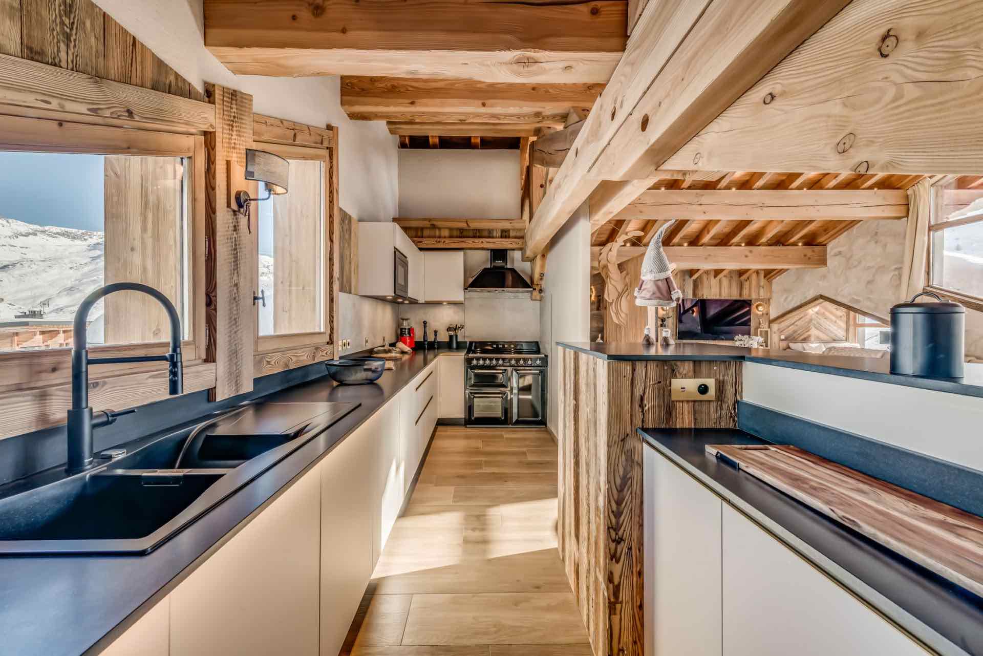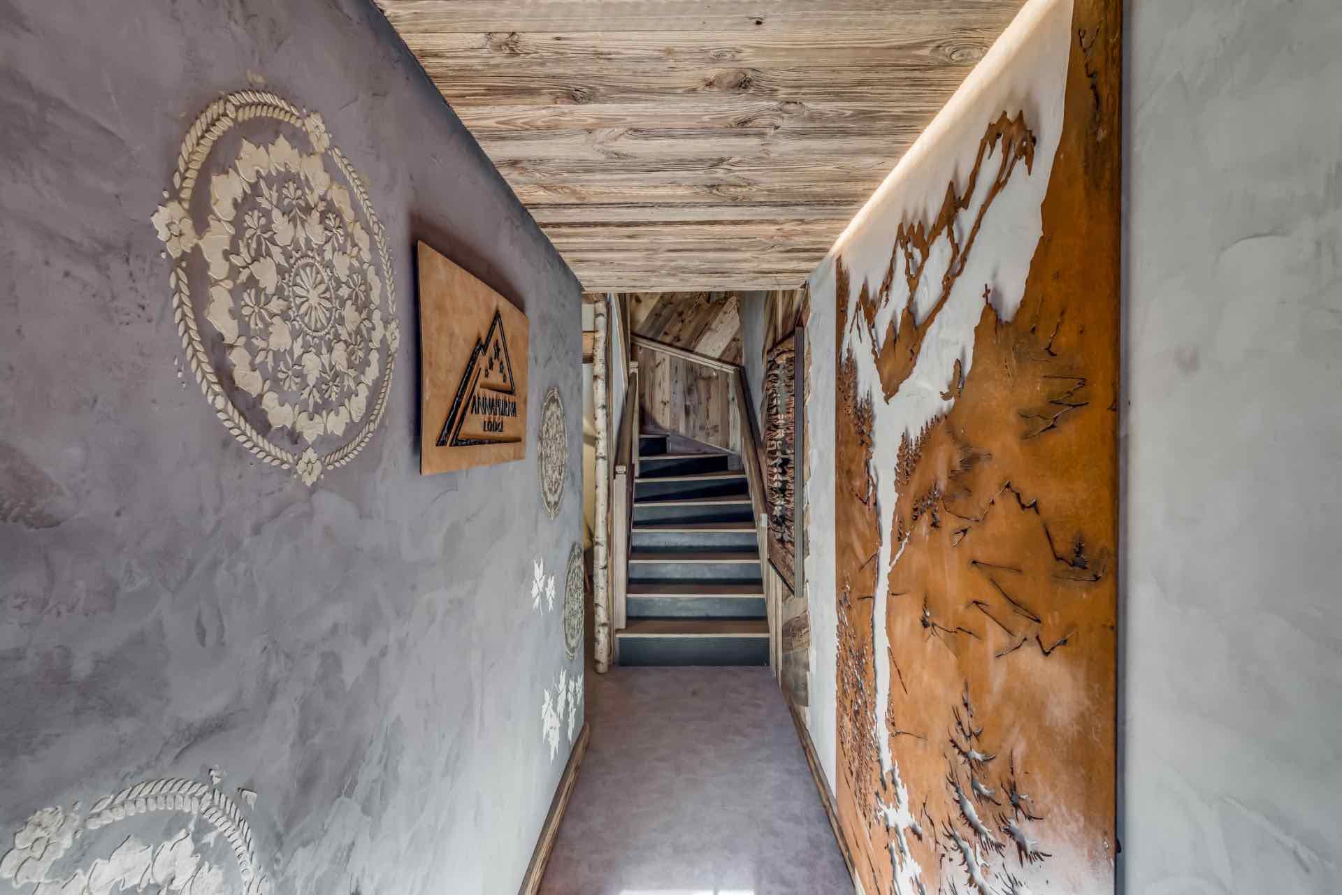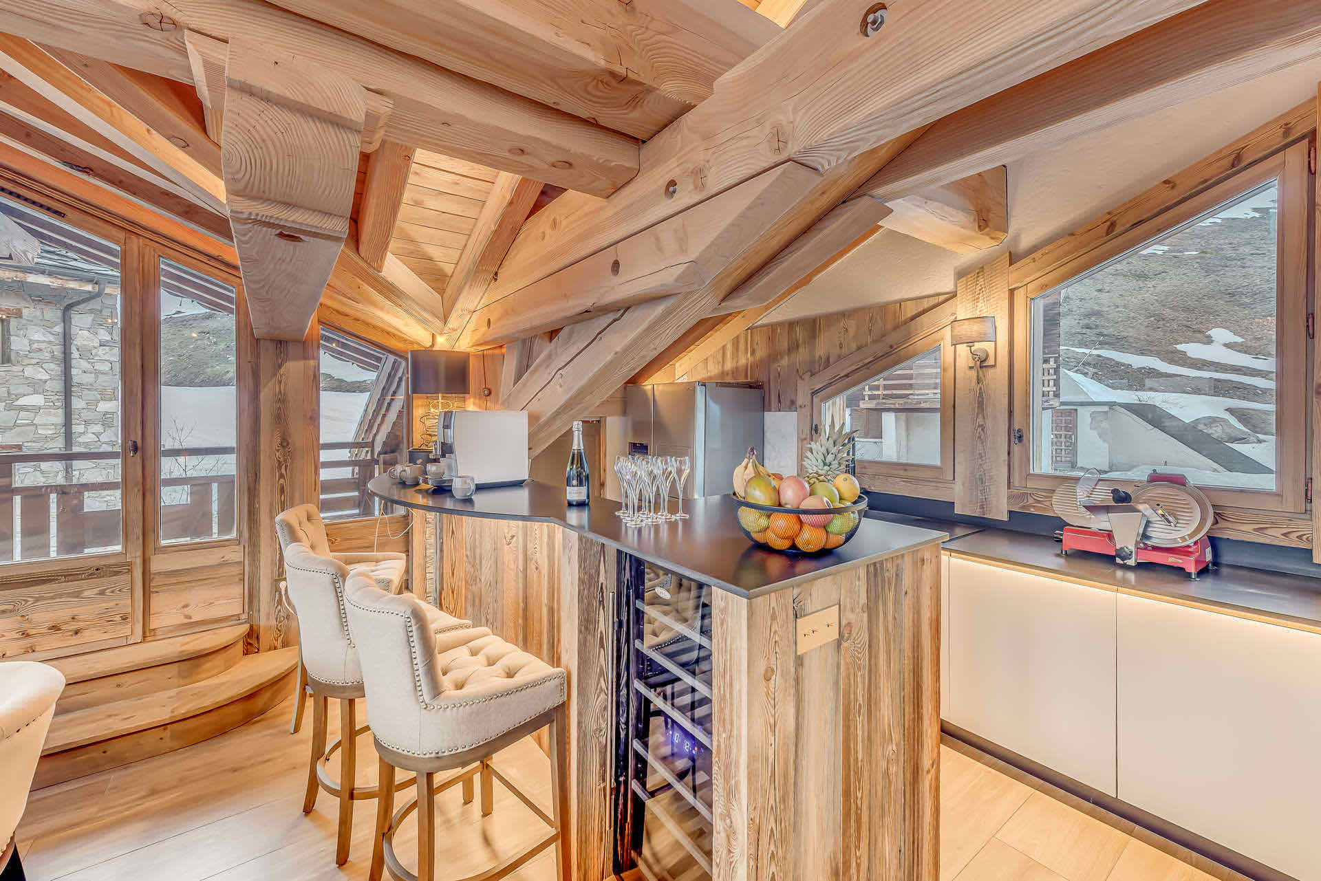 The main living area occupies the top floor, designed with a soaring cathedral ceiling and exposed timber beams that evoke a classic alpine atmosphere. A striking feature fireplace anchors the lounge, while a cosy seating nook frames panoramic views of the surrounding peaks. Attention to detail is evident throughout, from the wooden slats adorned with carved ibex and eagle figures to the plush sofas, sparkling chandeliers, and a bespoke square dining table seating 16. The modern kitchen is fully equipped for preparing gourmet meals, while floor-to-ceiling windows flood the space with natural light and open onto multiple balconies overlooking the mountains.