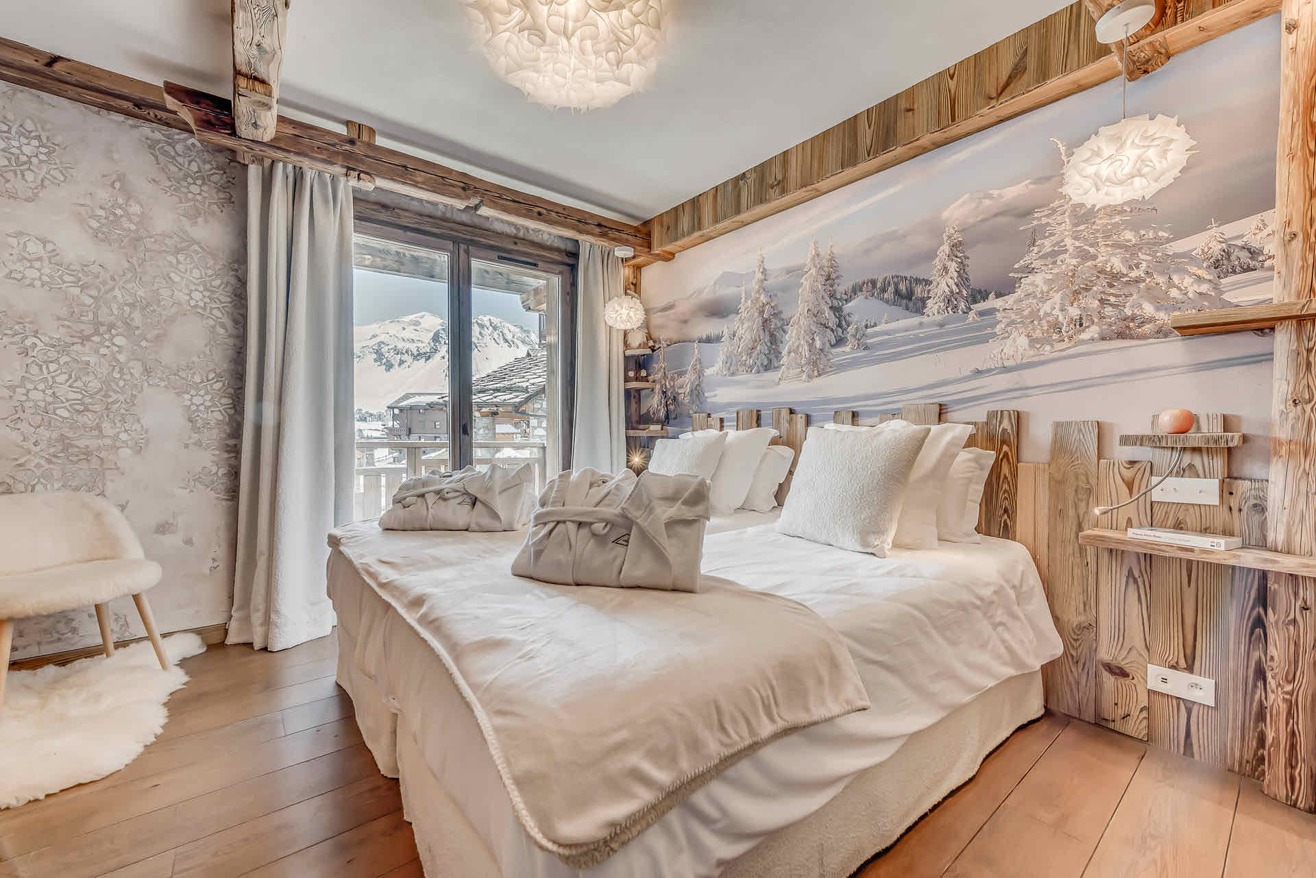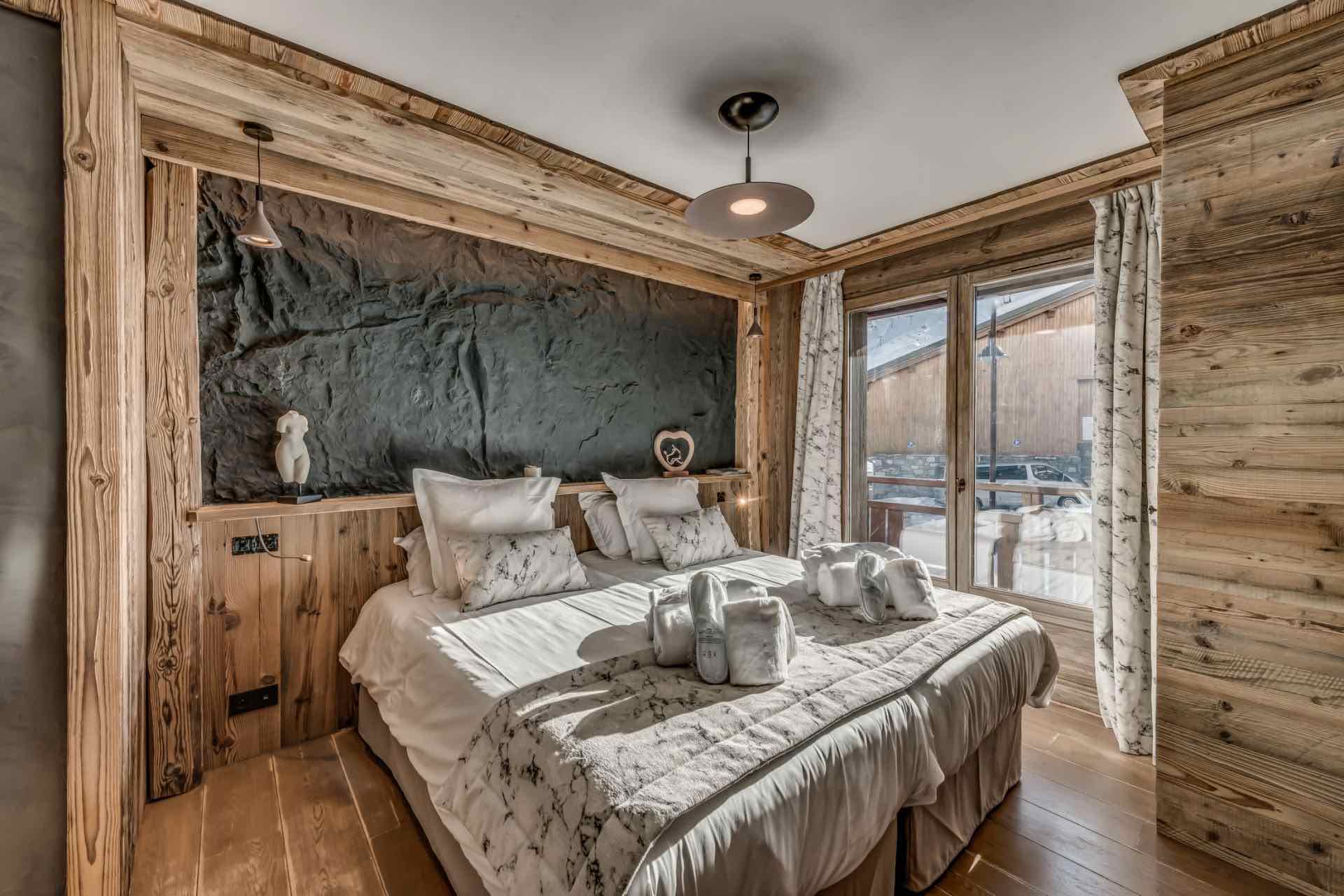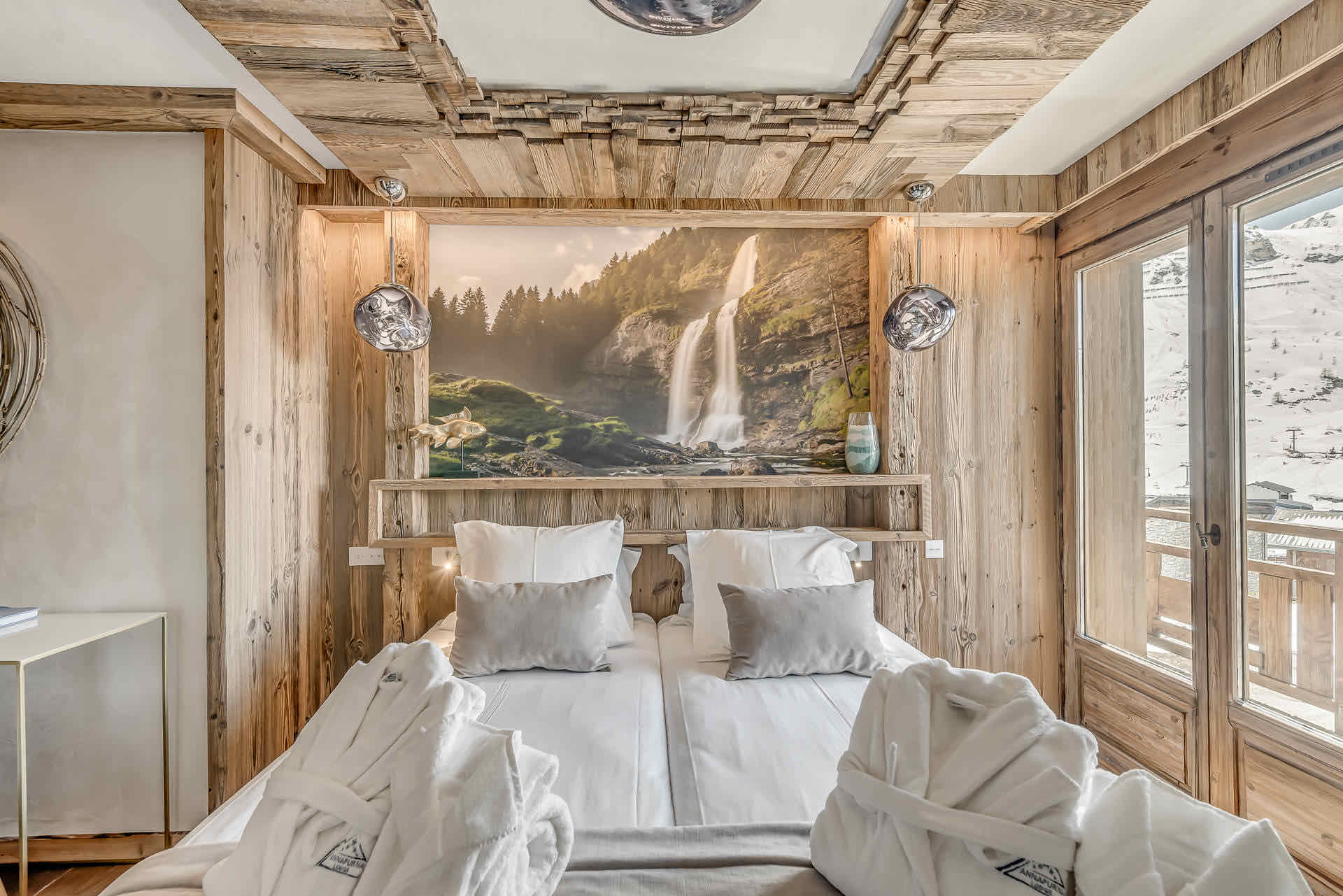 The chalet offers eight en-suite bedrooms across the first and second floors, comfortably sleeping up to 16 guests. Two master suites are complemented by six additional bedrooms, all adaptable as double or twin to suit different group needs. Many rooms open onto private balconies, and every en-suite is beautifully appointed with modern alpine finishes.