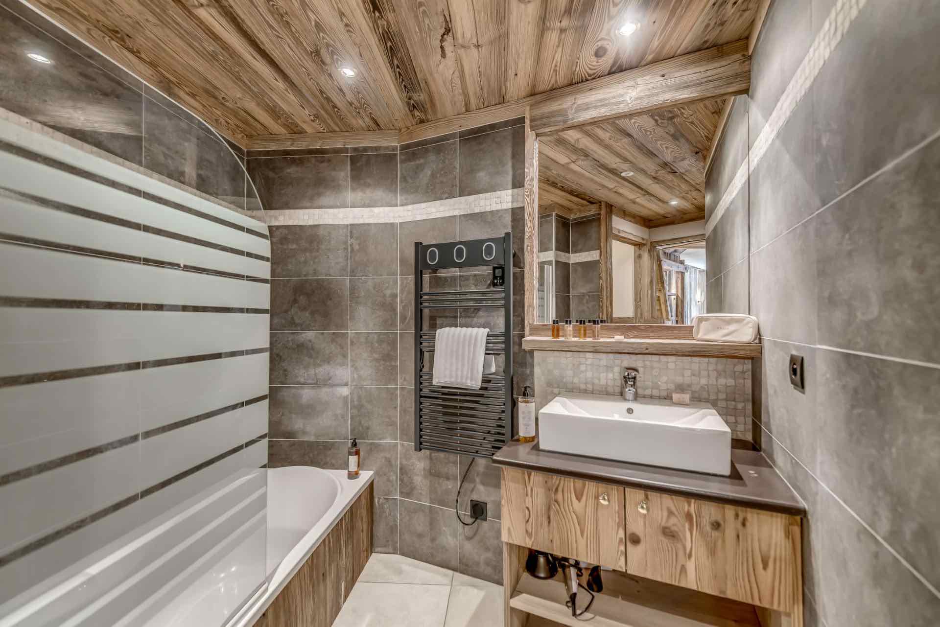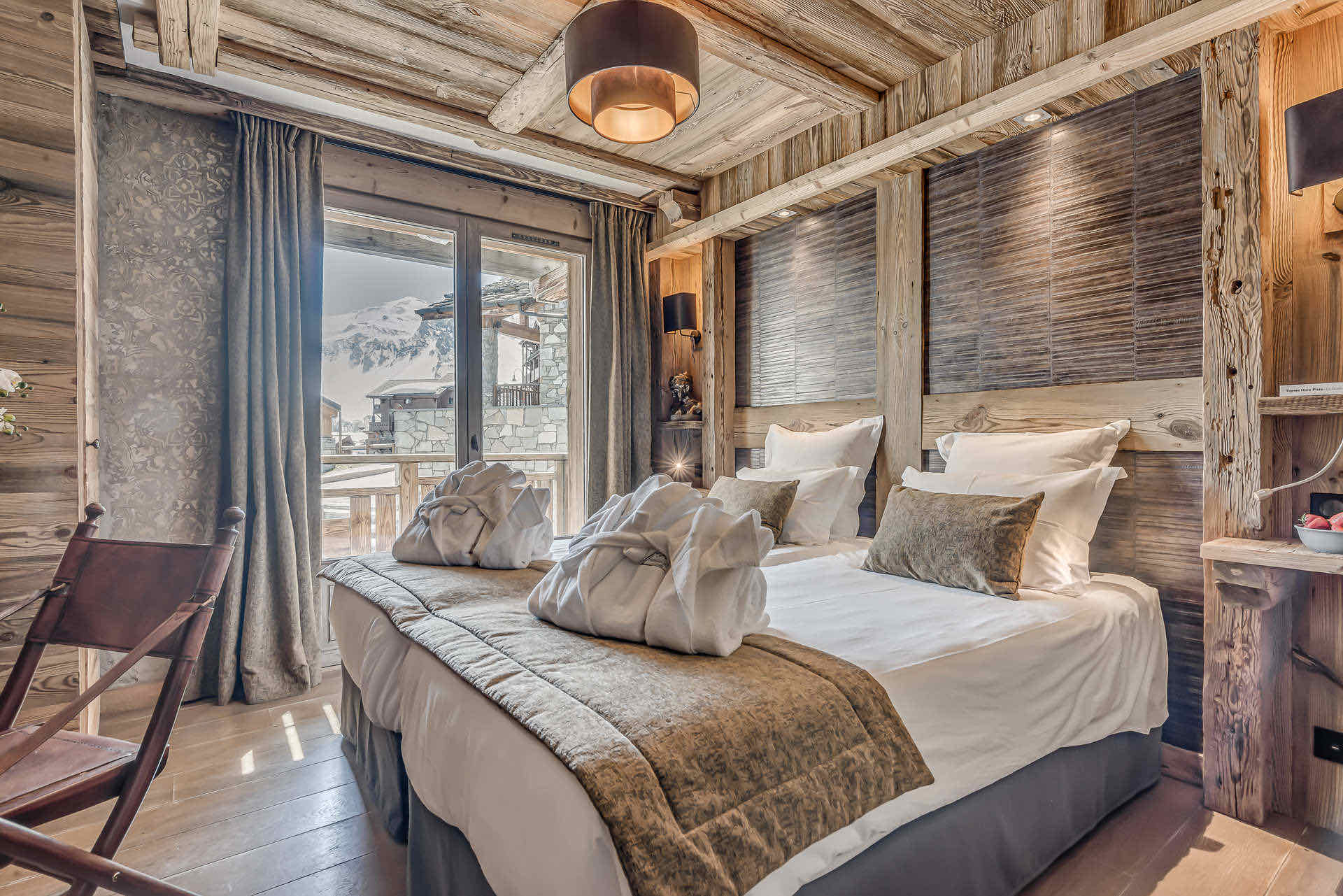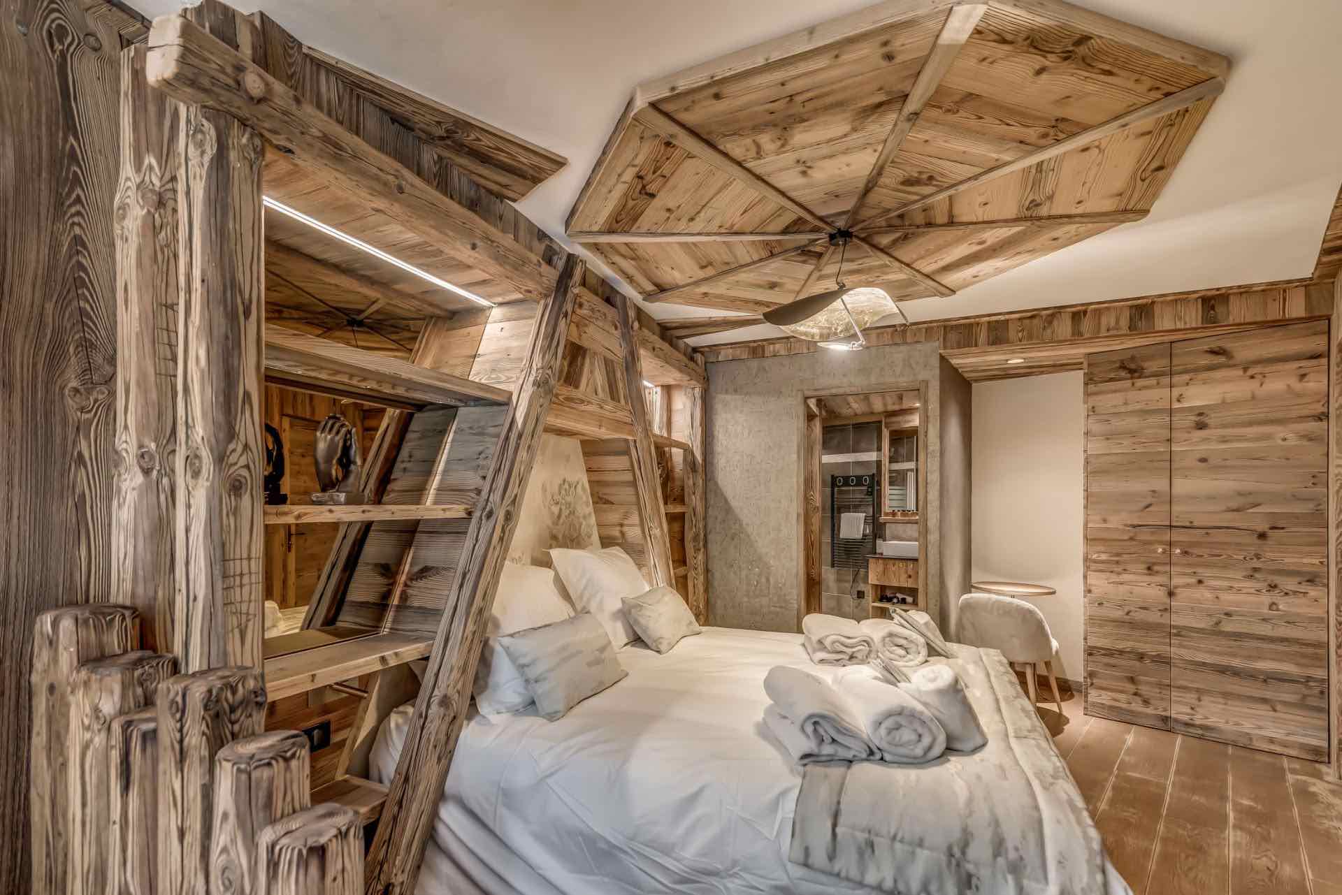 The chalet offers eight en-suite bedrooms across the first and second floors, comfortably sleeping up to 16 guests. Two master suites are complemented by six additional bedrooms, all adaptable as double or twin to suit different group needs. Many rooms open onto private balconies, and every en-suite is beautifully appointed with modern alpine finishes.