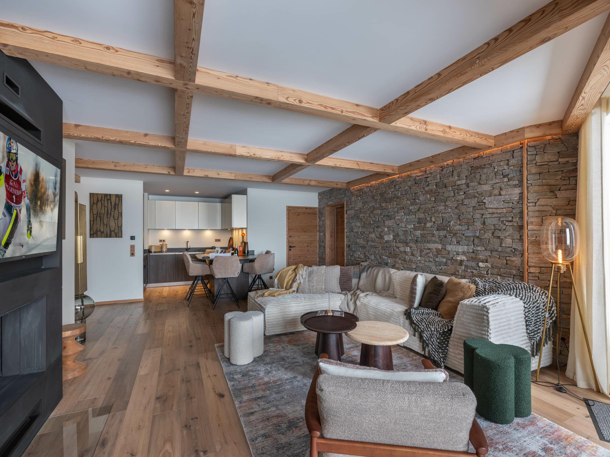 Located on the 5th floor, the Oro apartment comfortably accommodates up to six guests. It features two double bedrooms with en suite shower rooms, as well as a mountain cabin with bunk beds. The open-plan living area includes a fully equipped kitchen, dining space, and an inviting lounge with a corner fireplace. Contemporary design is subtly enhanced by traditional Alpine materials and a soft, neutral color palette, creating a warm and harmonious atmosphere. A spacious balcony opens onto breathtaking Alpine views.