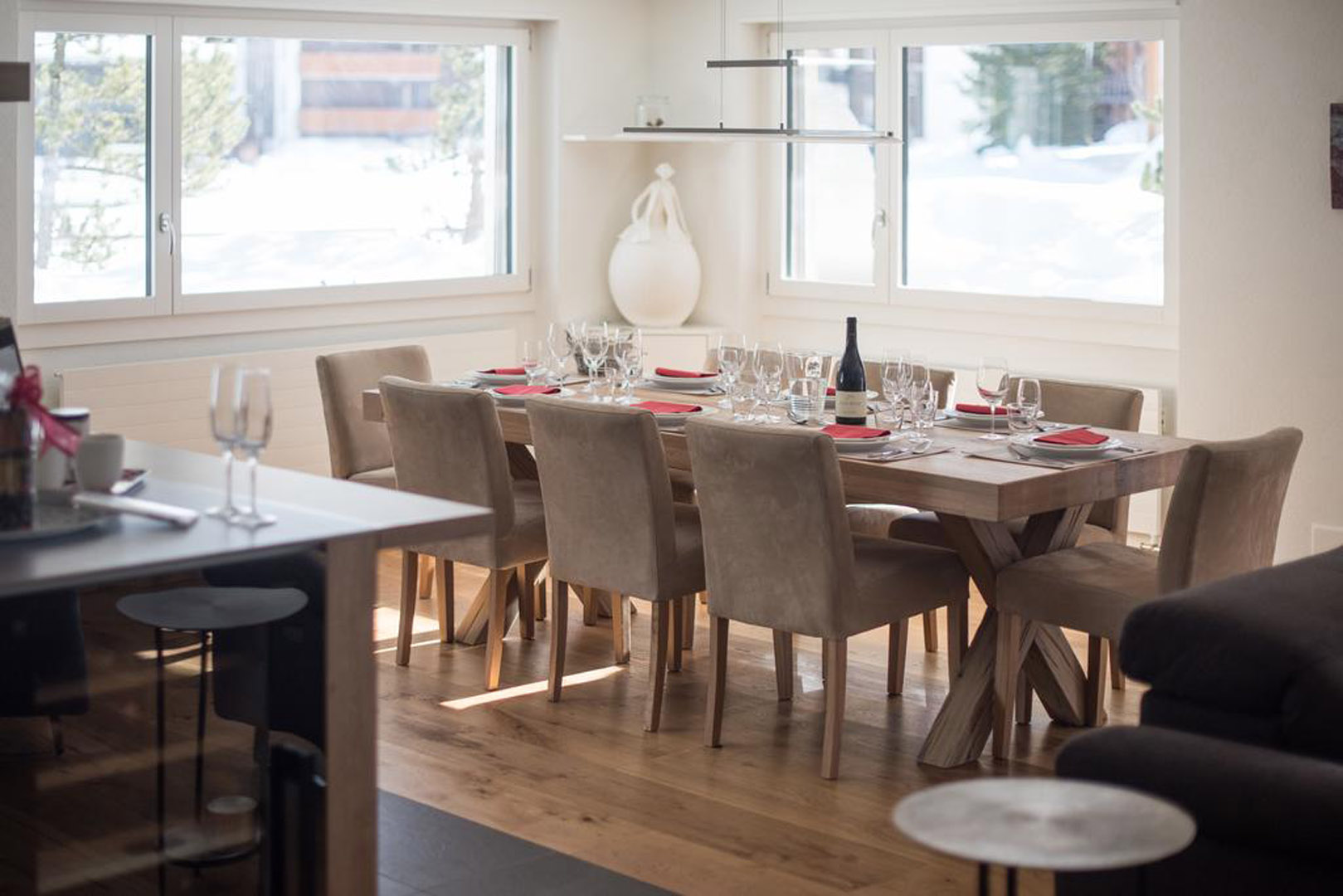 The living area features generously sized sofas arranged around a flat-screen TV, creating a welcoming space to relax after a day on the slopes. This flows seamlessly into the dining area, where a large table comfortably seats eight, and a sleek, well-equipped kitchen with central island makes cooking and entertaining a social affair.