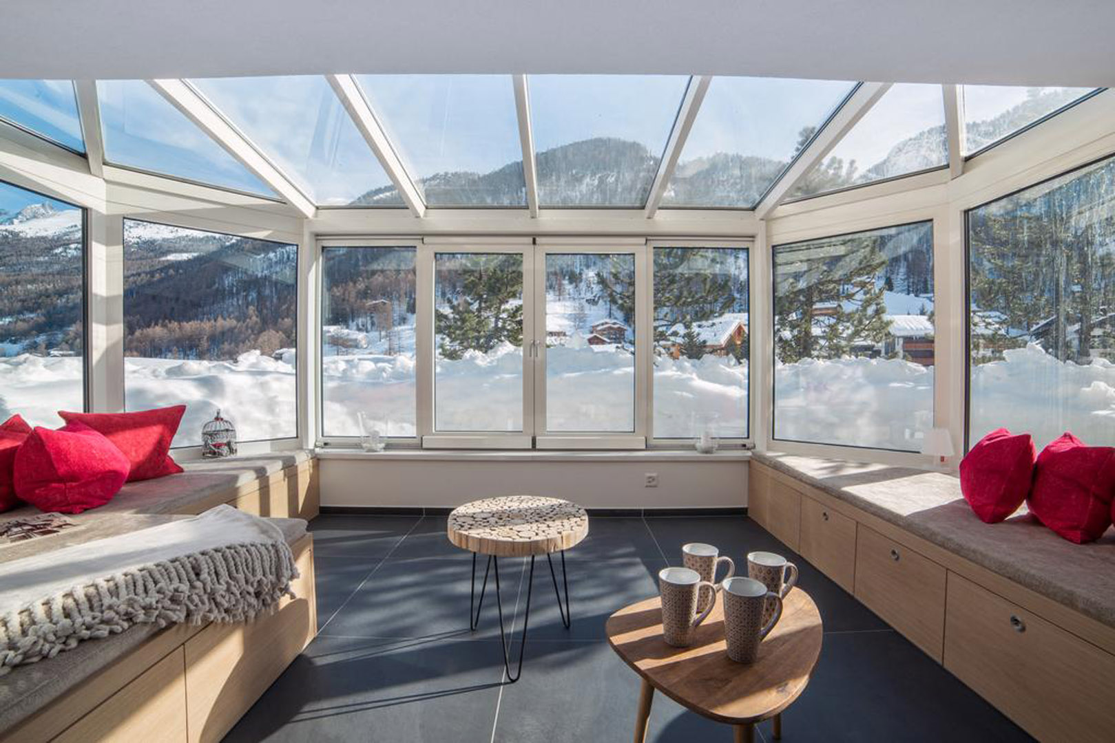 Accessed via a lift, the entrance level opens into a wonderfully bright and spacious open-plan living and dining area. Floor-to-ceiling windows flood the room with natural light and frame breathtaking 180-degree views of the surrounding mountains. The elegant winter garden—a glass-walled haven opposite the entry—invites you to bask in sunlit warmth while soaking in the panorama.