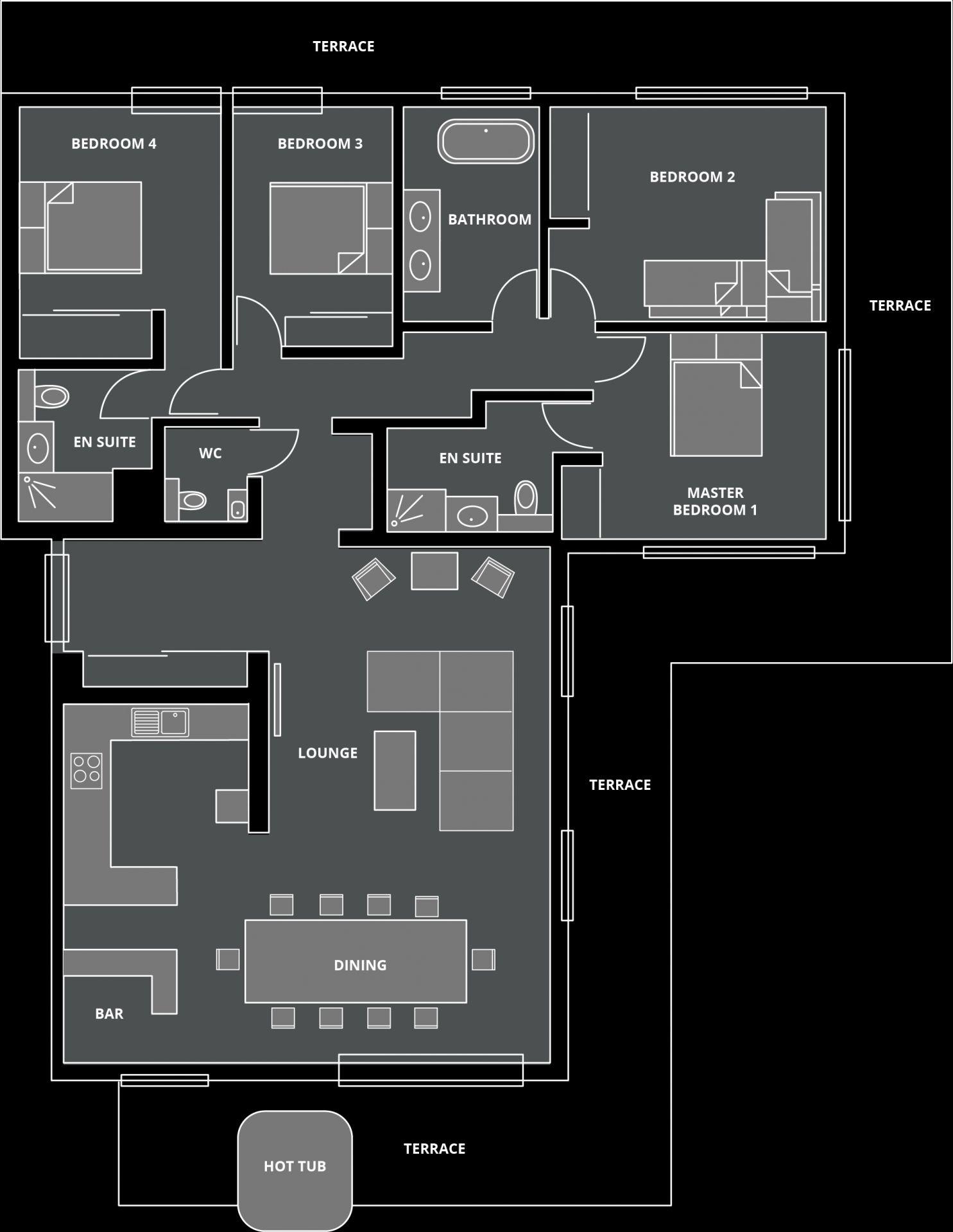 The apartment accommodates up to 6 adults across four inviting, alpine-inspired bedrooms. Each room enjoys shared balcony access with stunning views — perfect for morning coffee in the fresh mountain air. The sleeping arrangements include a master double and a second double bedroom, both with en-suite shower rooms. A third double bedroom shares a family bathroom with a bunk room that sleeps up to 4 children, making this apartment ideal for family holidays. For added flexibility, the double beds can be configured as twins upon request.