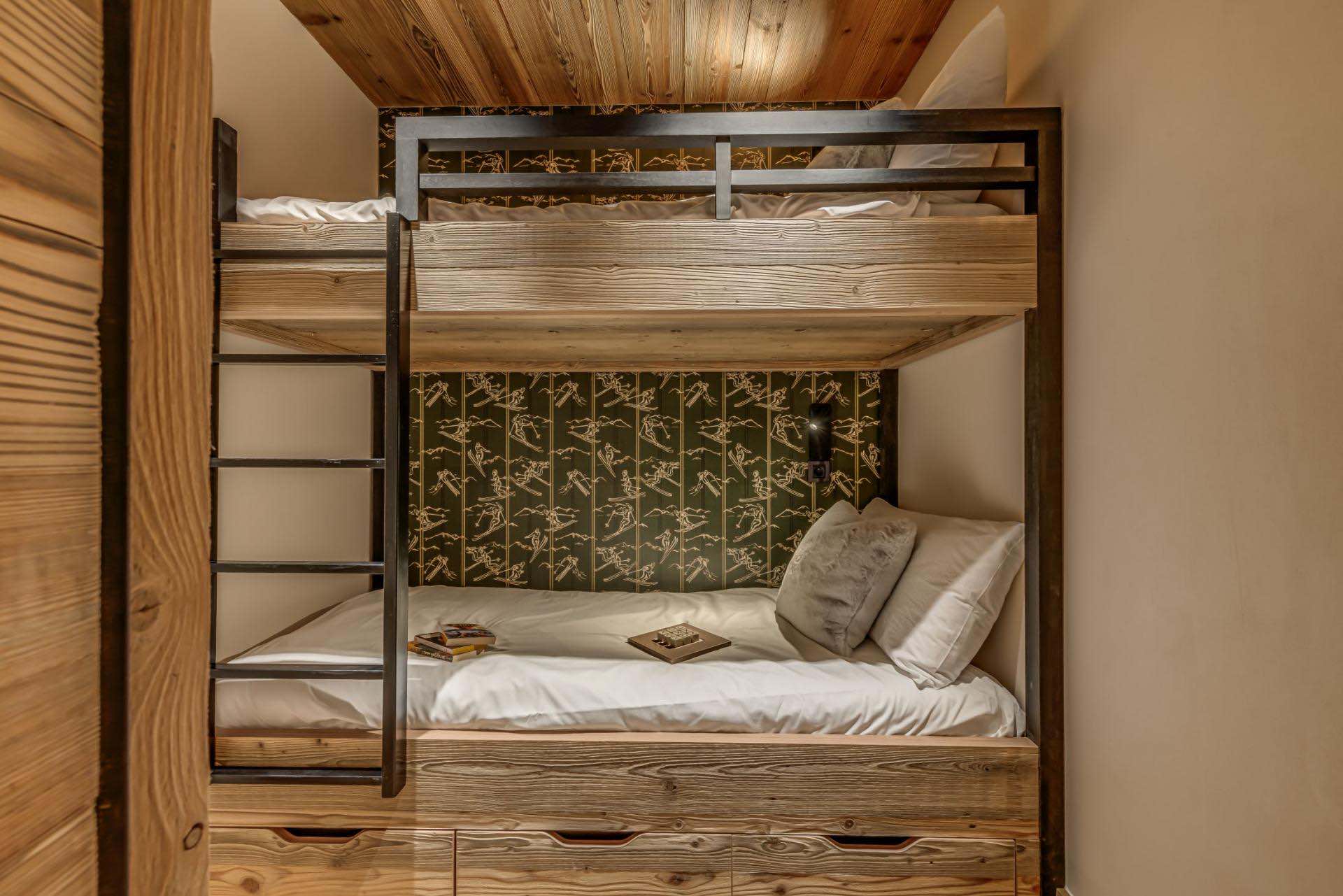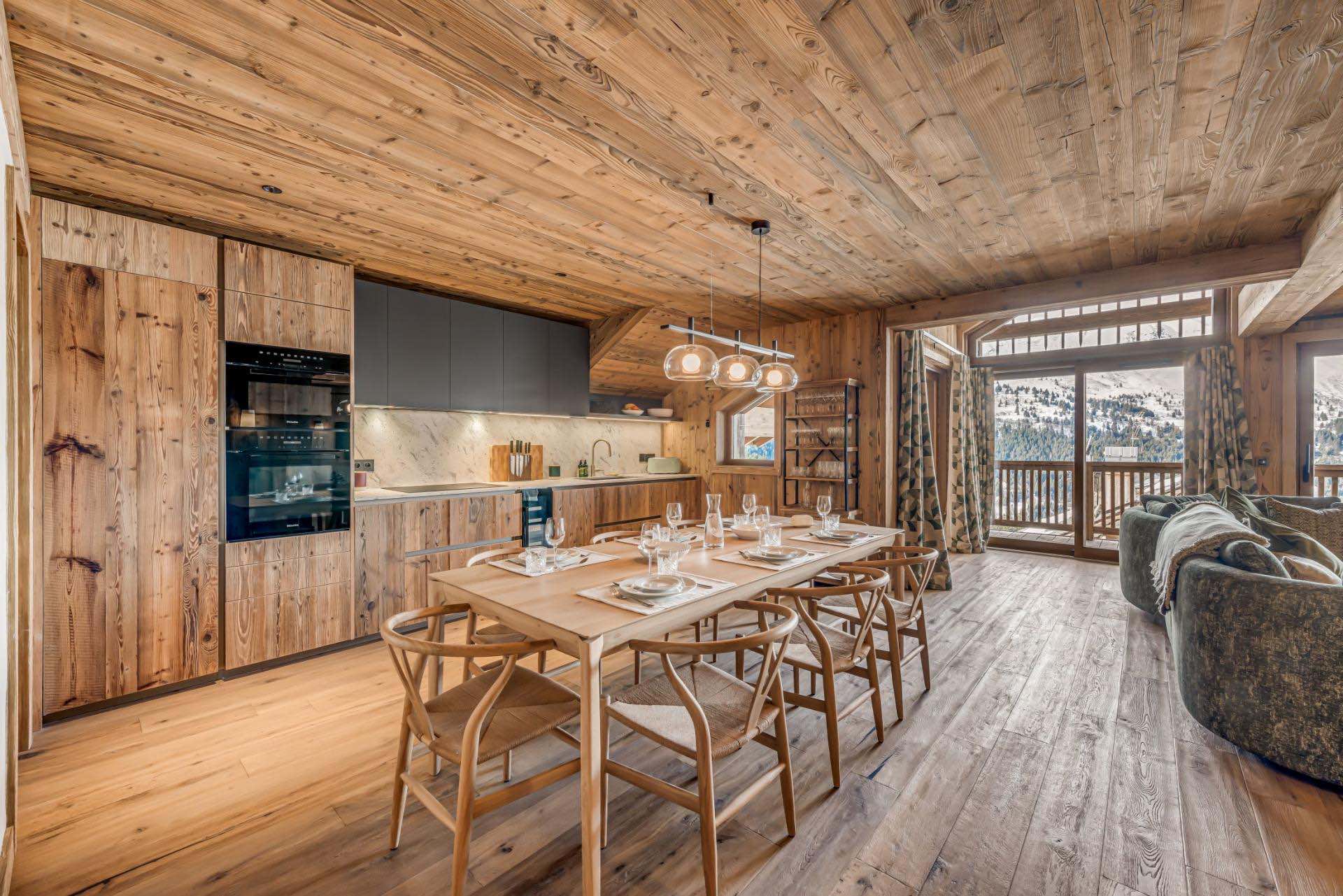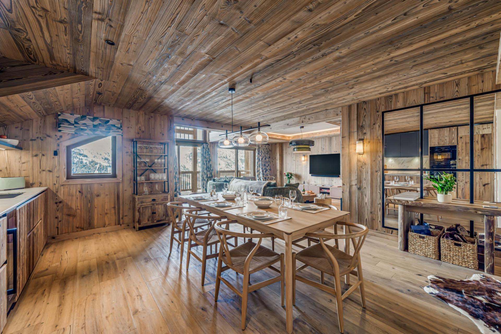 Sleeping up to six adults and two children, the property features three refined en-suite double bedrooms, alongside a cosy bunk room ideal for younger guests. The heart of the chalet is a spacious open-plan living and dining area, where soft neutral tones, modern finishes and natural light create a warm and inviting atmosphere. Large doors open onto a private balcony and terrace, perfect for soaking up panoramic views of the surrounding peaks.