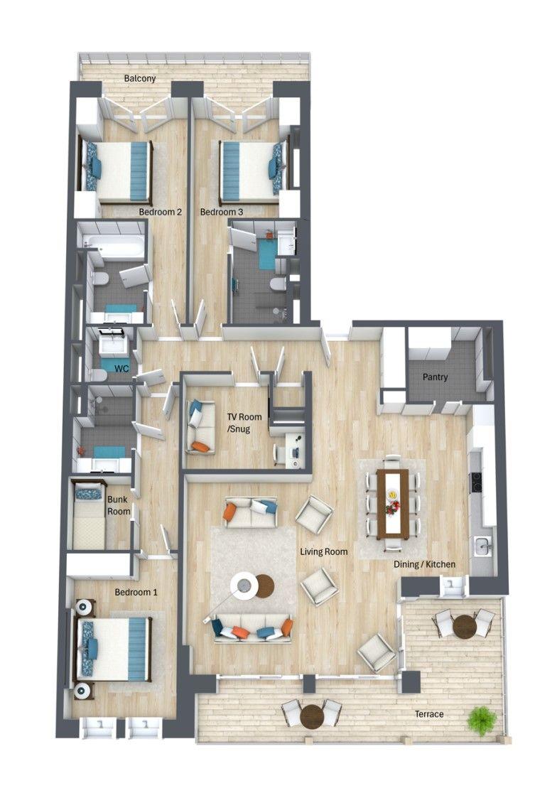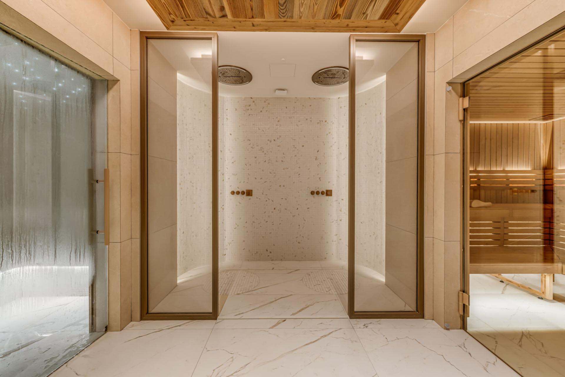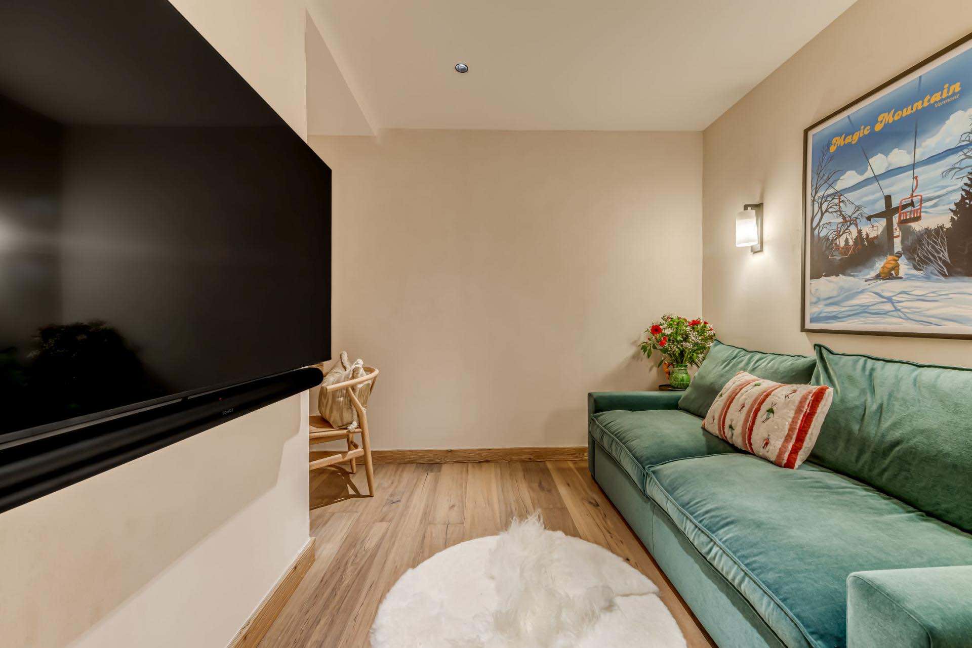 A fully equipped kitchen flows seamlessly into the dining space, while a separate TV snug provides a relaxed retreat after a day on the slopes. Guests also benefit from access to the residence’s shared spa and gym facilities, as well as a private ski room and underground parking.