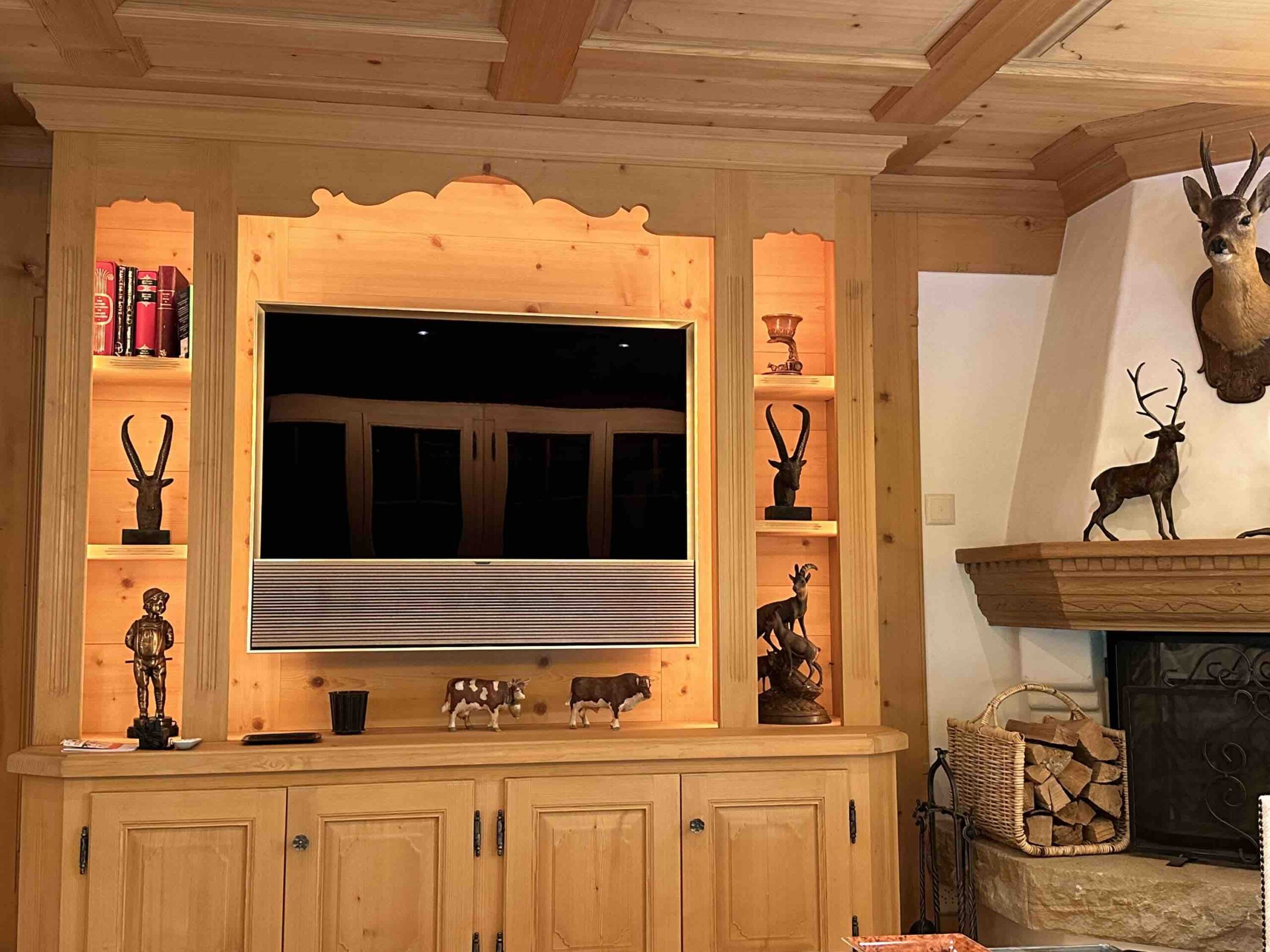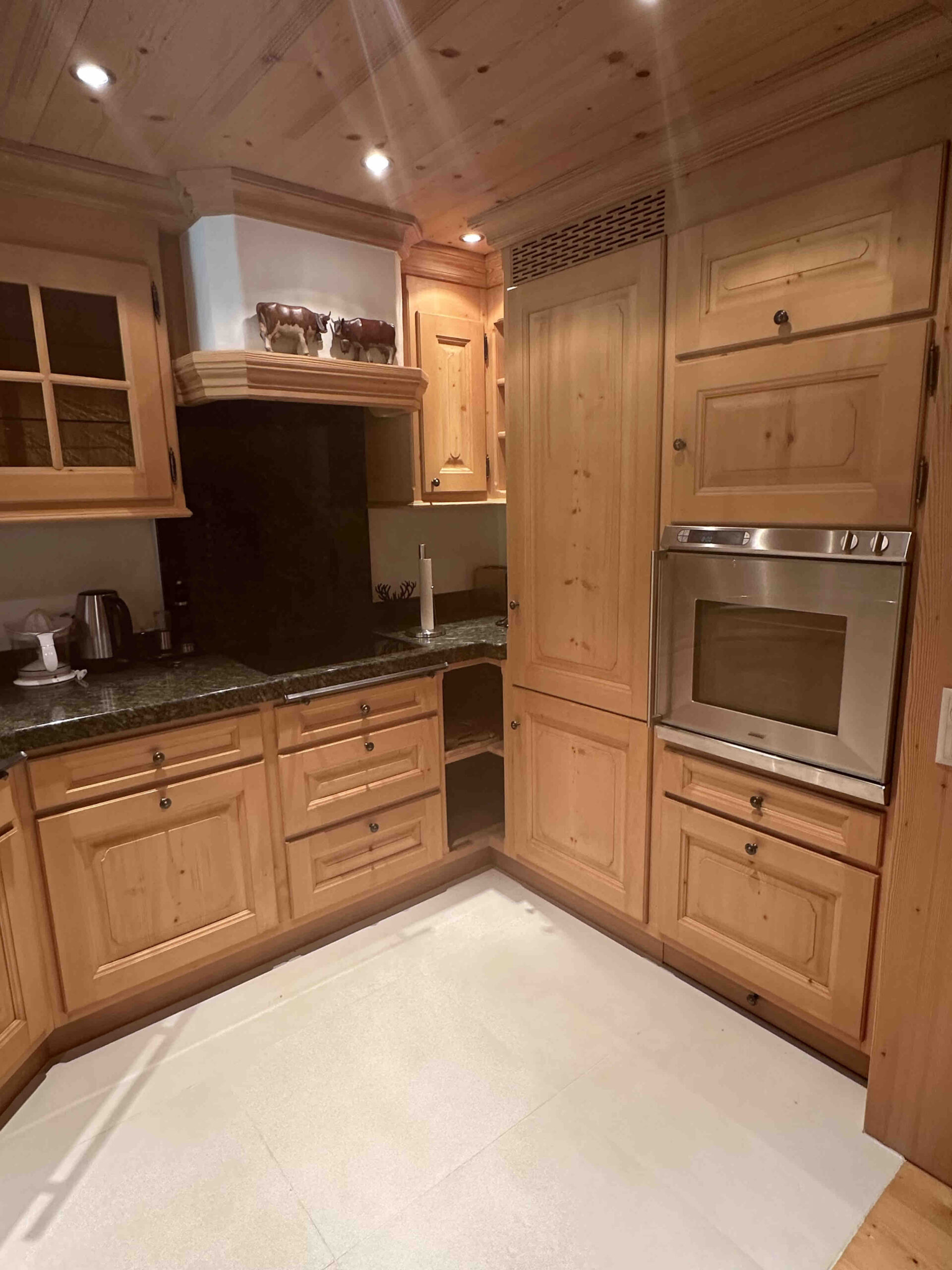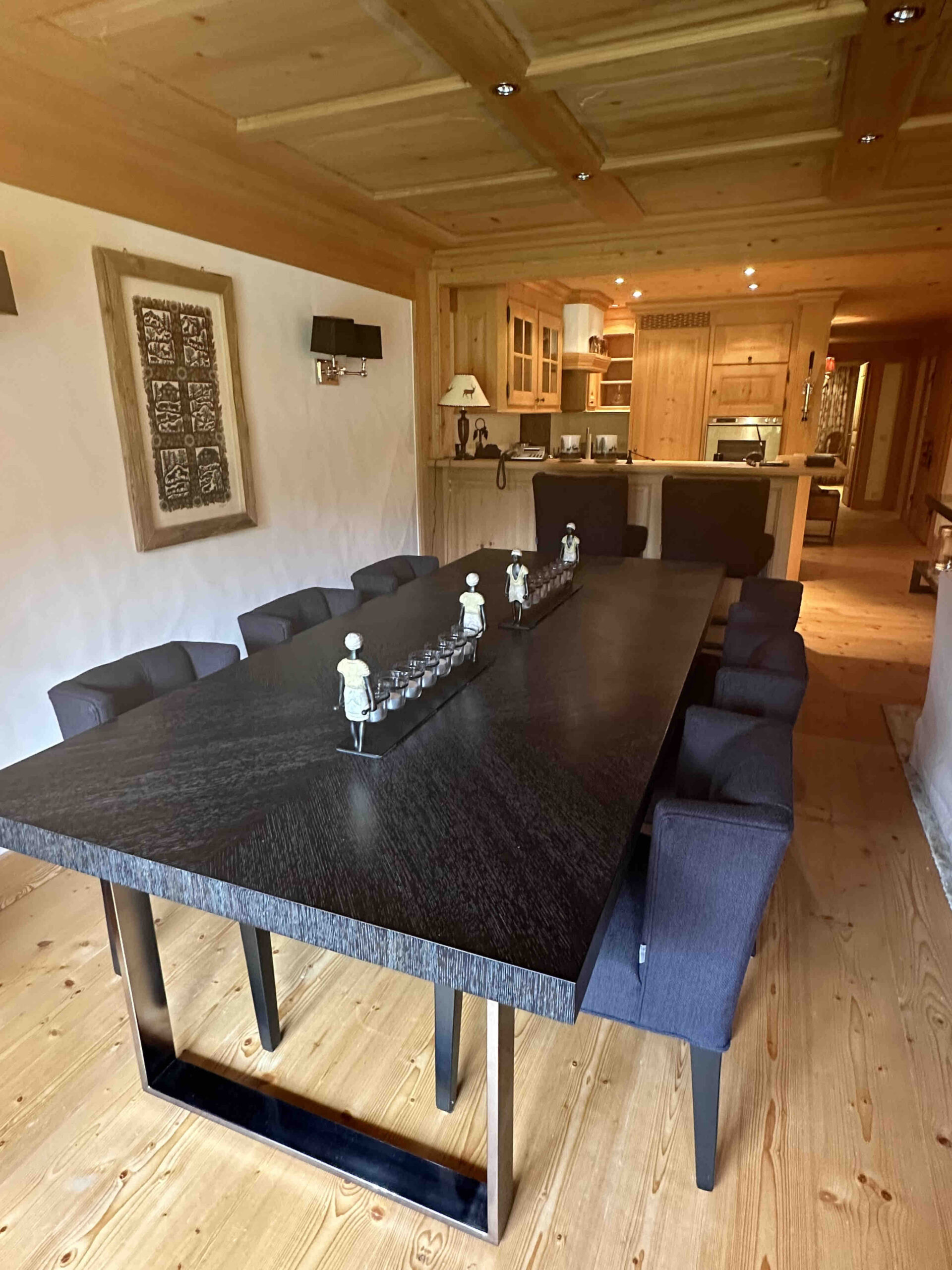 The open-plan living area provides generous seating and a flat-screen TV, seamlessly connecting to a fully equipped modern kitchen with top-of-the-line appliances. High-speed Wi-Fi is available throughout the residence, along with fresh linens, designer bedding, and hotel-quality towels. For longer stays, the flat includes an in-unit washer and dryer, as well as access to a dedicated ski room for secure and organized storage of winter equipment.