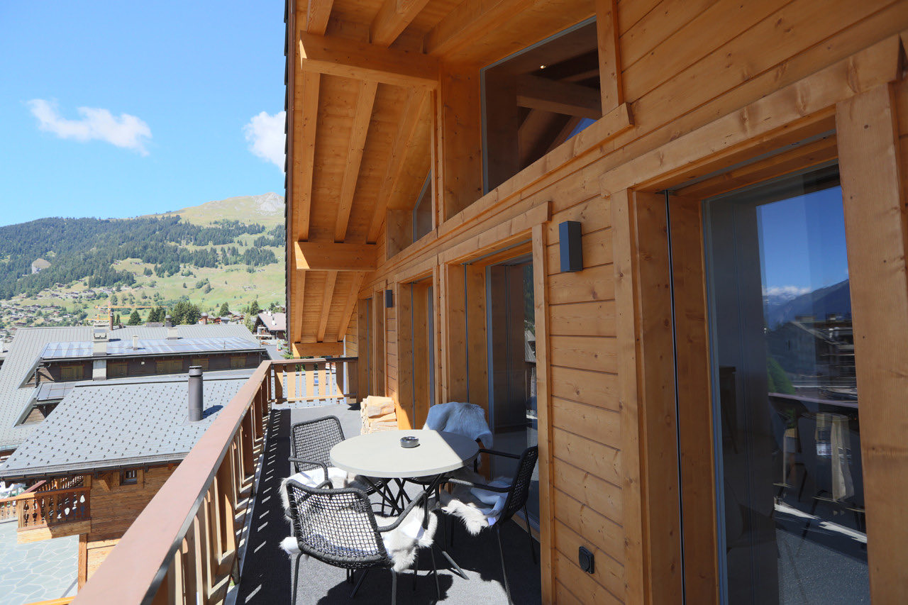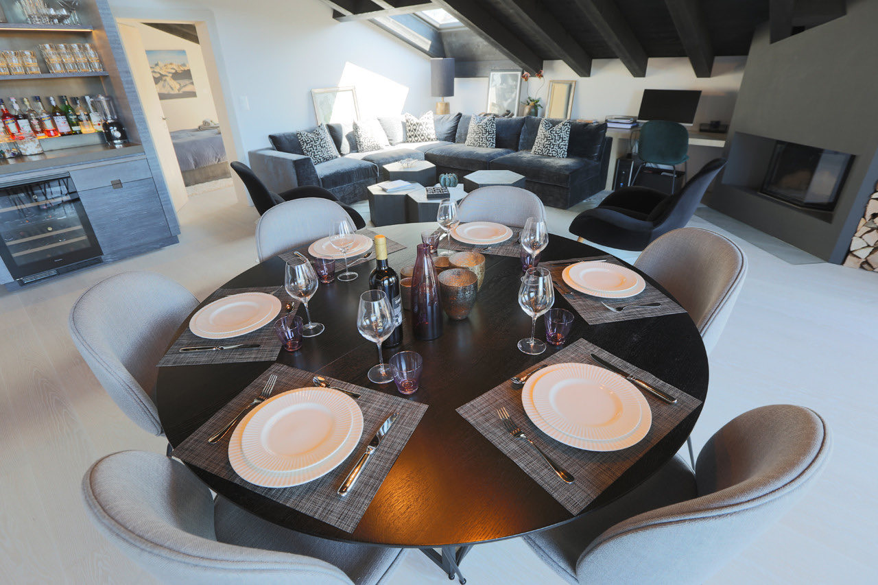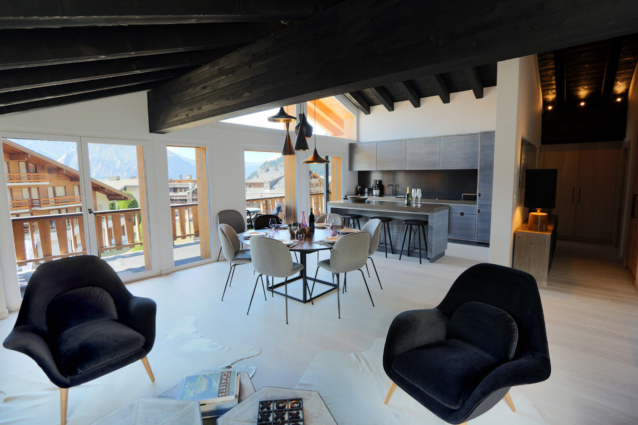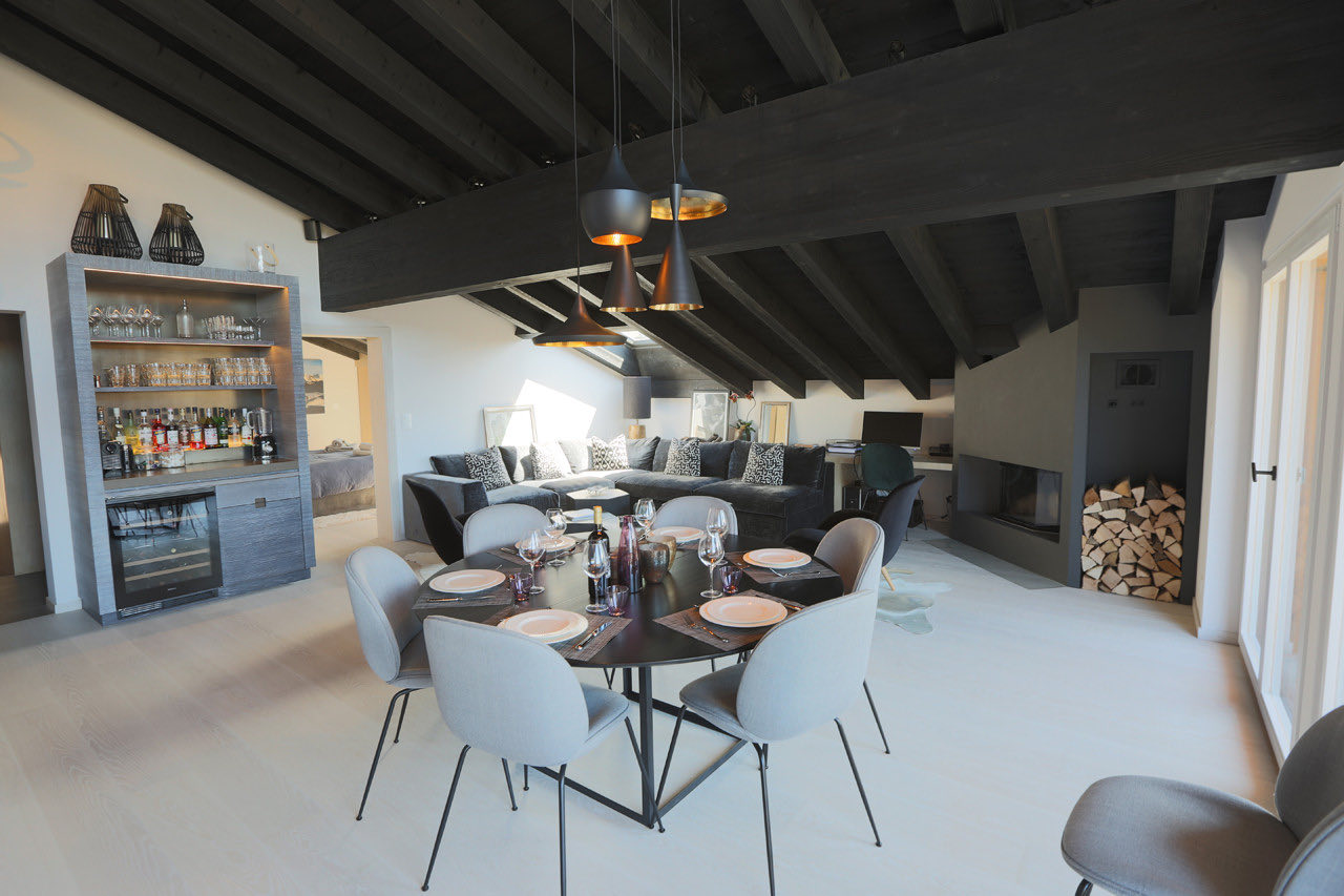 Apartment Plein is a modern and elegantly designed apartment, ideally located in the very center of Verbier. Fully renovated with a stylish, contemporary touch, it offers a bright and spacious open-plan living and dining area with a welcoming fireplace. The adjoining kitchen is fully equipped with all the essentials, while floor-to-ceiling windows lead out to a sun-drenched south-facing balcony.