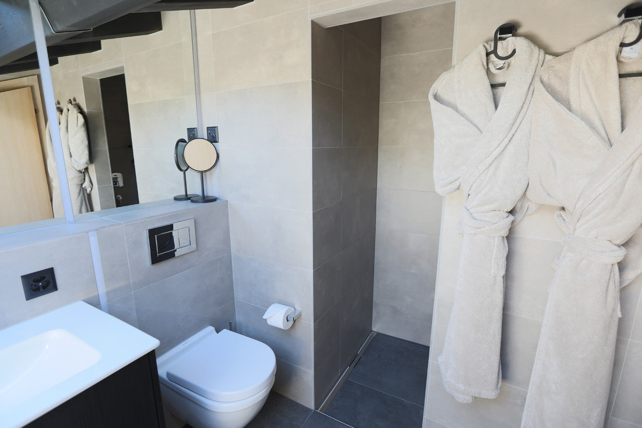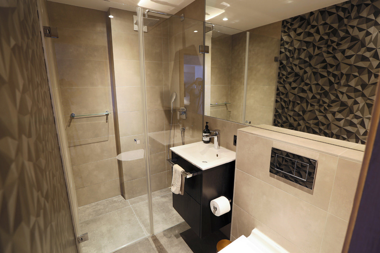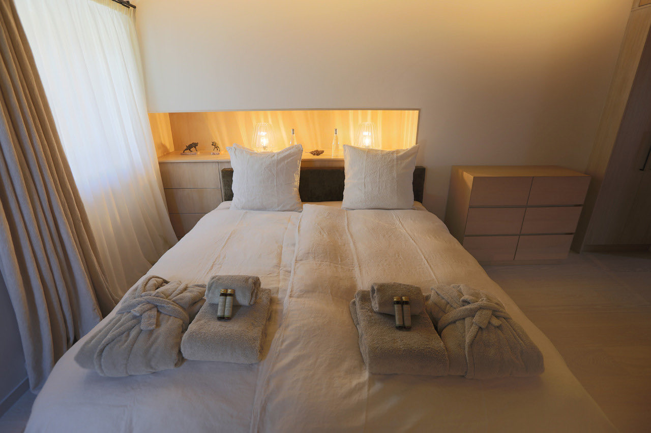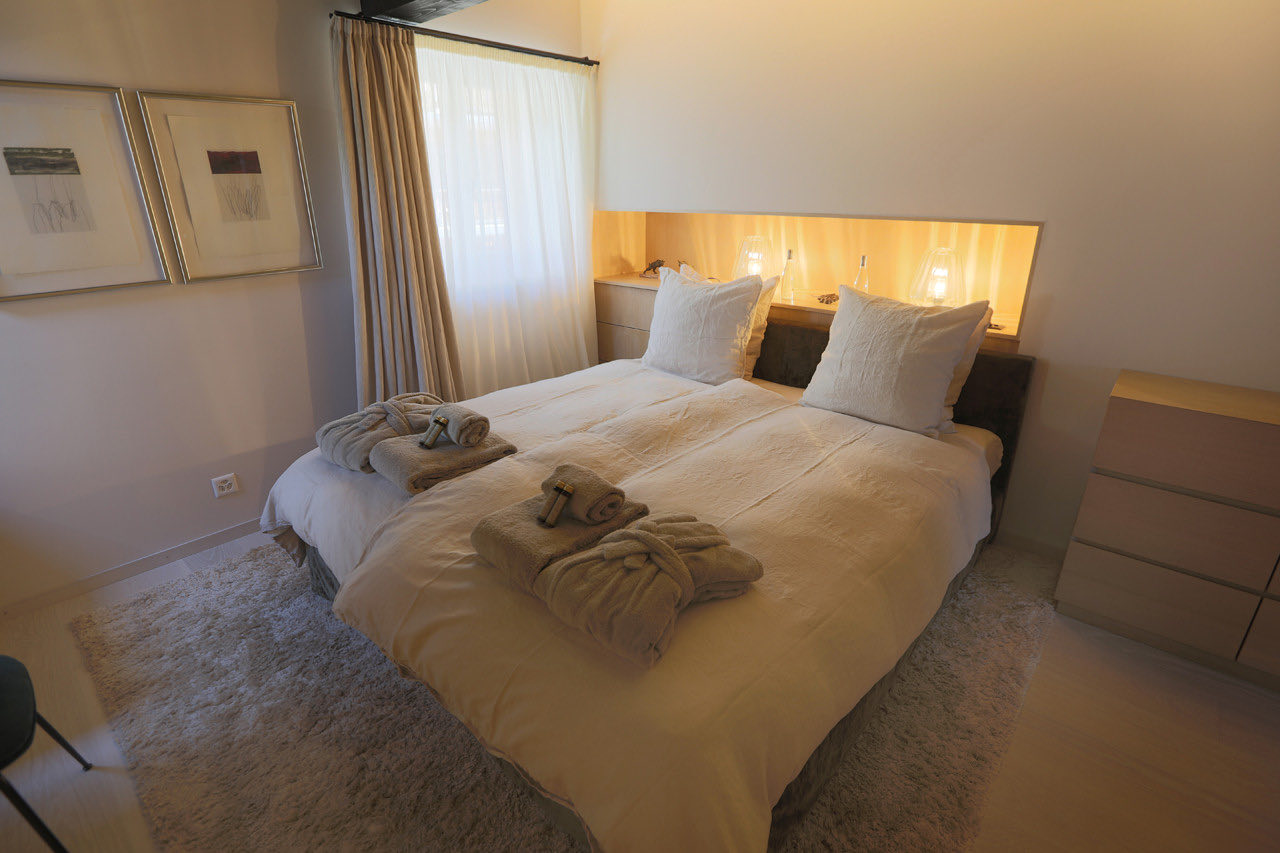 Spread across a single level, the apartment comfortably sleeps up to six guests, plus one child, in three beautifully appointed bedrooms, each with its own bathroom. The master suite includes a double bed, a flat-screen TV, a luxurious en-suite bathroom with bath, shower and toilet, and direct access to the balcony. The second bedroom features a double bed and a private en-suite with bath, shower and toilet. The third bedroom is designed for families, with a double bed and a child’s single bed, along with an en-suite bathroom featuring a small bathtub and toilet. An additional shower room with toilet is also available for guests’ convenience.