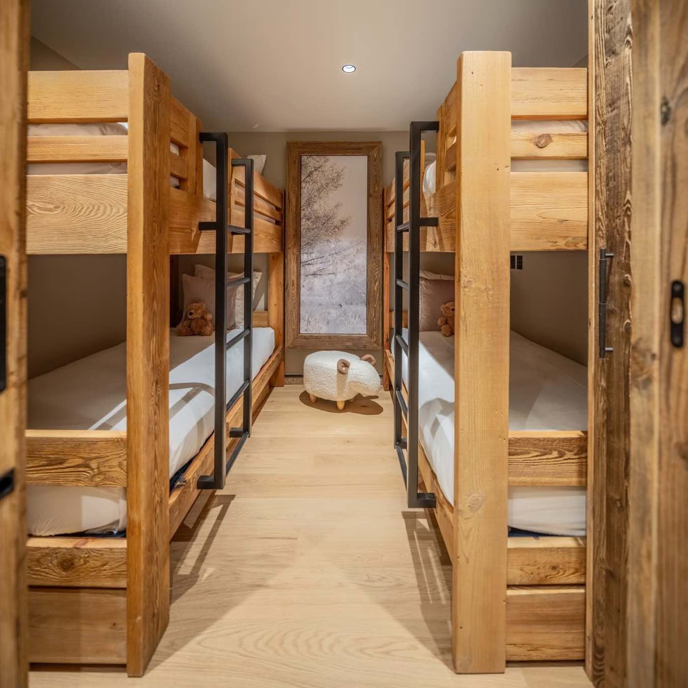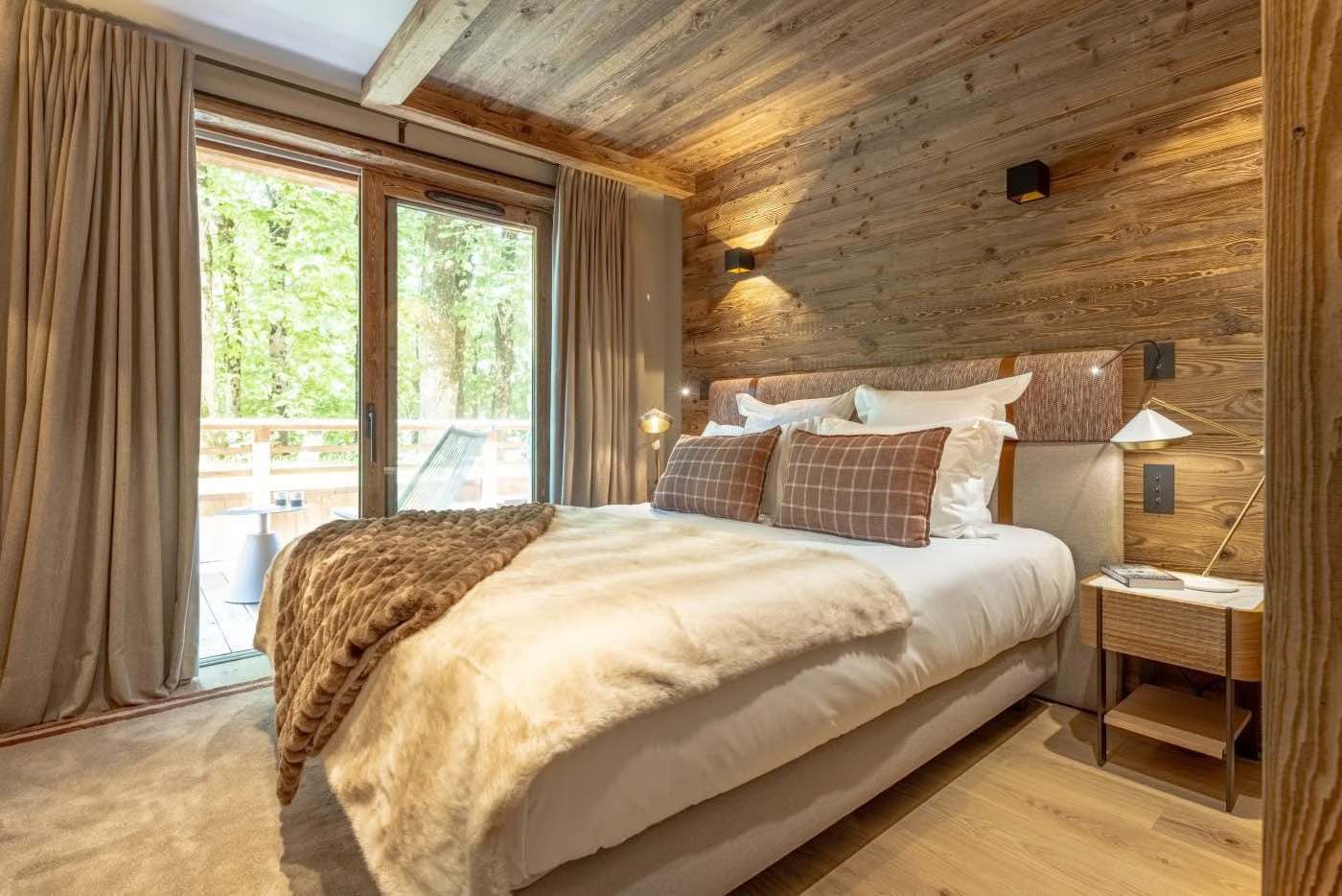 Three of the bedrooms are located within this wing. A charming children’s bedroom with two sets of bunk beds provides an ideal space for younger guests. This is followed by a large double bedroom, which can be configured as a twin, complete with an en-suite shower room, TV, desk area, and balcony access. Adjacent is another generous double bedroom with an en-suite bathroom featuring both a bath and shower, a TV, and access to the same balcony. Framed by greenery, the balcony offers privacy and tranquil views towards the Méribel ski area. Throughout the apartment, warm wood cladding preserves a traditional alpine atmosphere, complemented by modern and elegant interiors.