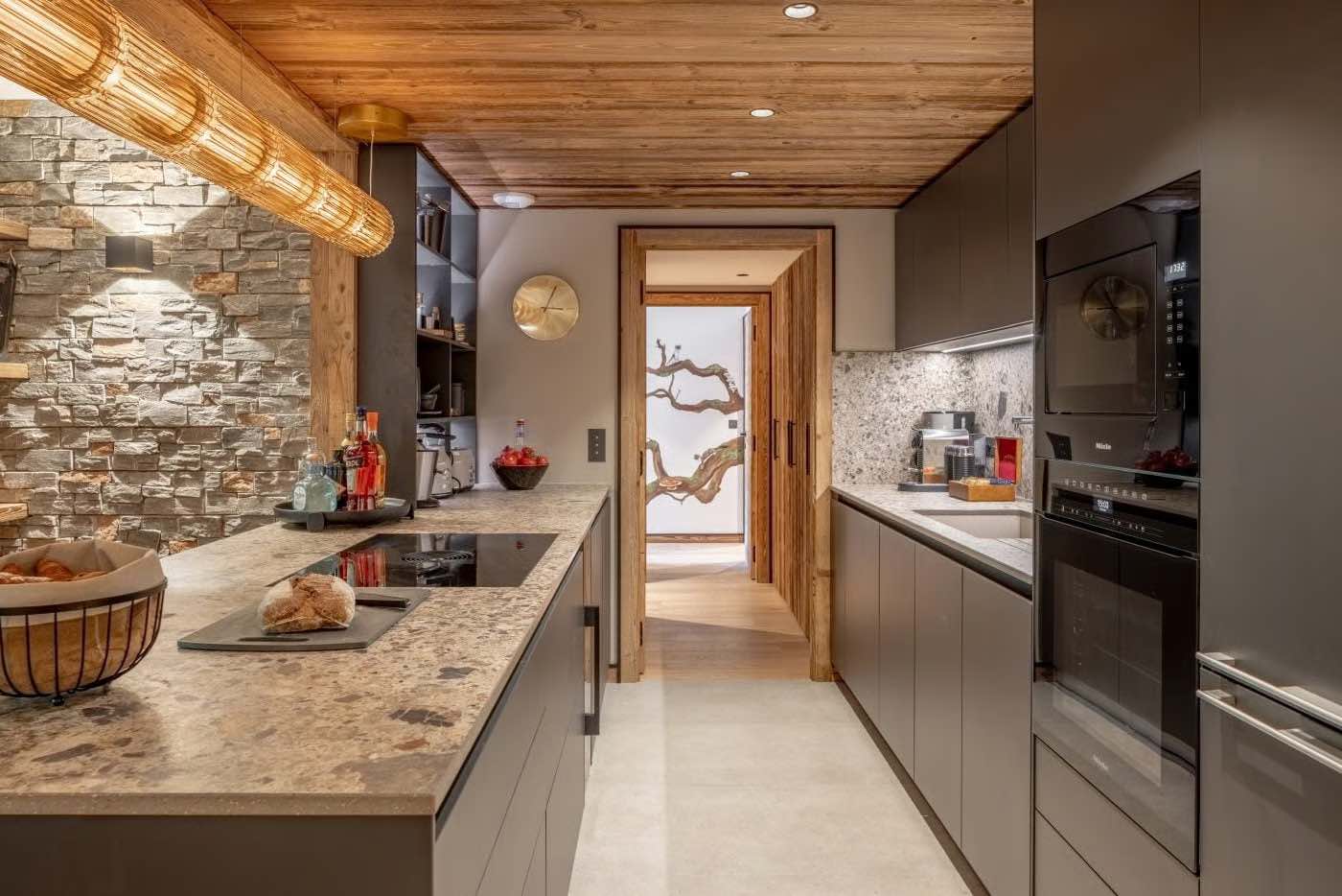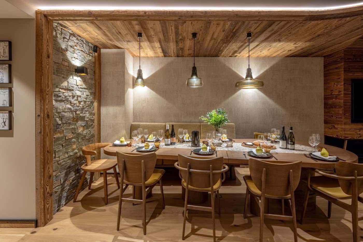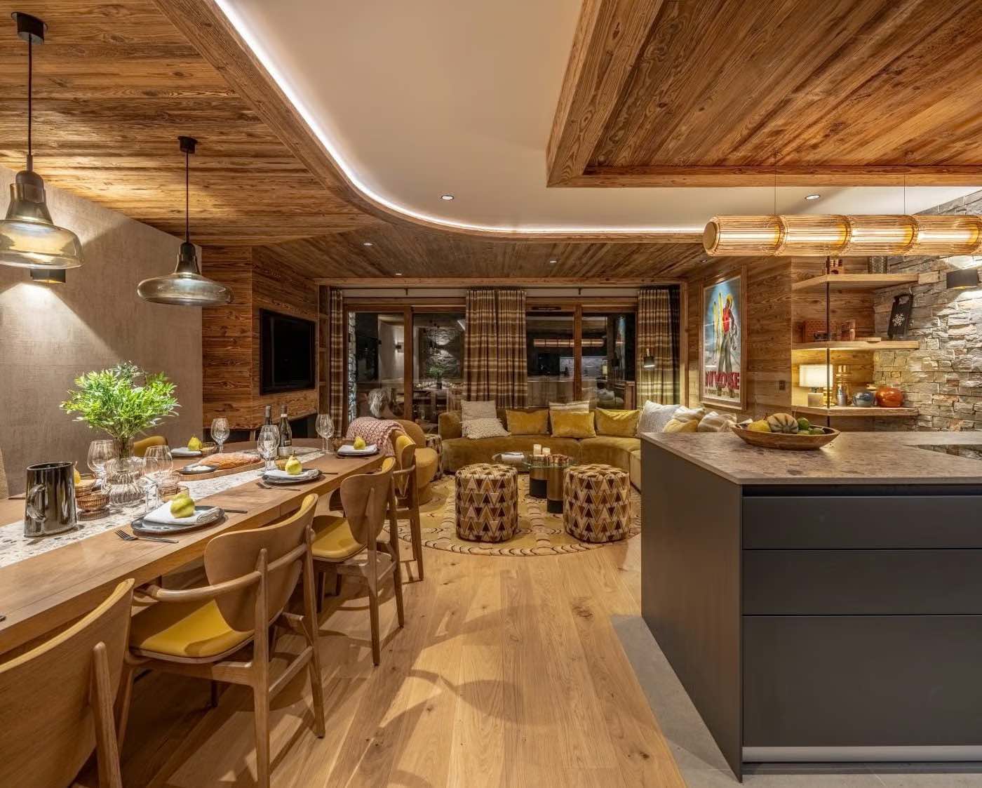 At the heart of the home lies the open-plan living, dining, and kitchen area, a welcoming space designed for gathering and unwinding. The beautifully decorated living area is perfect for relaxing after a day on the slopes, with a contemporary gas fireplace adding warmth and ambience. The modern kitchen, centred around a spacious island, is fully equipped for everything from leisurely breakfasts to indulgent evening meals. Floor-to-ceiling French doors flood the space with natural light and open onto the balcony, where the sheltered Nordic bath awaits, an inviting spot for après-ski relaxation while enjoying privacy and mountain surroundings.