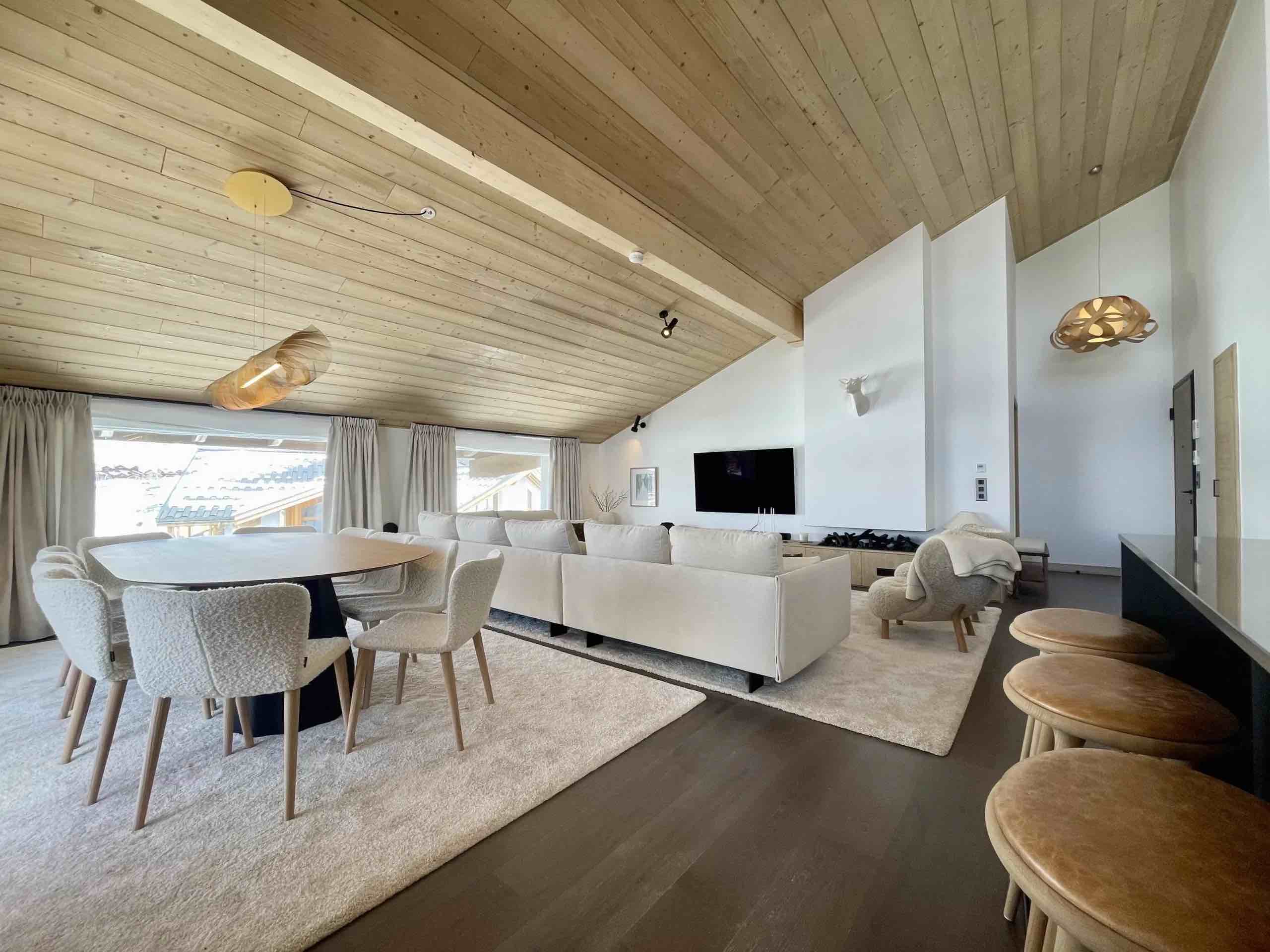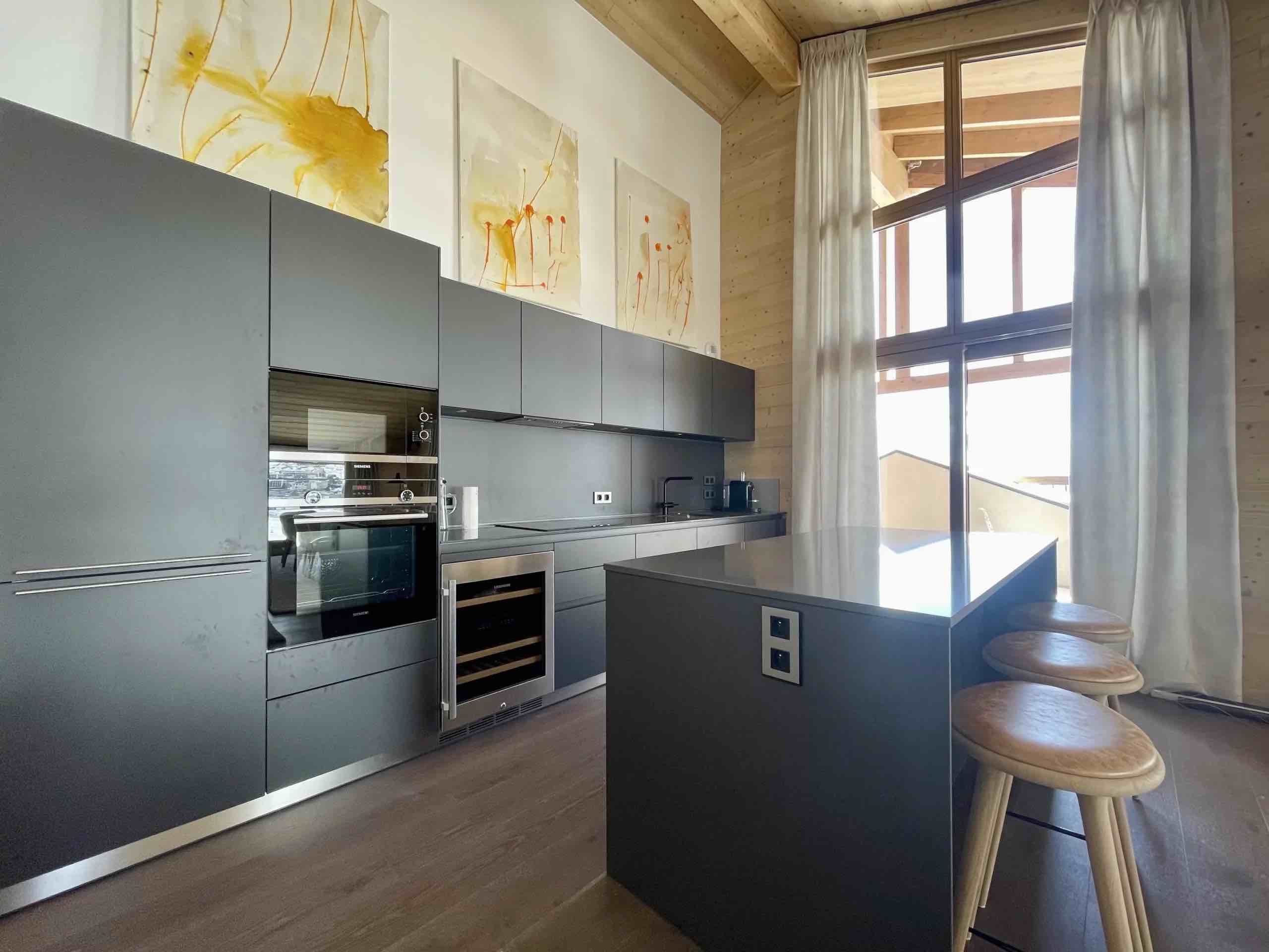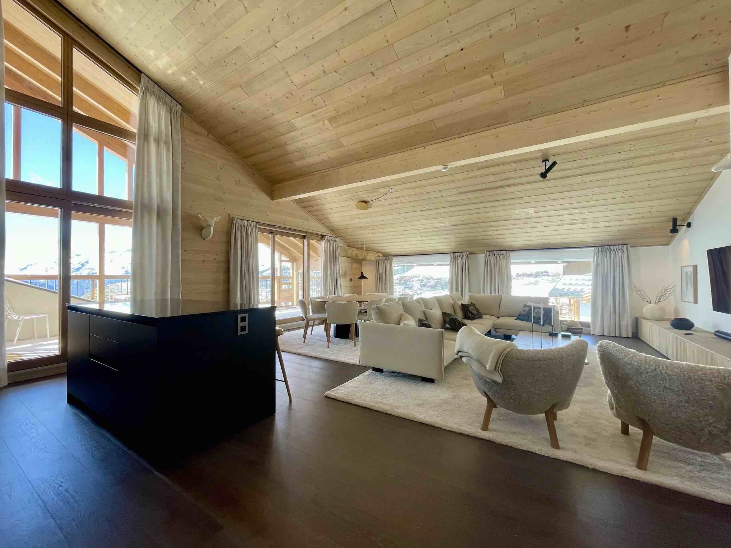 Large openings lead onto a generous sun-drenched terrace where breathtaking panoramic views stretch across the surrounding peaks and the resort below, providing the perfect setting for morning coffee in the crisp alpine air or relaxed evenings as the sun sets over the snow-covered landscape. The fully equipped modern kitchen features high-end appliances and premium finishes, seamlessly connecting to the dining area to create an elegant space for shared meals and memorable gatherings.