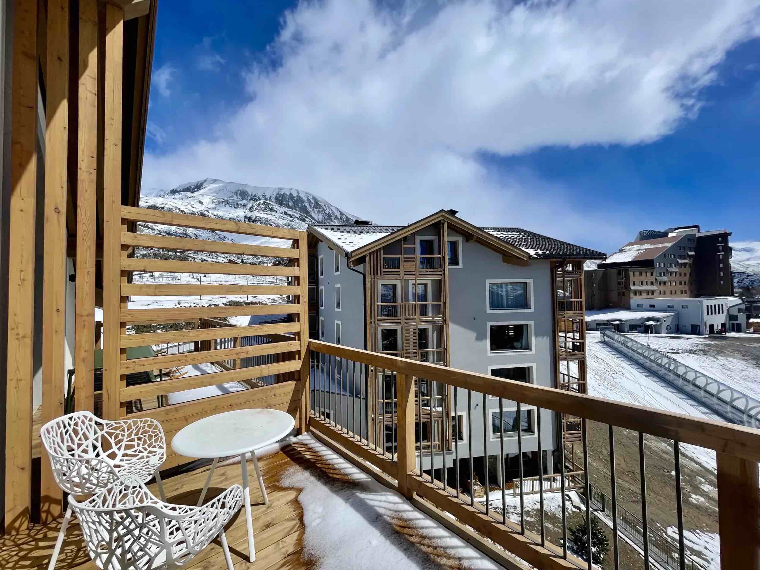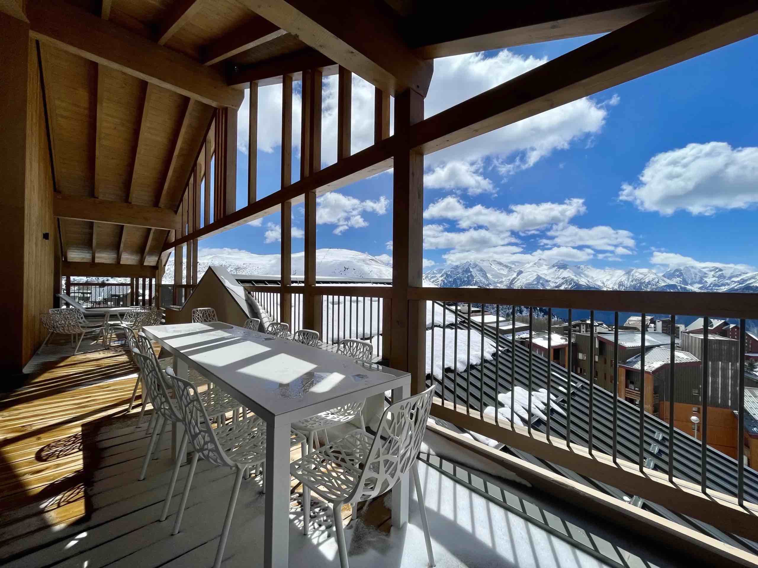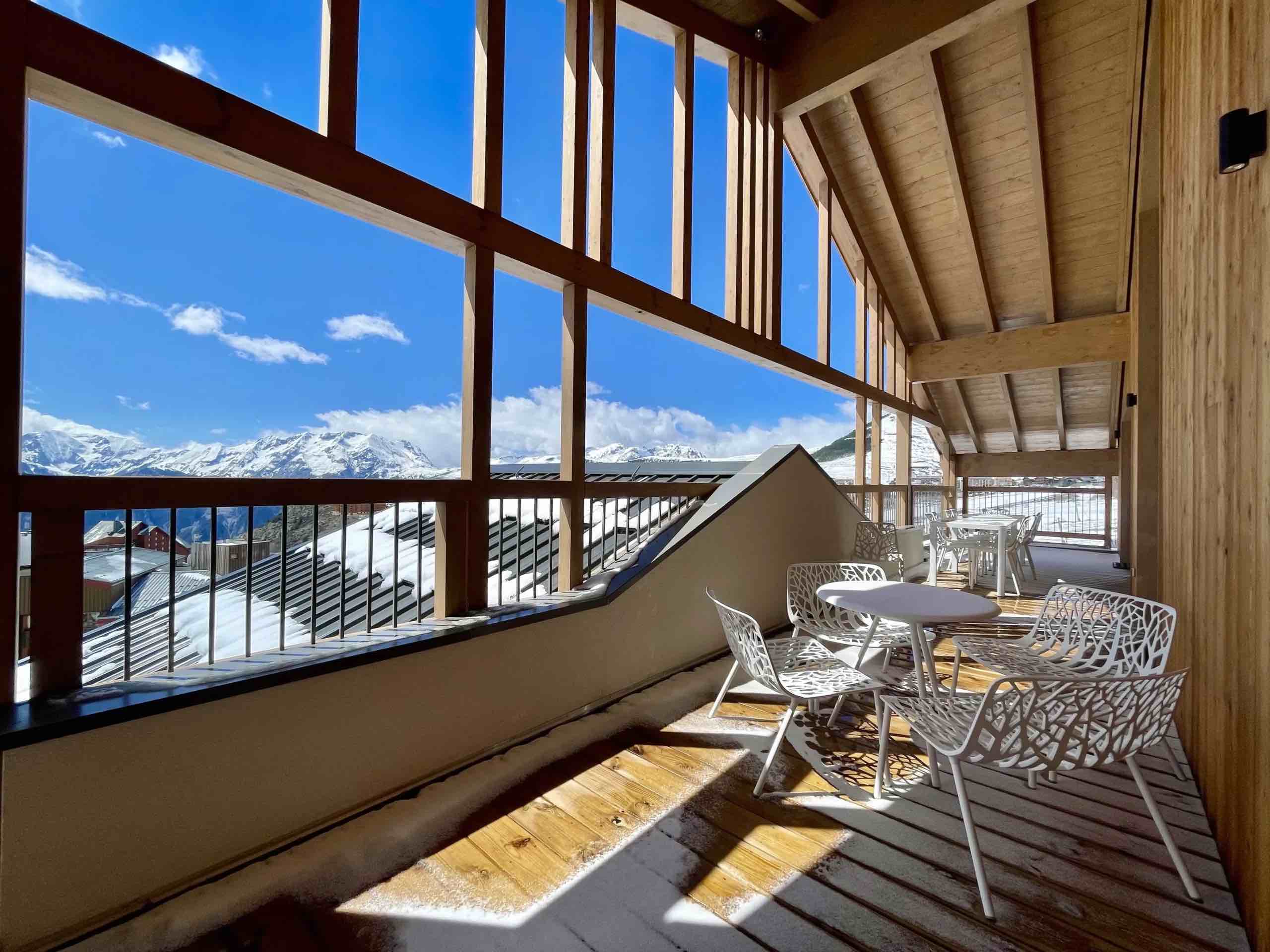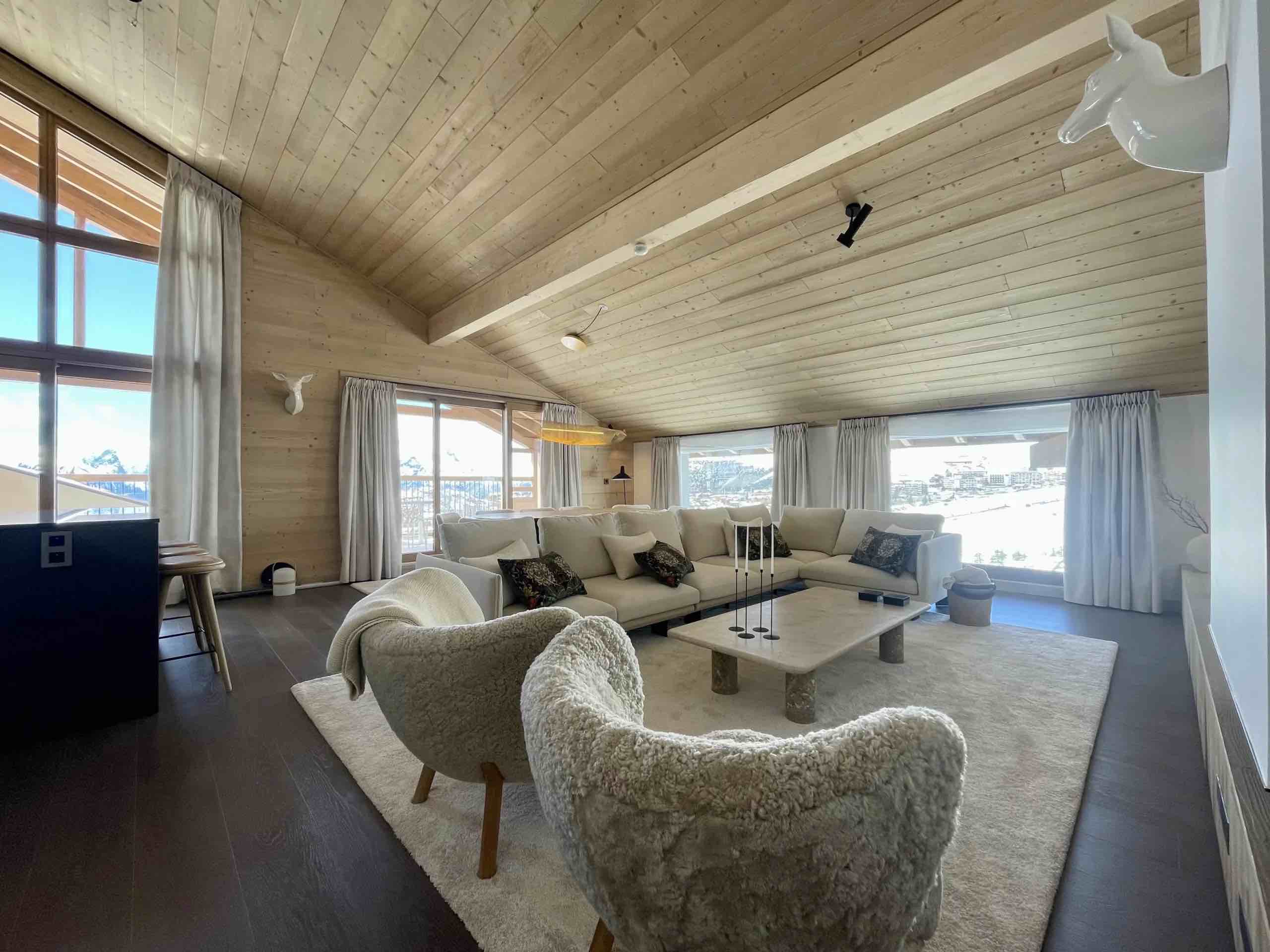 Large openings lead onto a generous sun-drenched terrace where breathtaking panoramic views stretch across the surrounding peaks and the resort below, providing the perfect setting for morning coffee in the crisp alpine air or relaxed evenings as the sun sets over the snow-covered landscape. The fully equipped modern kitchen features high-end appliances and premium finishes, seamlessly connecting to the dining area to create an elegant space for shared meals and memorable gatherings.