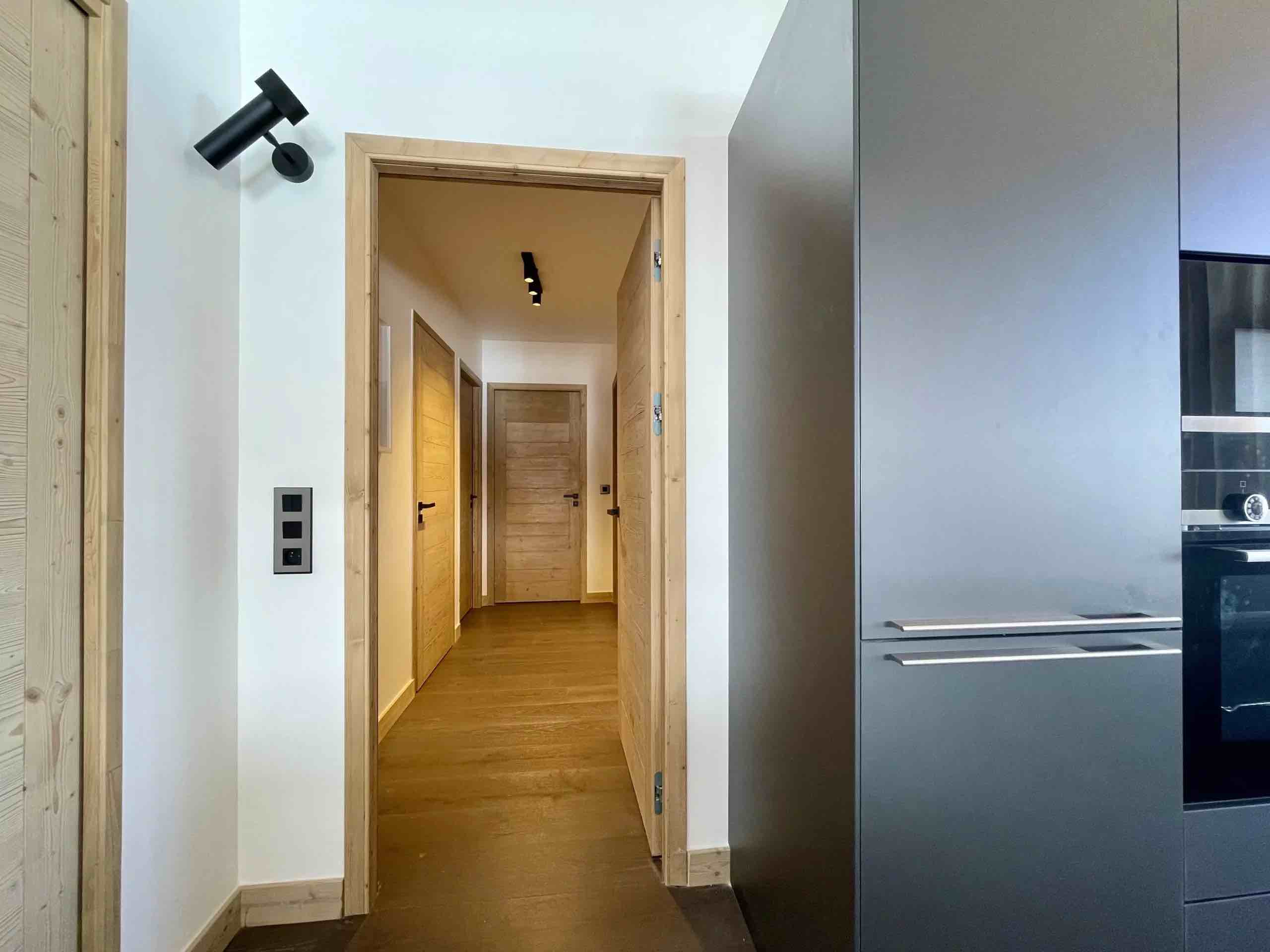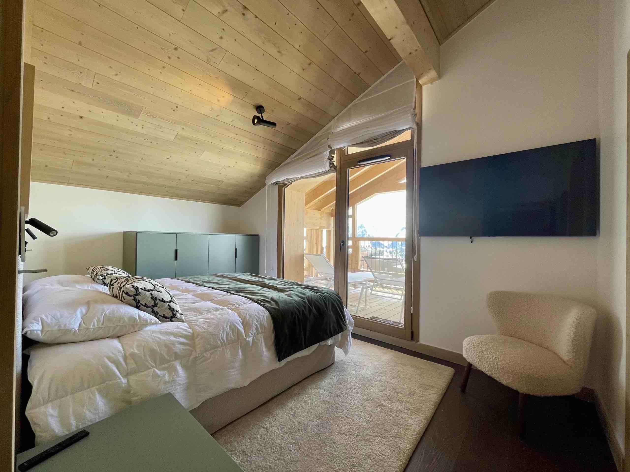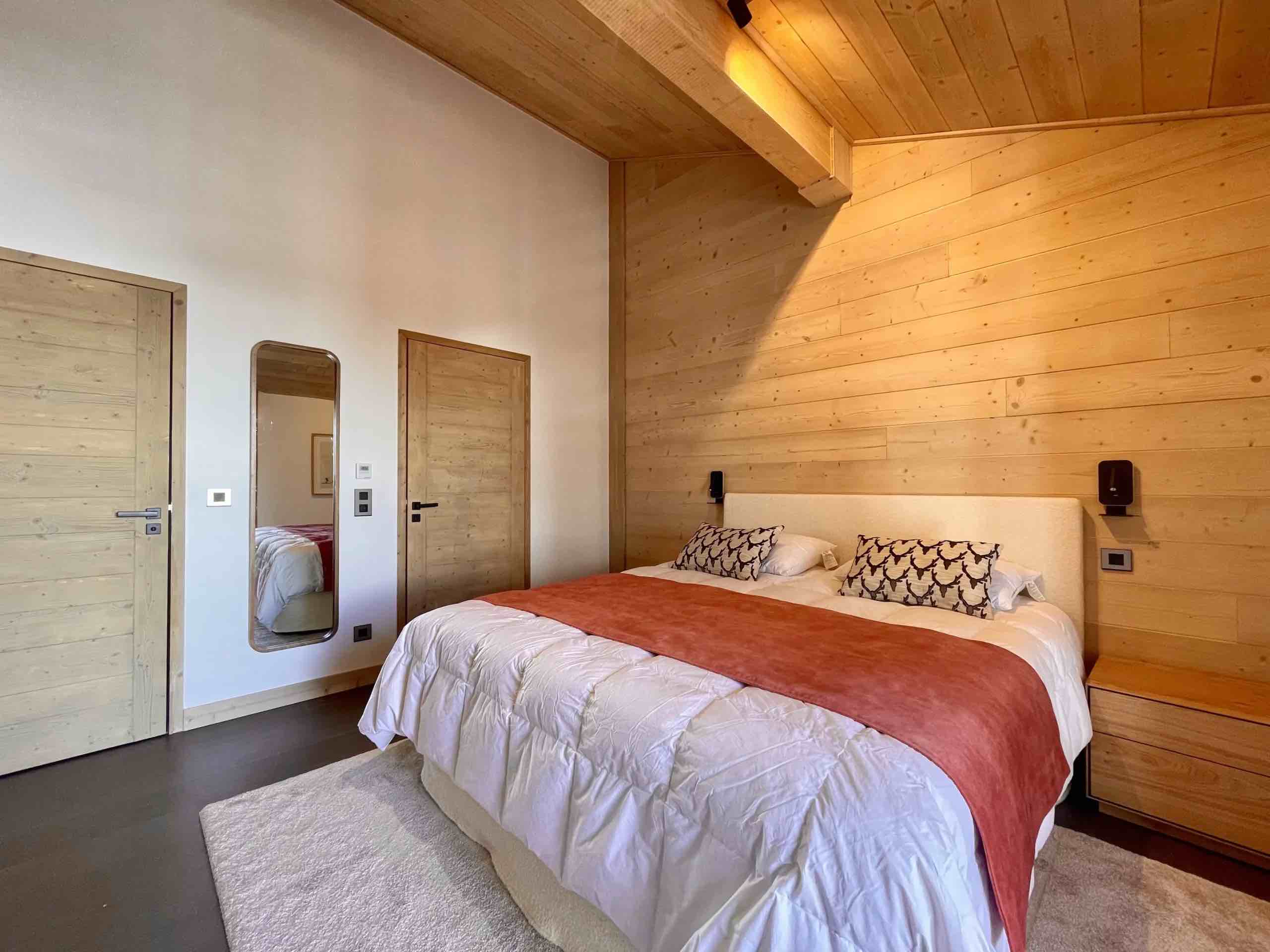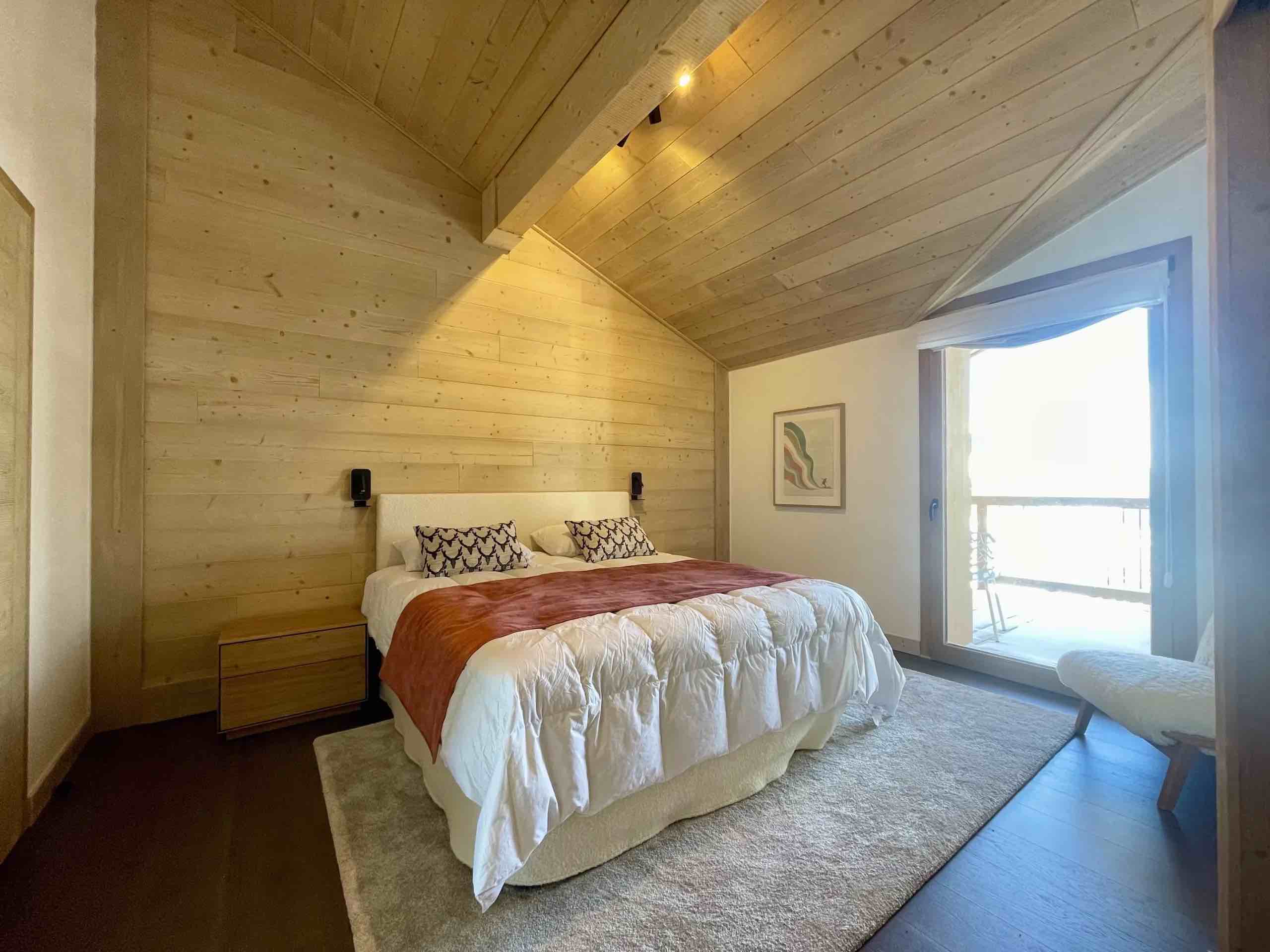 Spanning approximately 140 square metres, Theo comfortably accommodates up to eight guests across four beautifully appointed bedrooms, each with its own private bathroom to ensure both privacy and comfort for families or groups of friends. The spacious living area is filled with natural light and enhanced by high ceilings, refined alpine décor, and a decorative fireplace that creates a warm and inviting atmosphere after a day on the mountain.
