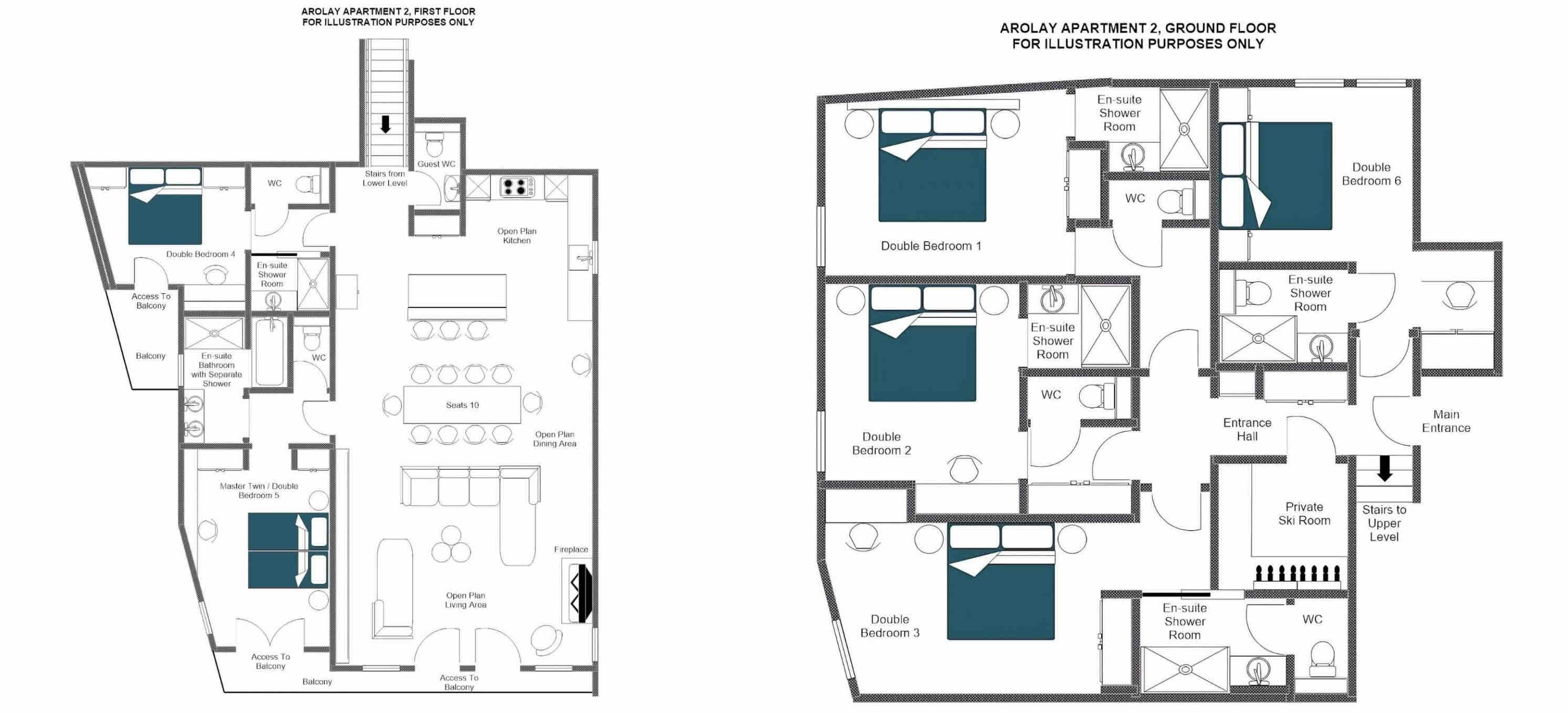 Arolay Apartment 2 offers six double bedrooms, each designed with comfort and relaxation in mind. Soft textures, ambient lighting, and thoughtful design details create a warm and restful atmosphere. All bedrooms include en-suite shower rooms, while the master suite also features a bathtub. The master bedroom can also be arranged as a twin if preferred. Two of the bedrooms have access to private balconies.