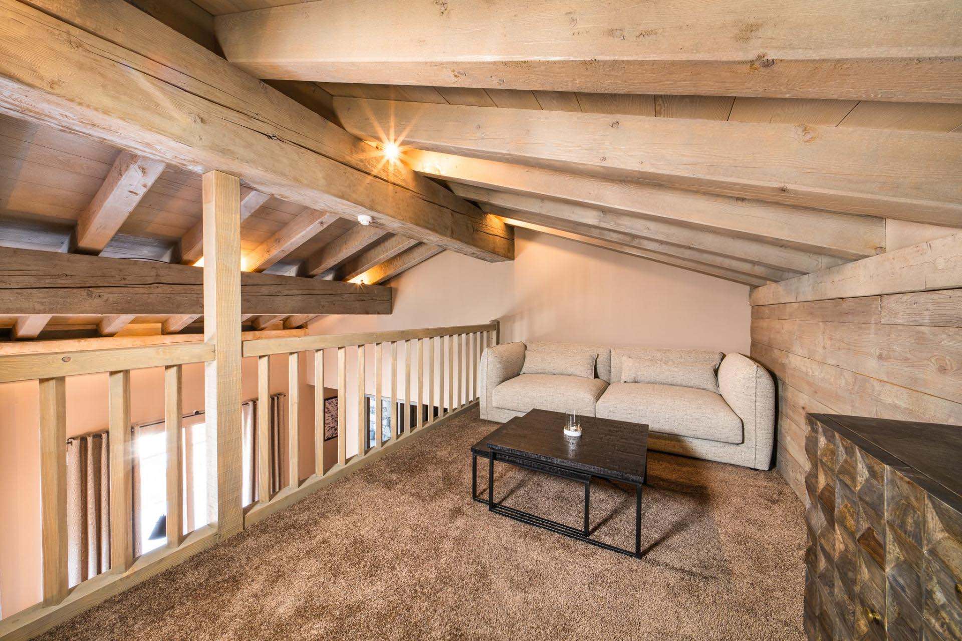 After a day on the slopes, guests can unwind in the elegant open-plan living and dining area. Vaulted ceilings and a wood-burning fireplace create a warm, inviting atmosphere, while large picture windows frame picturesque views of the village and mountains. Plush contemporary sofas are perfectly positioned for relaxing in front of the fire or enjoying a film on the wall-mounted TV. A cosy mezzanine lounge provides an additional space to retreat and relax.