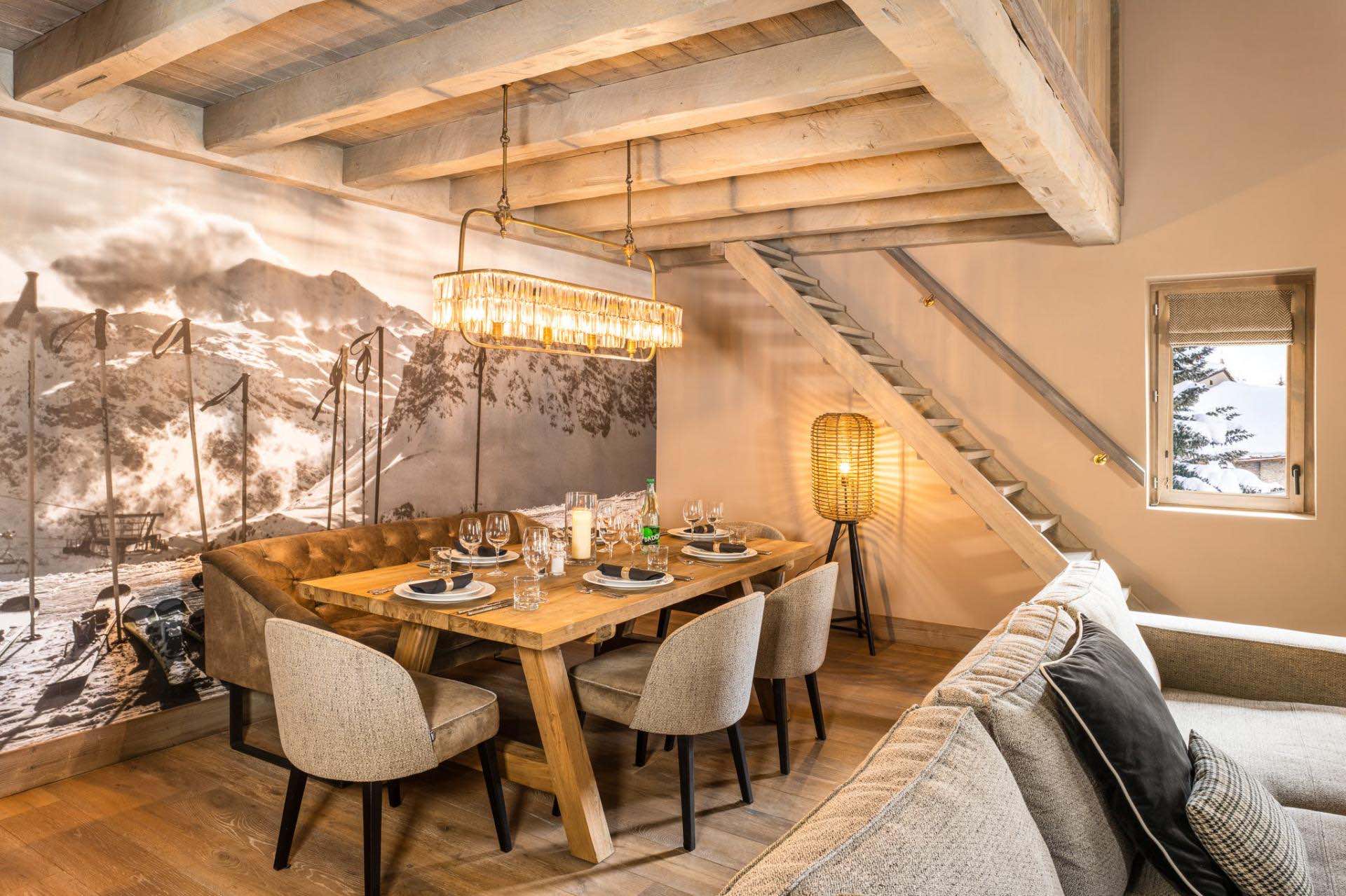 The dining area, located just beyond the main lounge, features a wooden dining table, stylish seating, and a sofa under ambient lighting, ideal for sociable evening meals. A striking panoramic mountain artwork spans the rear wall, setting the tone for the day ahead over breakfast. Step out onto the balcony to take in views of the nearby church and snow-capped peaks.