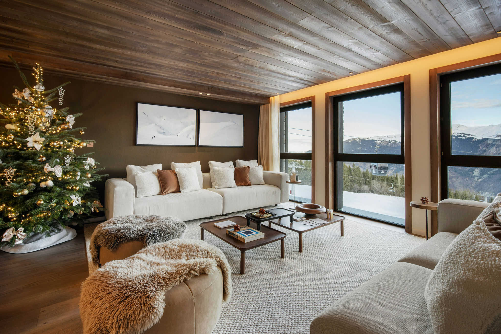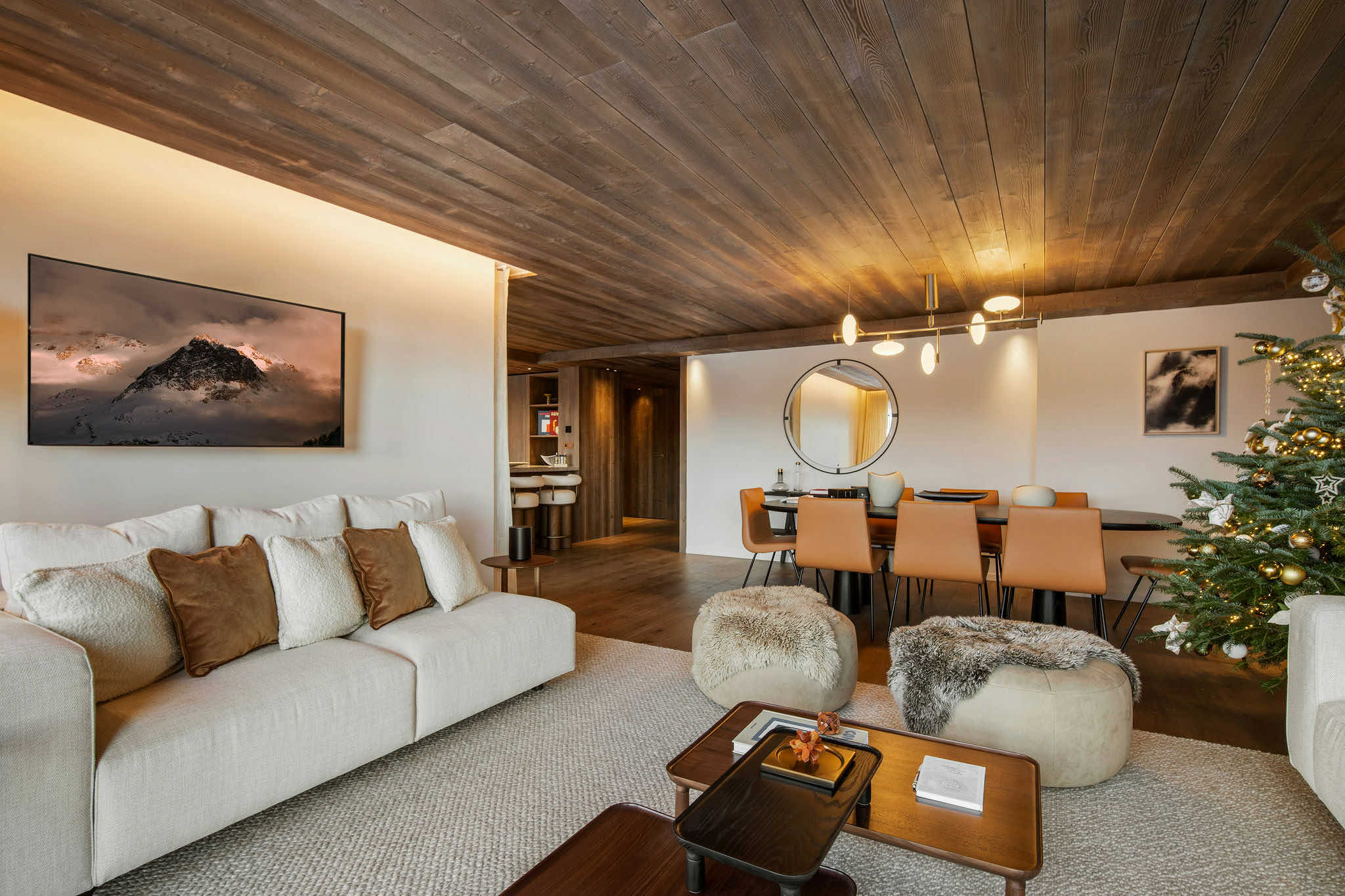 Behind its striking wood-and-glass façade, the residence reveals spacious interiors with a timelessly elegant aesthetic, seamlessly blending traditional chalet architecture with contemporary alpine design.