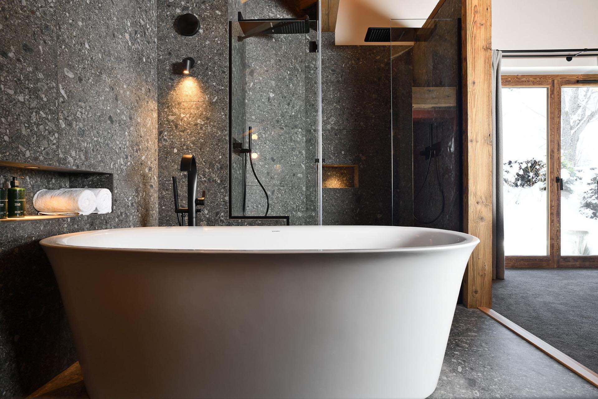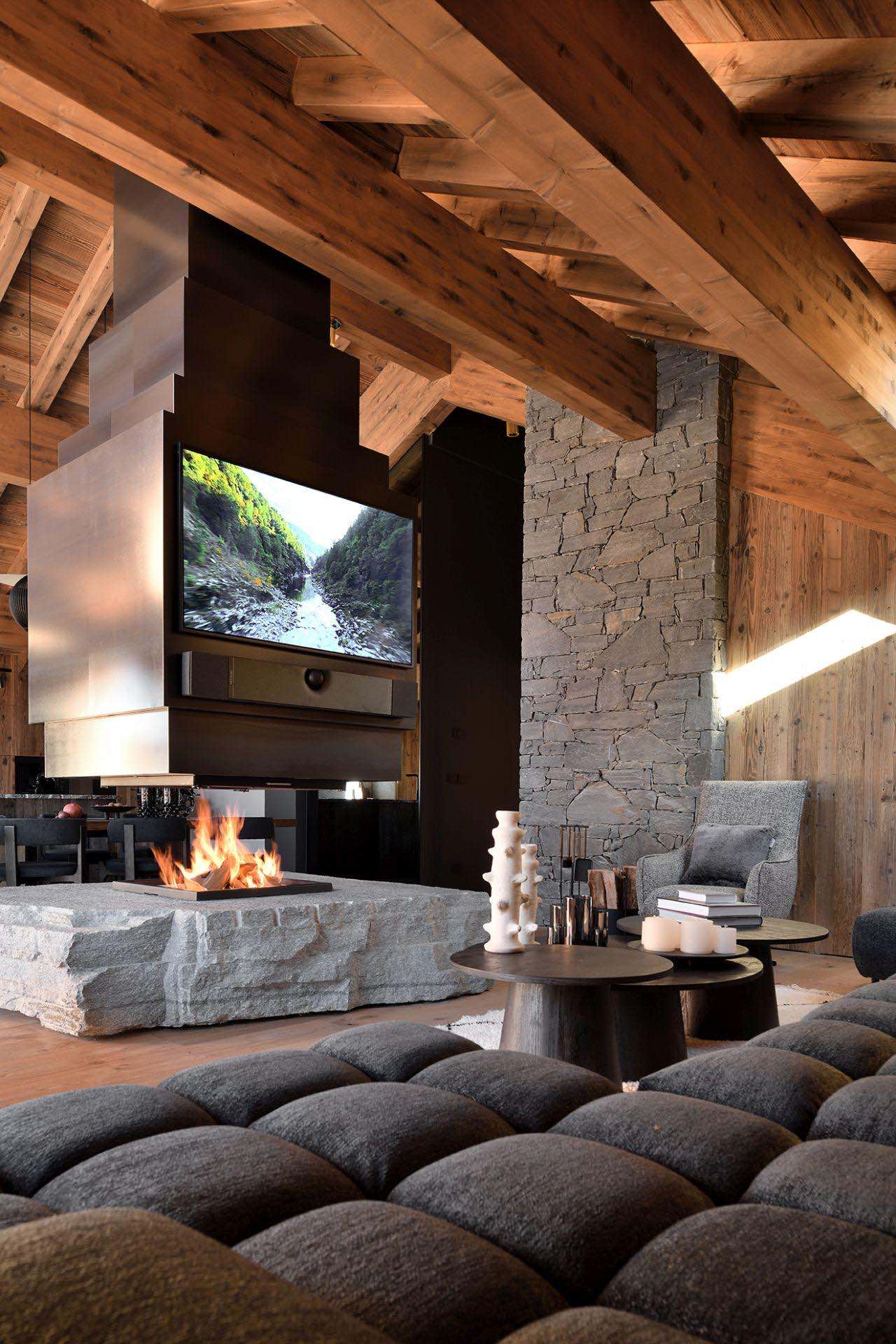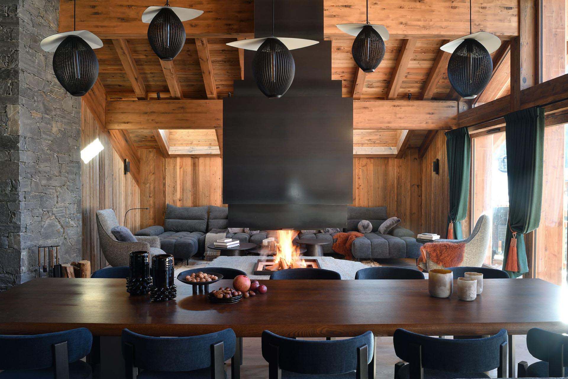 Step inside to discover the heart of the home — a breathtaking open-plan living area on the first floor. High vaulted ceilings, exposed timber beams, and expansive floor-to-ceiling windows create a bright, airy atmosphere with spectacular mountain views. A striking central fireplace anchors the cosy lounge, while the elegant dining space sets the scene for memorable evenings with loved ones. The sweeping terrace beyond invites you to soak up panoramic vistas — ideally with a cocktail in hand. The fully equipped kitchen perfectly balances alpine character with sleek Scandinavian style, providing an inviting space for the group’s chef to shine.