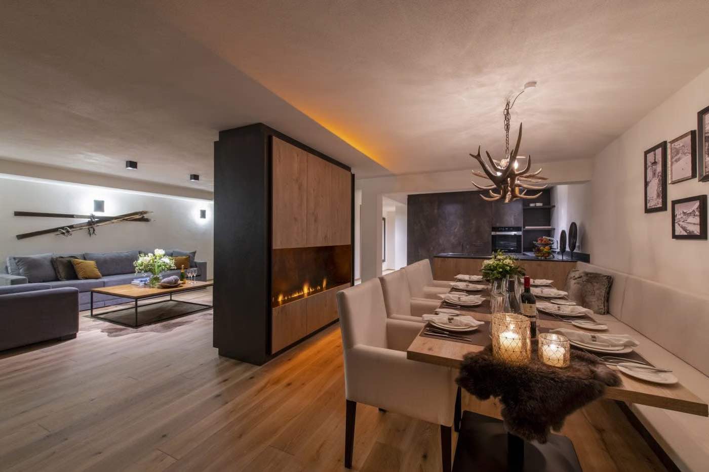 The open-plan kitchen, dining and living area is an inviting space for both relaxation and entertaining. Contemporary furnishings and clean lines are complemented by subtle references to the region’s mountaineering heritage, with vintage photographs and beautifully preserved ski equipment adding character and warmth. The living area comfortably seats six, while a large TV mounted on a central column subtly separates it from the dining space, where an elegant table seats up to eight. An electric fireplace enhances the calm ambience, and the sleek, fully equipped kitchen overlooks the room, ideal for preparing meals when not exploring Lech’s excellent restaurants.