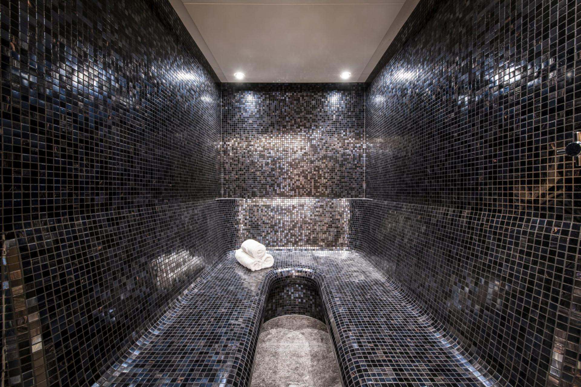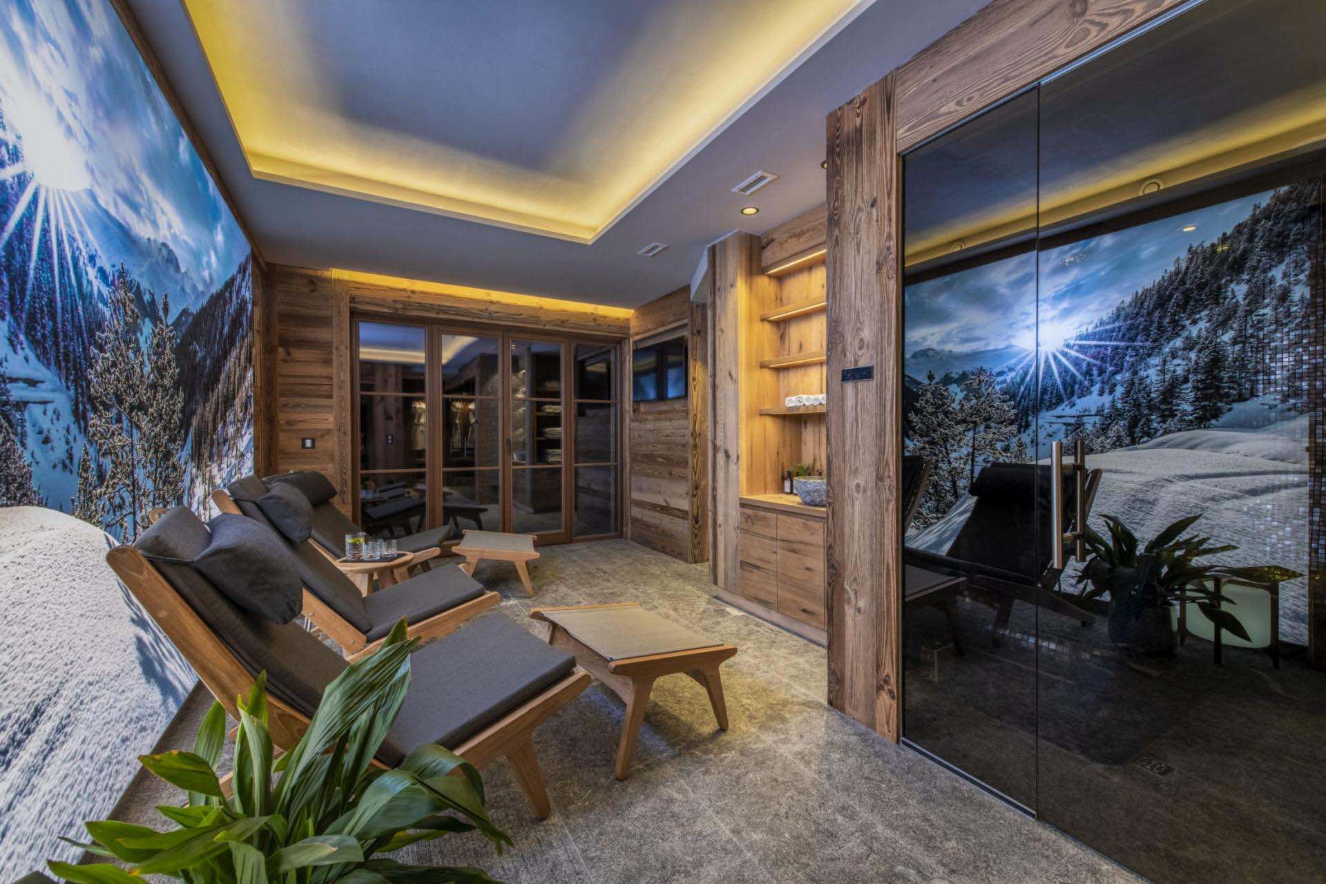 After skiing, guests can retreat to the chalet’s serene wellness area on the ground floor. Designed for post-mountain recovery, it includes a sauna, Hammam, and loungers for ultimate relaxation.