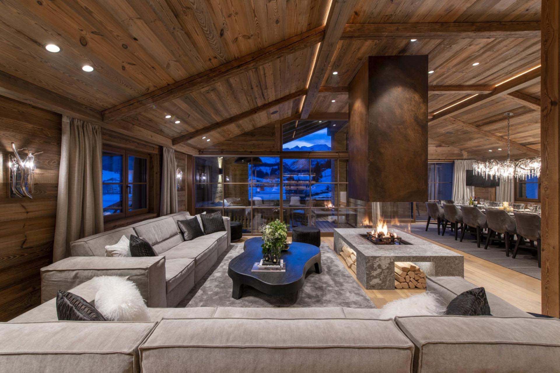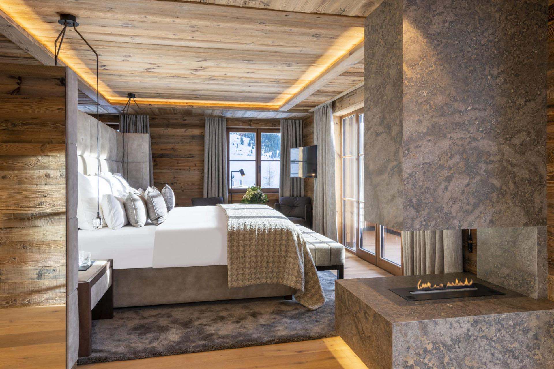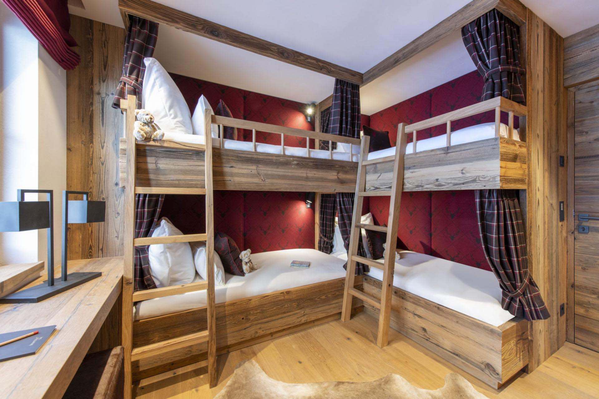 The six beautifully appointed bedrooms reflect the chalet’s cohesive design aesthetic, natural wood tones, neutral color schemes, and luxurious soft furnishings. Five of the rooms are en-suite doubles, four of which can be arranged as twins for greater flexibility. The standout is the master suite on the first floor, featuring a private balcony with mountain views, a fireplace, open-concept bathroom, dressing area, and a quiet reading nook. A charming quad bunk room (sleeping four) is ideal for children or family groups.