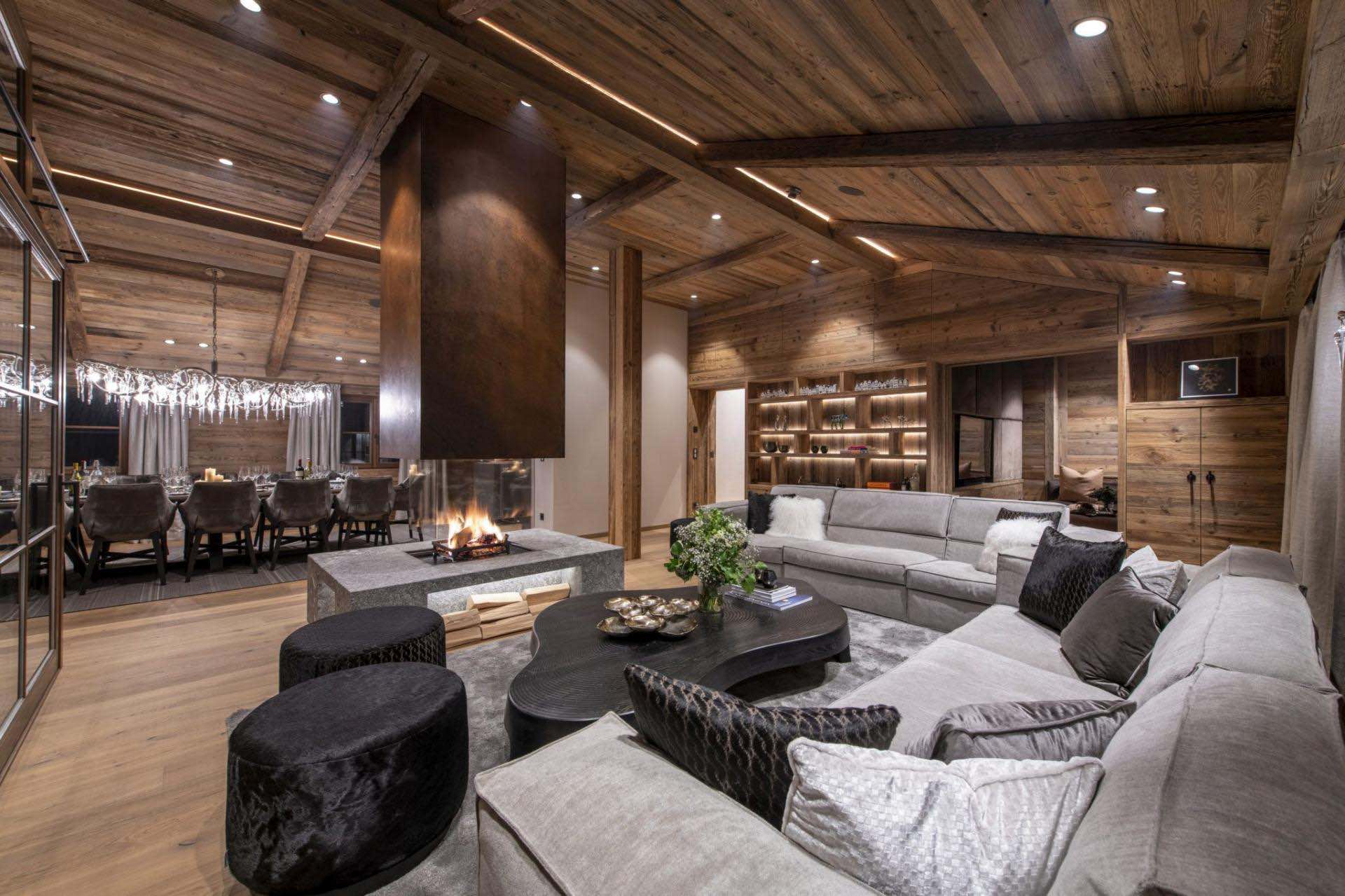 The top floor hosts the main living area, where panoramic floor-to-ceiling windows frame breathtaking views of the snow-dusted valley, creating an unforgettable backdrop to your winter escape. Sunlight fills the open-plan lounge, where two plush sofas encircle a coffee table and a striking 360° fireplace, the perfect setting to unwind after a day on the slopes. Step outside to the semi-enclosed balcony, complete with outdoor furniture and a heat lamp, and take in the alpenglow as the sun sets behind the peaks.