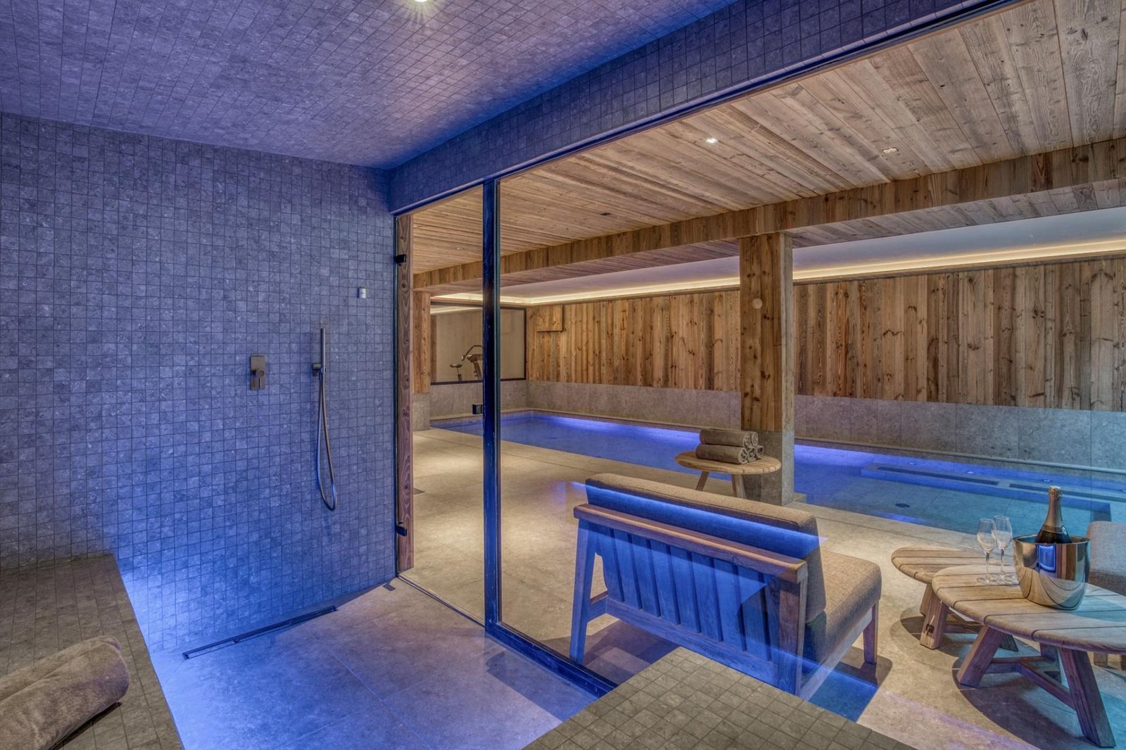 For those seeking more than a day on the slopes can provide, a compact gym awaits, offering a variety of exercise machines. Notably, these machines overlook the pièce de résistance of this luxury ski chalet: a breathtaking wellness area featuring an indoor swimming pool, an integrated jacuzzi, a hammam, and a serene massage room – the perfect sanctuary for relaxation or a tantalizing test of dedication for fitness enthusiasts observing the merriment from the treadmill.