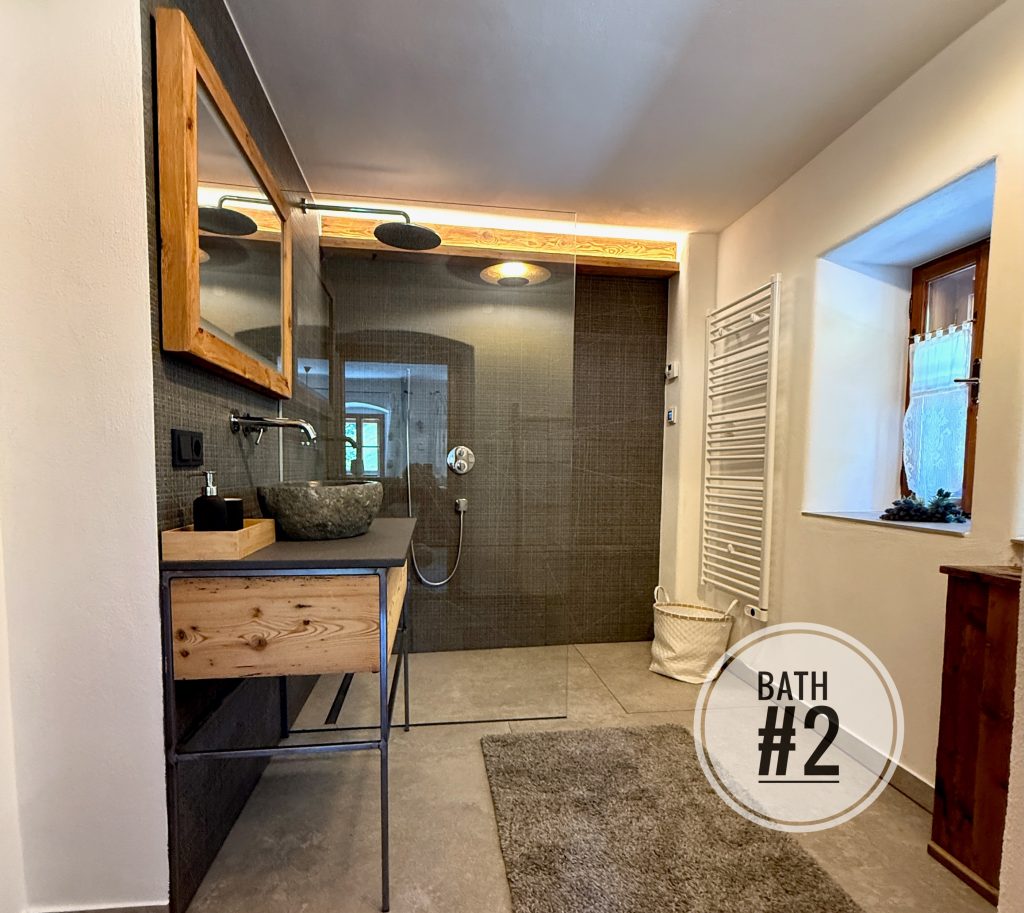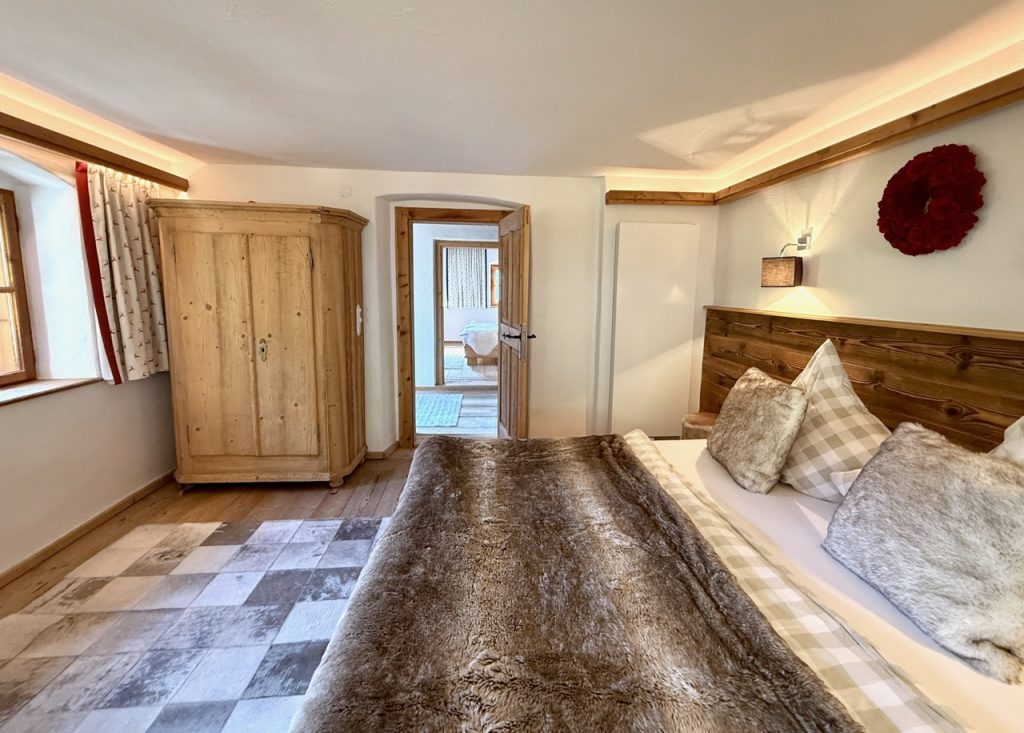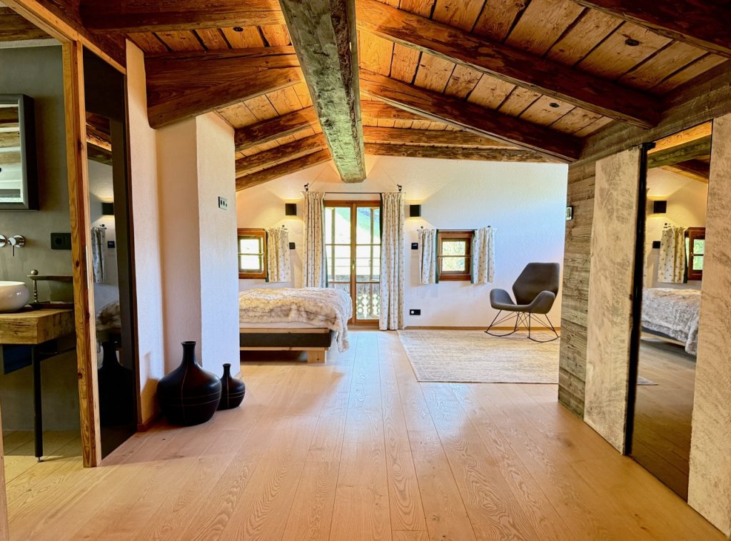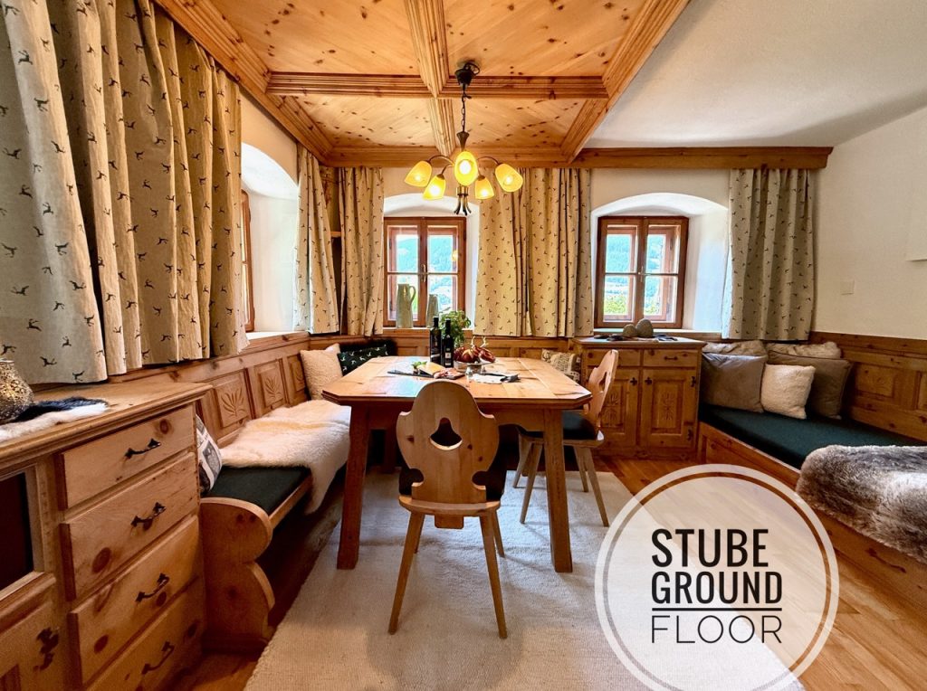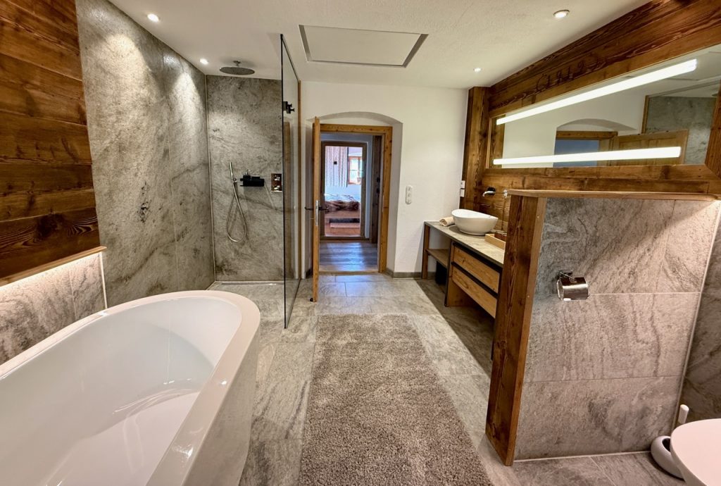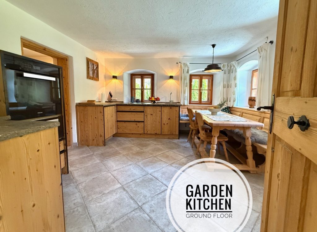 On the ground floor, guests will find a bedroom with en-suite bathroom, a second bedroom with a separate bathroom and additional toilet, a charming Tyrolean parlour, and access to the outdoor garden kitchen. The first floor houses the living and dining area with the designer kitchen, three double bedrooms, and a large bathroom with shower, bathtub, and double sink, along with access to a balcony. The attic is home to the master bedroom, complete with its own en-suite bathroom.
