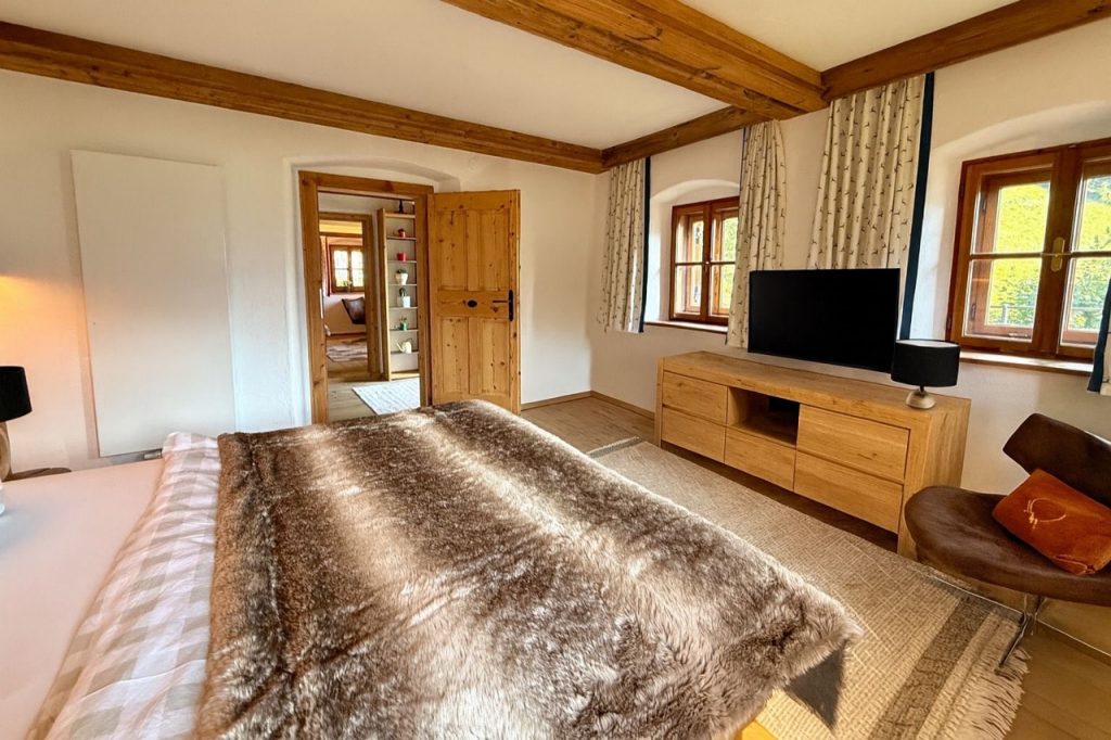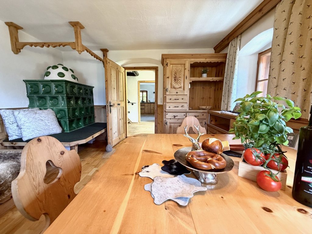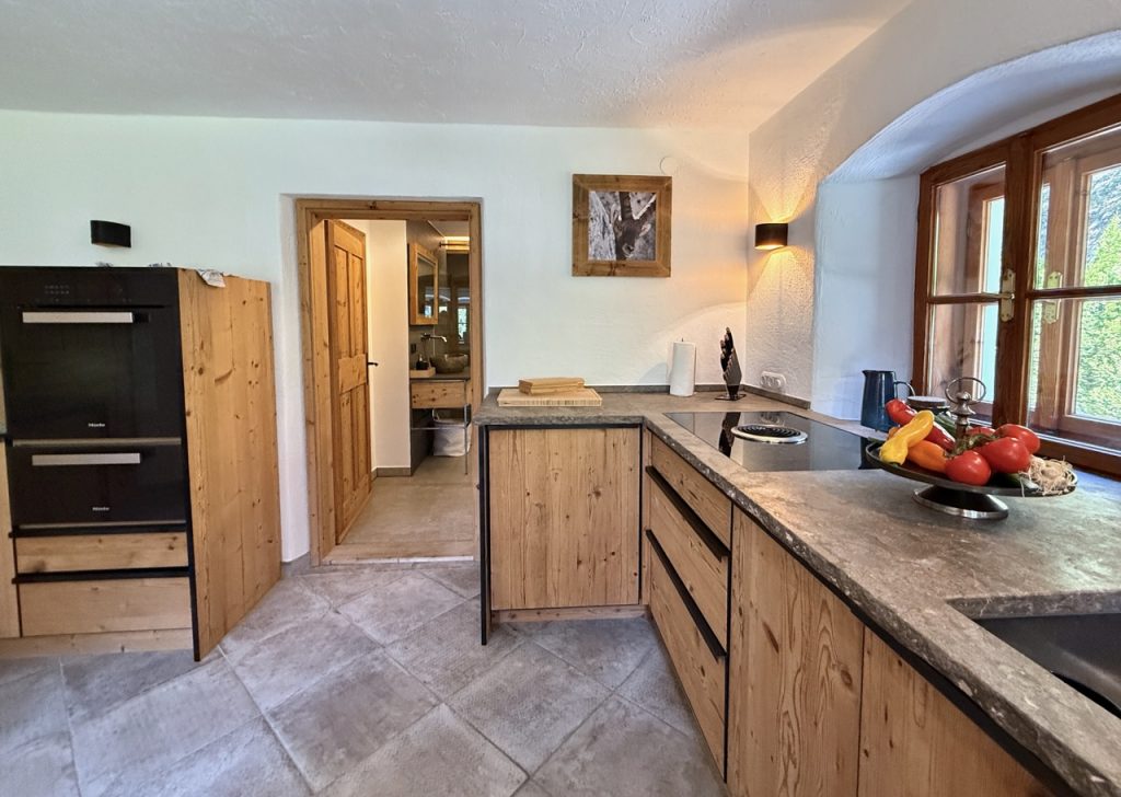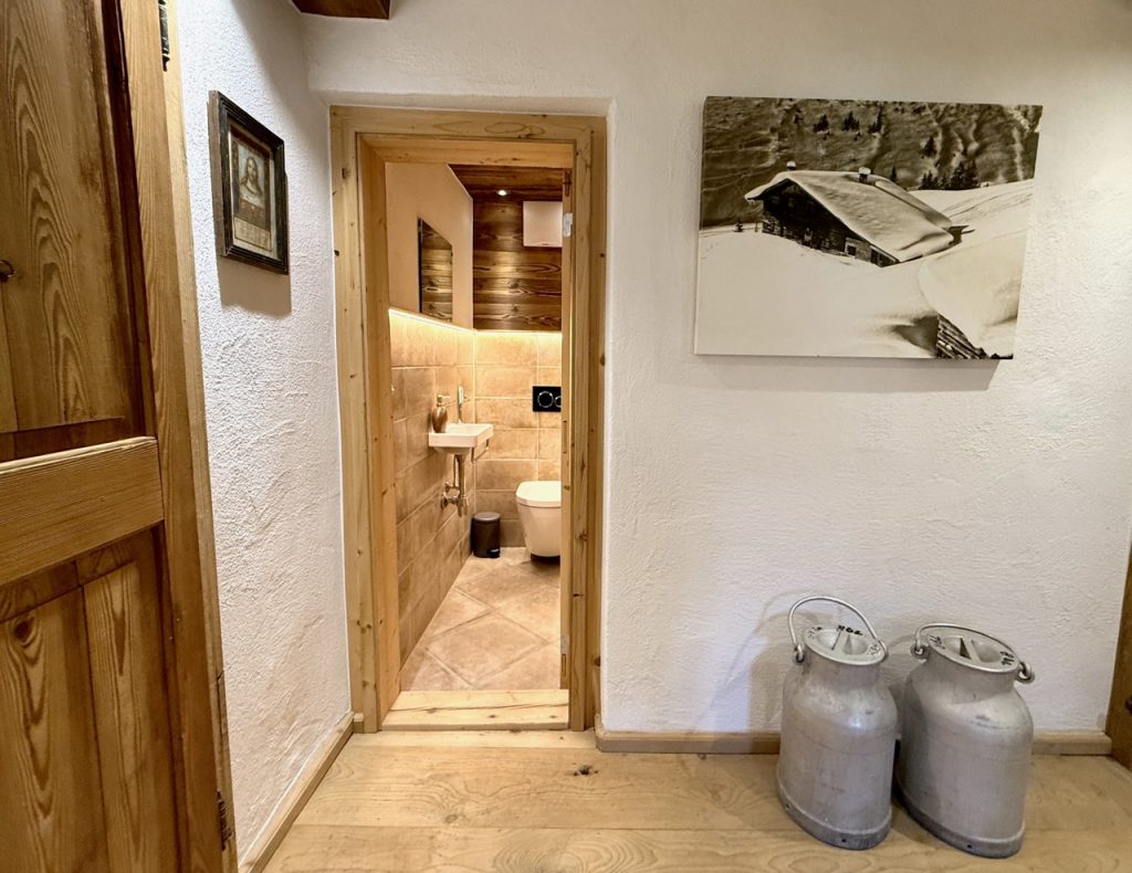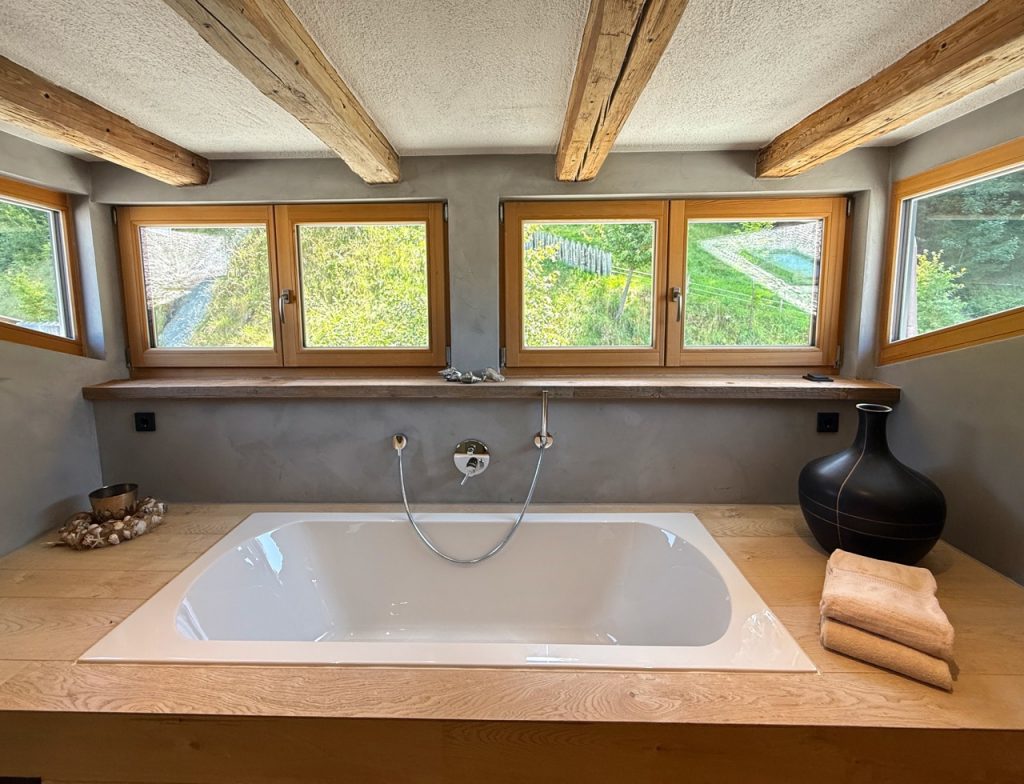 On the ground floor, guests will find a bedroom with en-suite bathroom, a second bedroom with a separate bathroom and additional toilet, a charming Tyrolean parlour, and access to the outdoor garden kitchen. The first floor houses the living and dining area with the designer kitchen, three double bedrooms, and a large bathroom with shower, bathtub, and double sink, along with access to a balcony. The attic is home to the master bedroom, complete with its own en-suite bathroom.