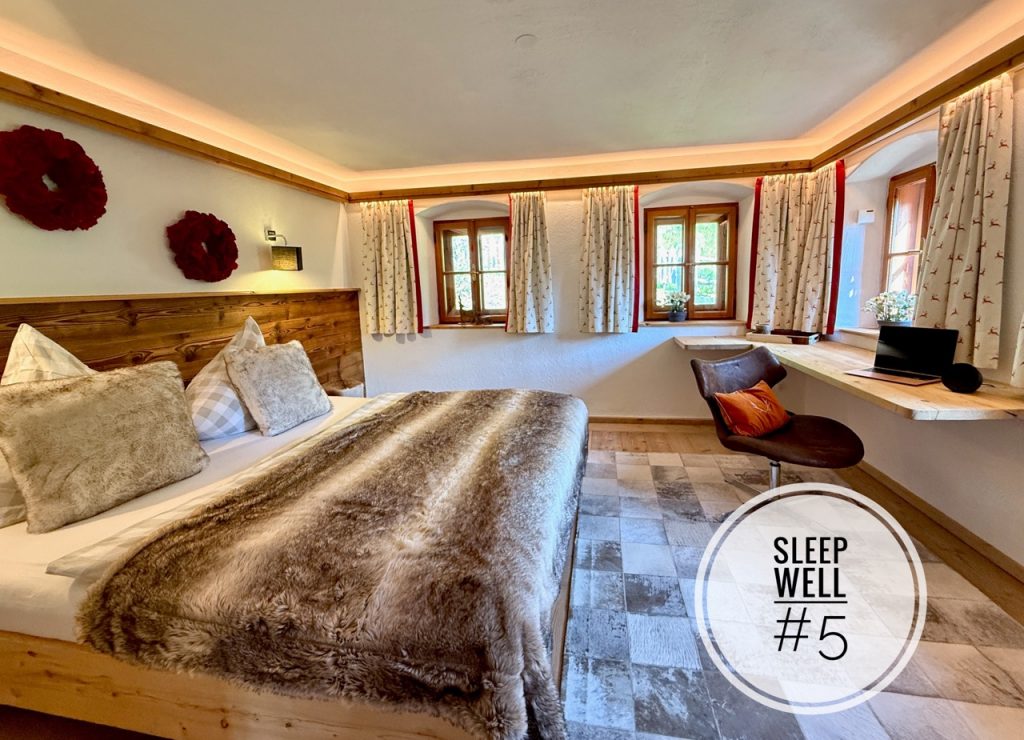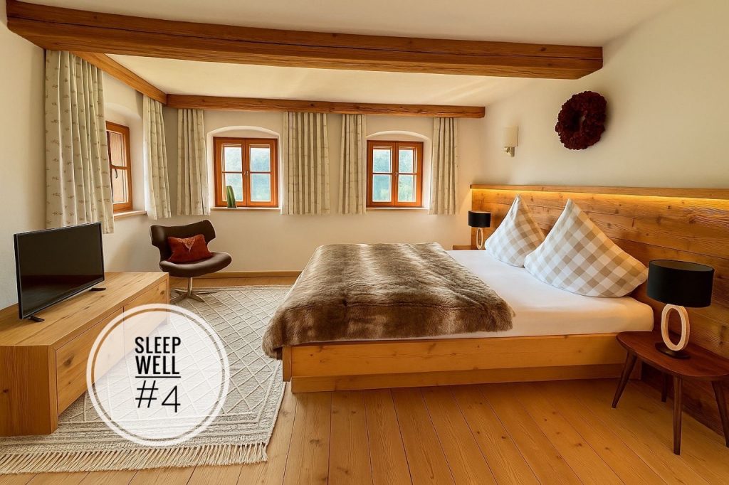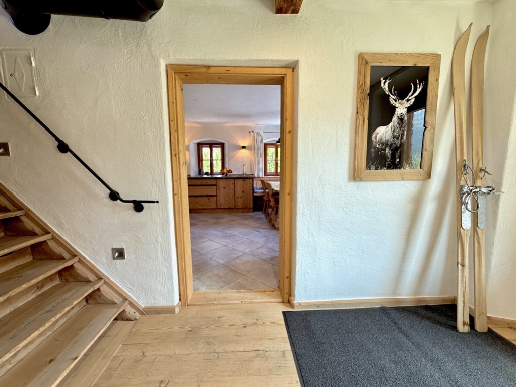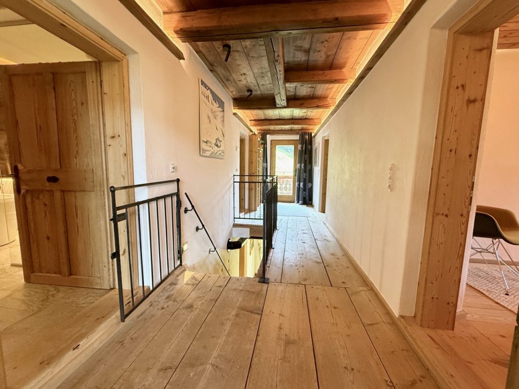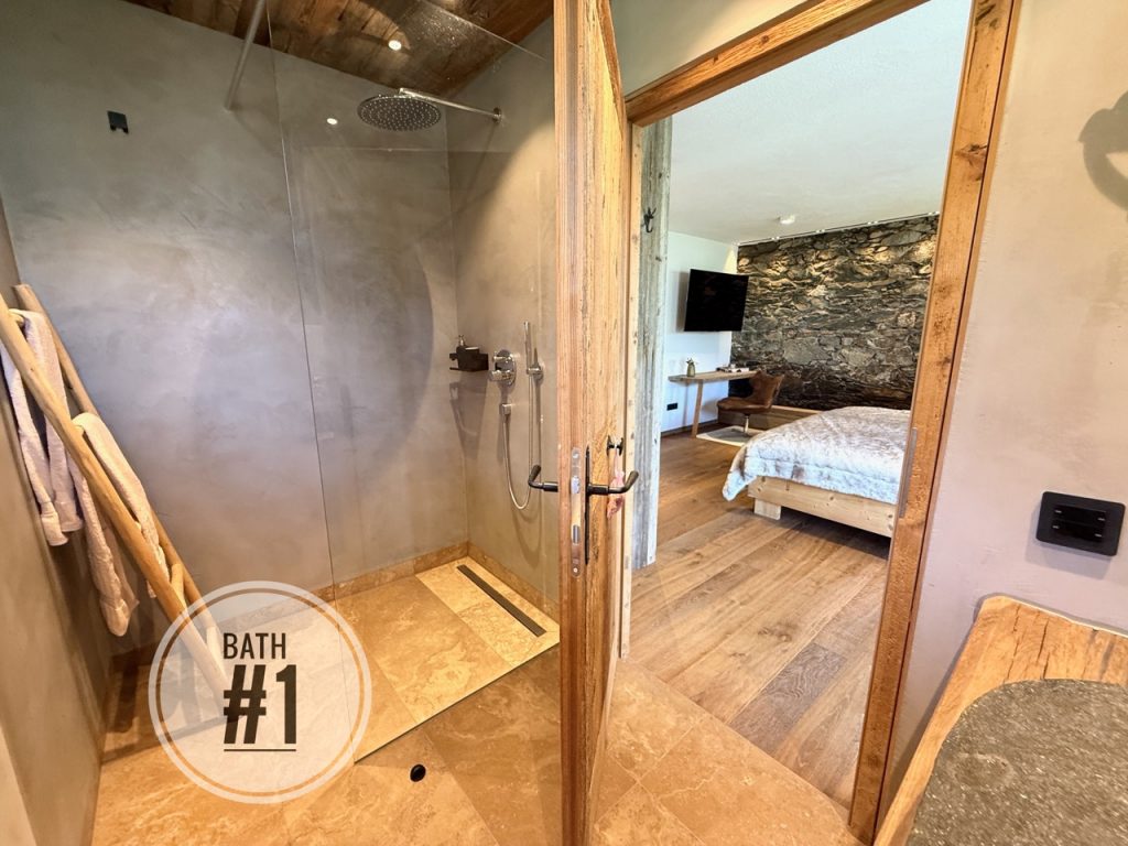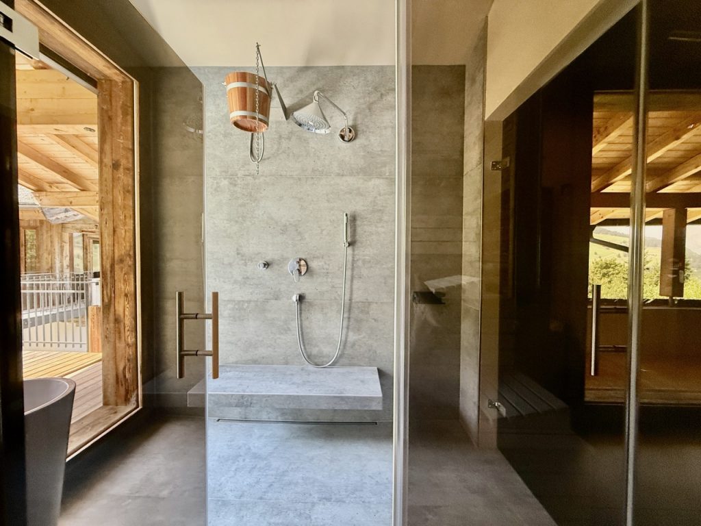 On the ground floor, guests will find a bedroom with en-suite bathroom, a second bedroom with a separate bathroom and additional toilet, a charming Tyrolean parlour, and access to the outdoor garden kitchen. The first floor houses the living and dining area with the designer kitchen, three double bedrooms, and a large bathroom with shower, bathtub, and double sink, along with access to a balcony. The attic is home to the master bedroom, complete with its own en-suite bathroom.
