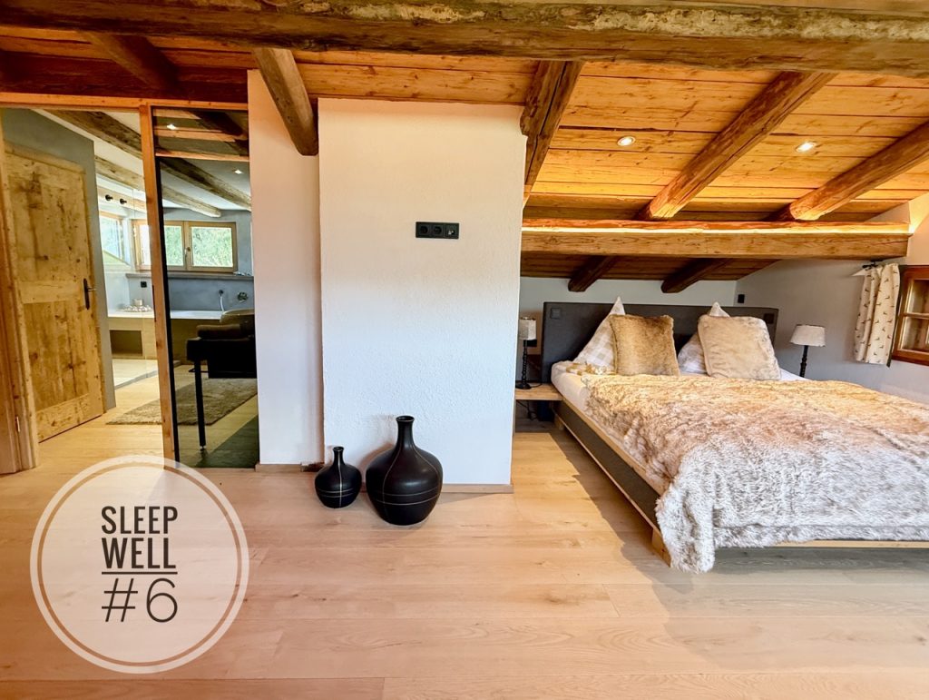 The chalet features six elegant double bedrooms, each equipped with Alexa and some with TVs. Two of the bedrooms are designed with en-suite bathrooms and Nespresso machines, while the master suite in the attic also includes its own private bathroom.