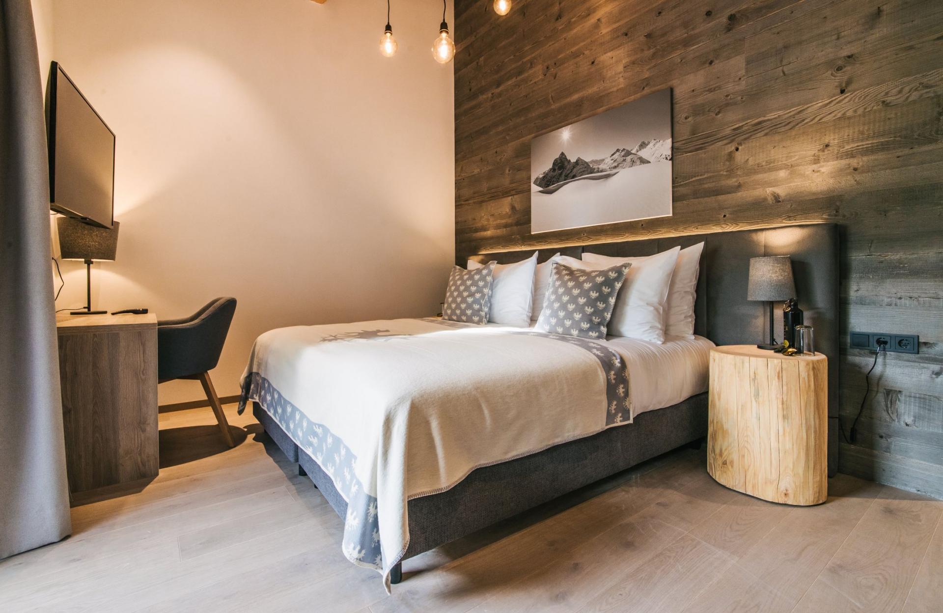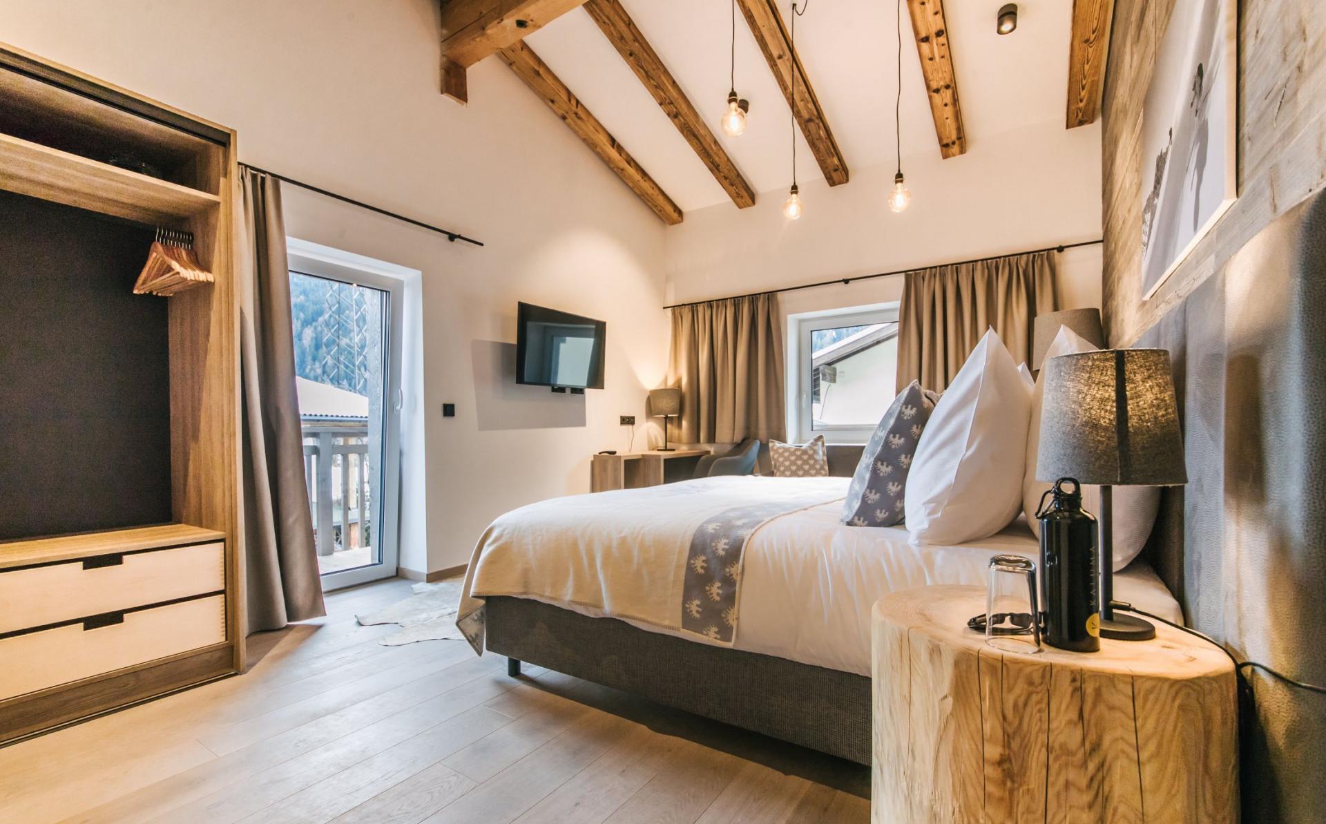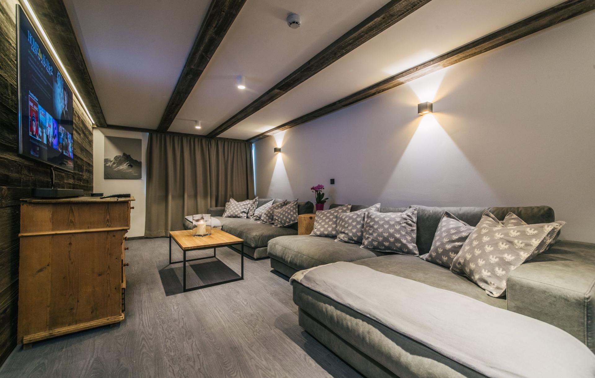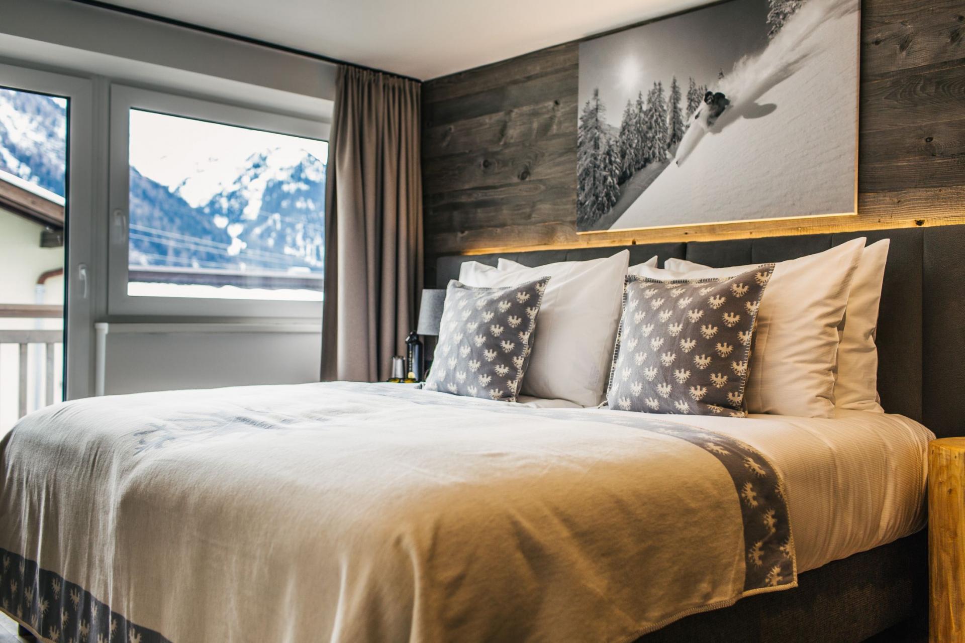 Accommodation spans the top two floors, where twelve double/twin bedrooms welcome up to 24 guests. Dark wood accents and exposed beams lend an authentic Alpine charm, complemented by plush furnishings and contemporary lighting. Over half the rooms open onto private or shared balconies, connecting you with the enchanting snowy landscapes of St Anton. Each bedroom includes its own stylish en-suite bath or shower room.