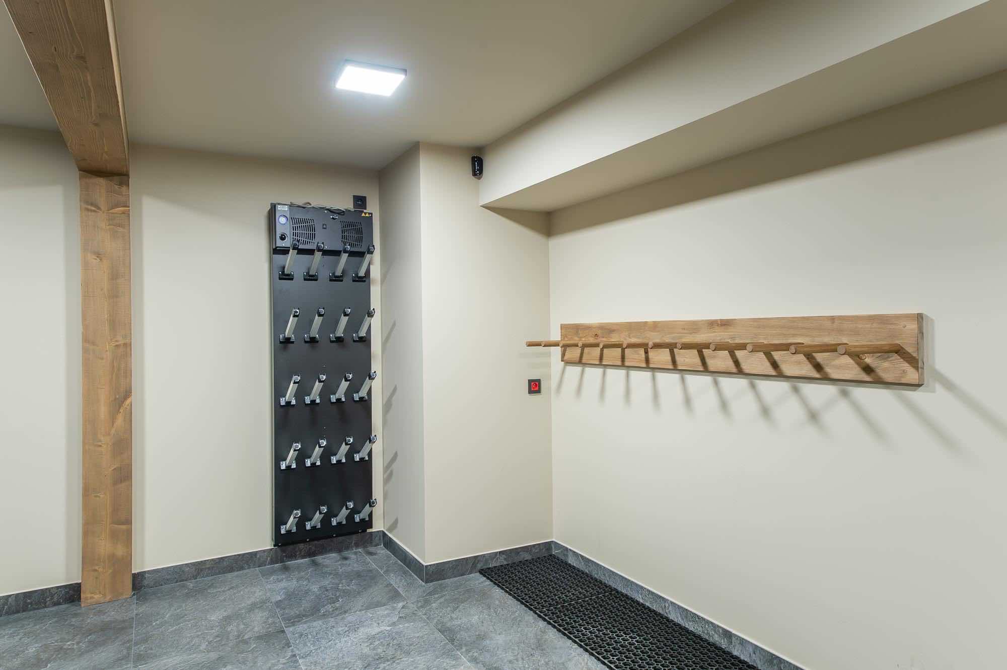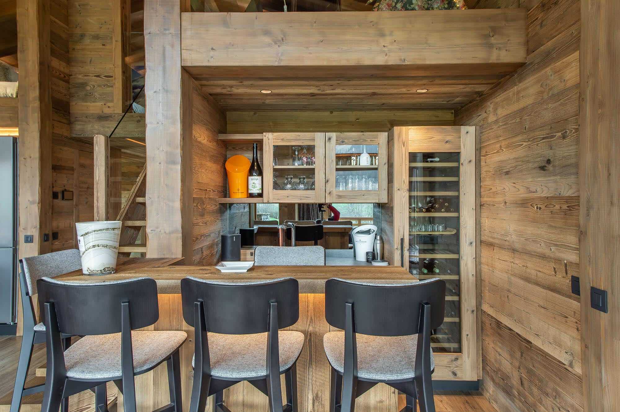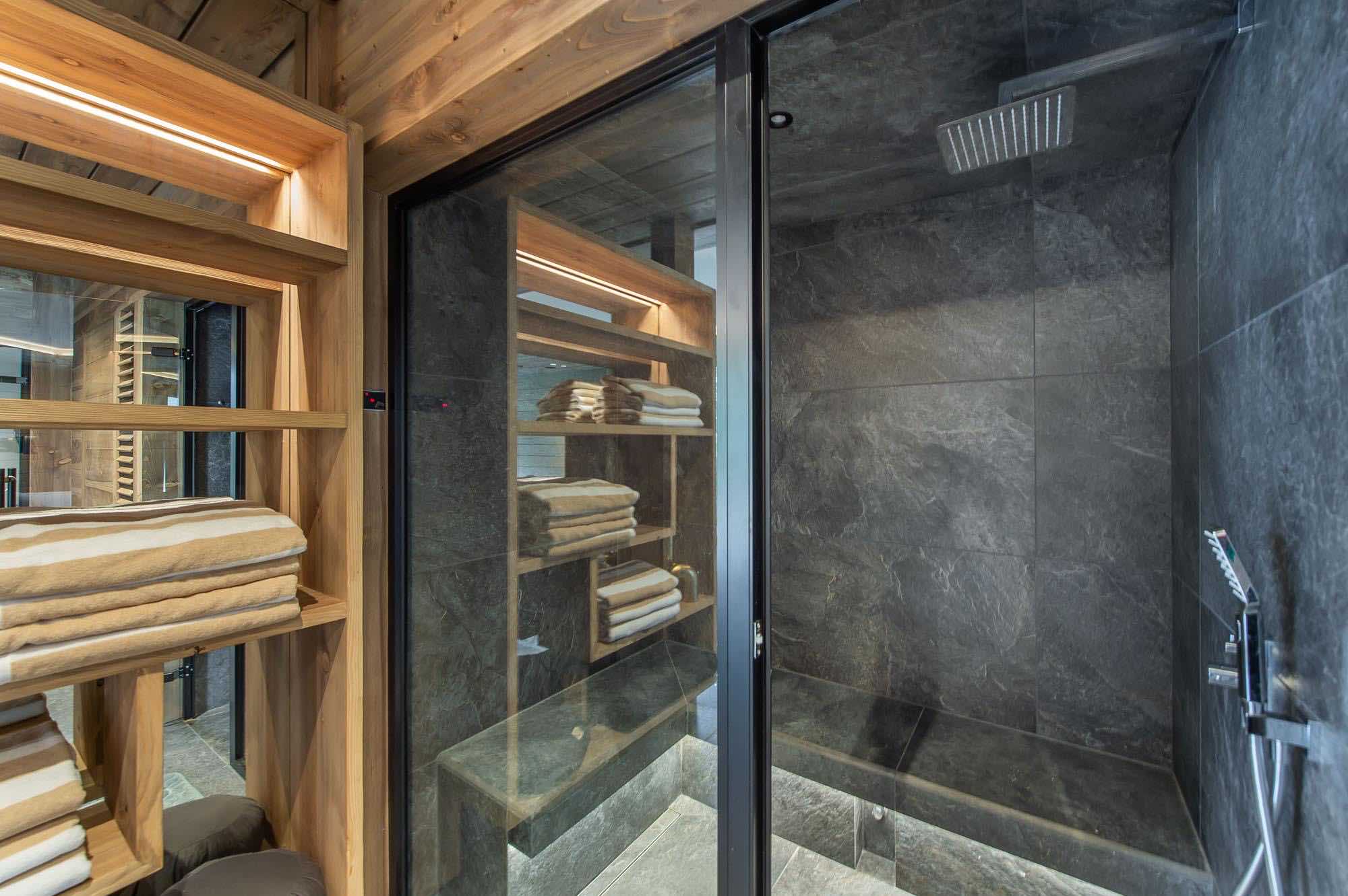 For moments of relaxation, the first floor hosts a wellness area with an indoor swimming pool and hammam, opening onto the garden to let natural light and mountain views in. A dedicated cinema room completes the chalet’s leisure facilities, offering entertainment for all ages.