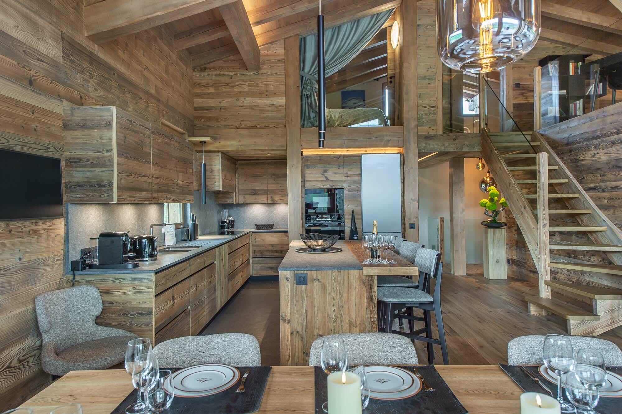 Designed in traditional alpine style, the architecture showcases high-quality old wood, a beautiful stone fireplace, and contemporary furnishings in soft, neutral tones. The vast living room, with its striking high ceilings, brings together a fully equipped open kitchen, dining area, lounge, and bar in a warm and convivial space. Evenings by the fire invite comfort, while the terrace frames breathtaking views of Mont-Blanc.