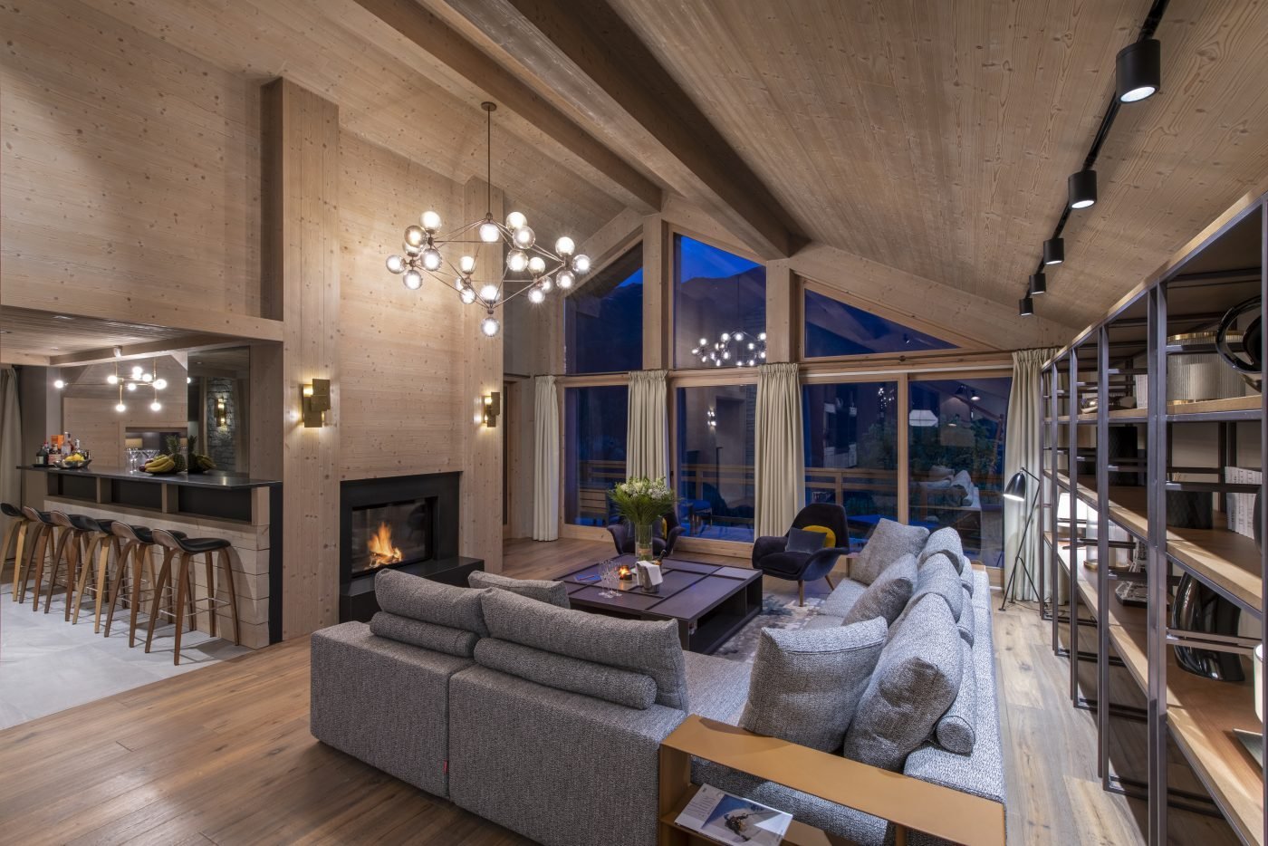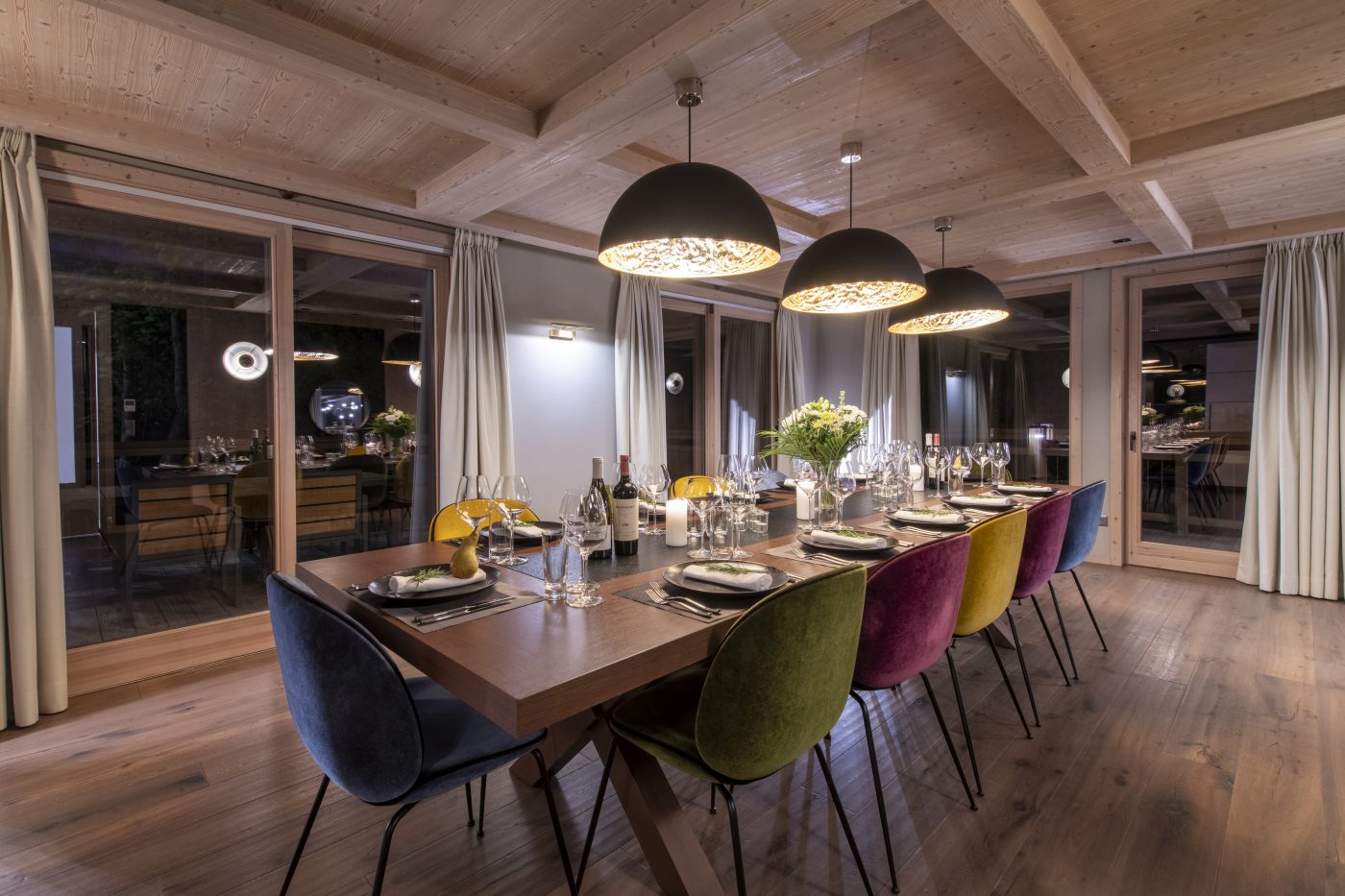 Spread across four floors and 400m², the chalet offers six bedrooms to accommodate 12 guests in comfort. The main living areas are found on the first floor, where contemporary design meets mountain charm. Light wood, bold furnishings, and soaring slanted ceilings create a bright and welcoming atmosphere. The spacious lounge, centred around a warming fireplace, is perfect for social gatherings, while a slightly elevated second lounge provides a cosier retreat. Between the two lies a chic bar that flows into the dining room, where colourful décor and a generous table easily host 12 guests. A separate, fully equipped kitchen is available whether the chalet is taken catered or self-catered. Outside, a broad south-facing balcony invites you to bask in the sun and admire sweeping mountain views.