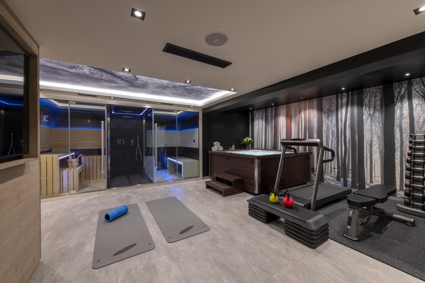 On the ground floor, a serene wellness area awaits after a day on the slopes. Guests can unwind in the indoor hot tub, sauna, or steam room, make use of the gym equipment, or enjoy a treatment in the private massage room.