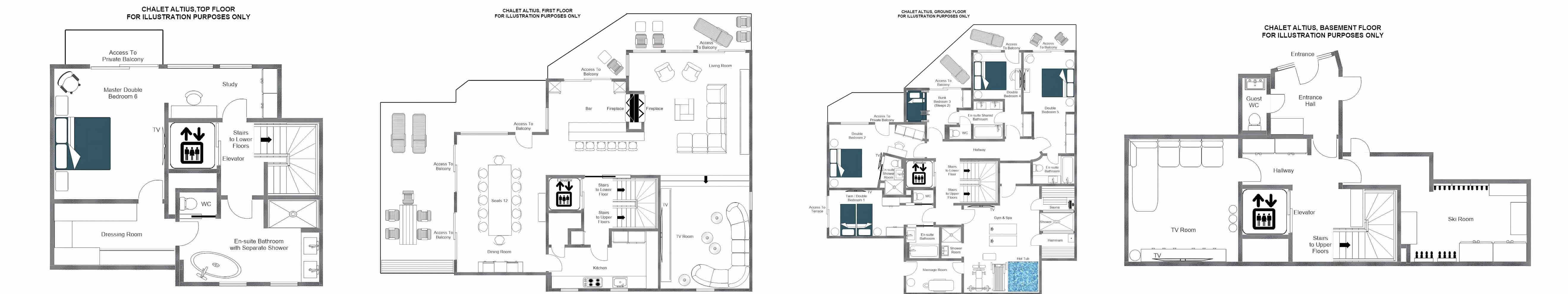 Chalet Altius features six bedrooms in total: five doubles and one bunk room. The top floor is reserved for the expansive Master suite, complete with dressing room, en-suite bathroom with freestanding tub and walk-in shower, and its own private balcony. The remaining bedrooms are located on the ground floor, each with terrace or balcony access. One double room connects with the bunk bedroom to form a convenient family suite, while the others enjoy en-suite bathrooms.