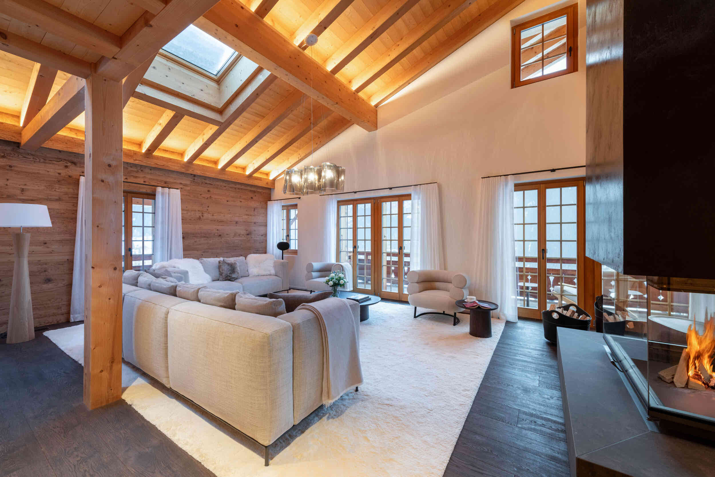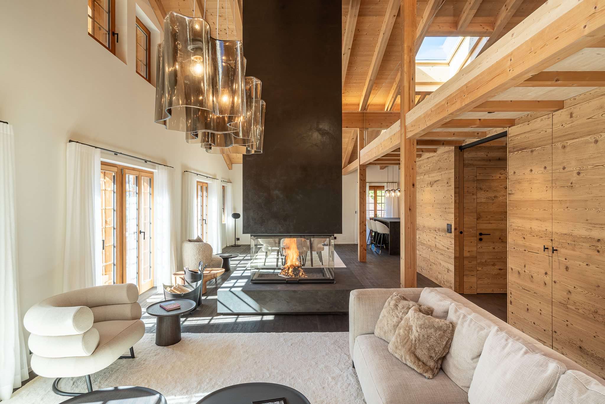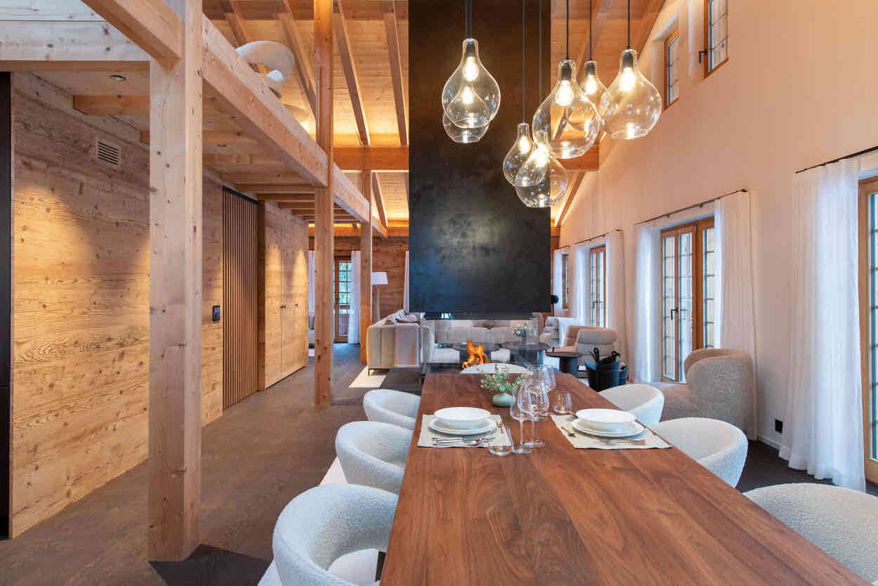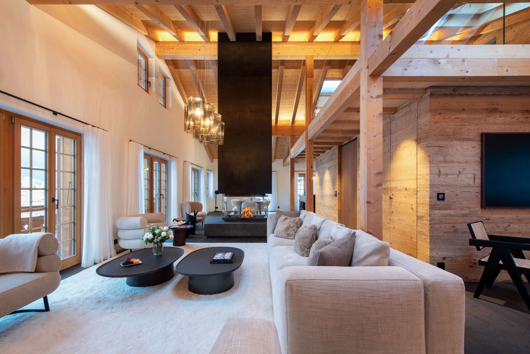 Spanning 405m², the chalet accommodates up to eight guests across four beautifully designed en-suite bedrooms. Light-filled interiors showcase natural wood, stone, and bespoke furnishings, creating a warm yet sophisticated atmosphere. At its heart, a striking 360° fireplace anchors the expansive living area, which flows seamlessly into a library, open-plan kitchen, and panoramic terraces.