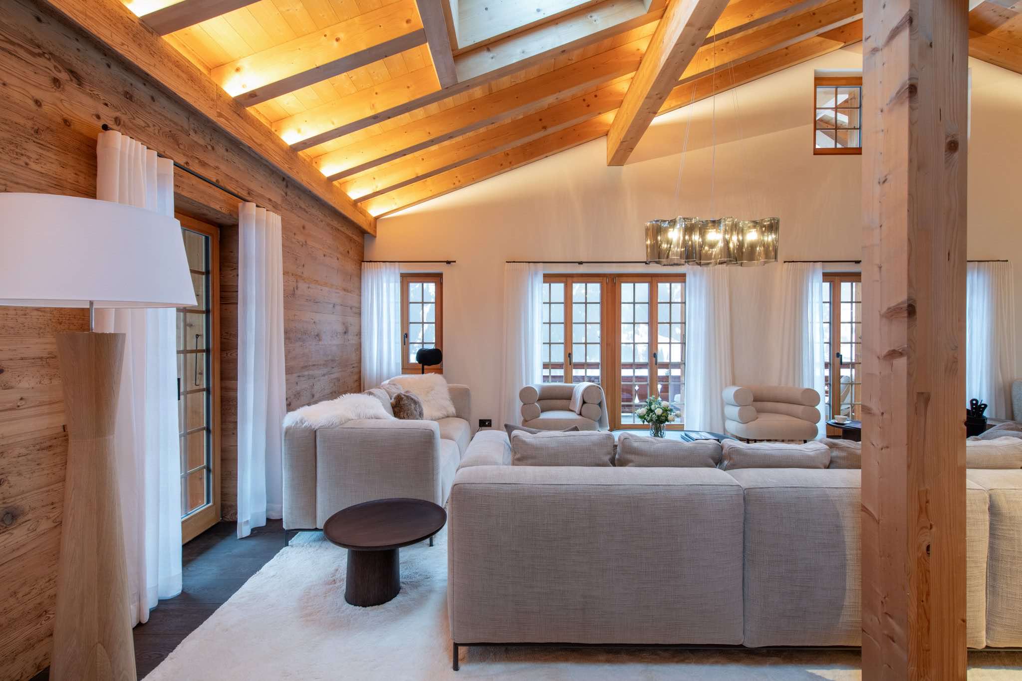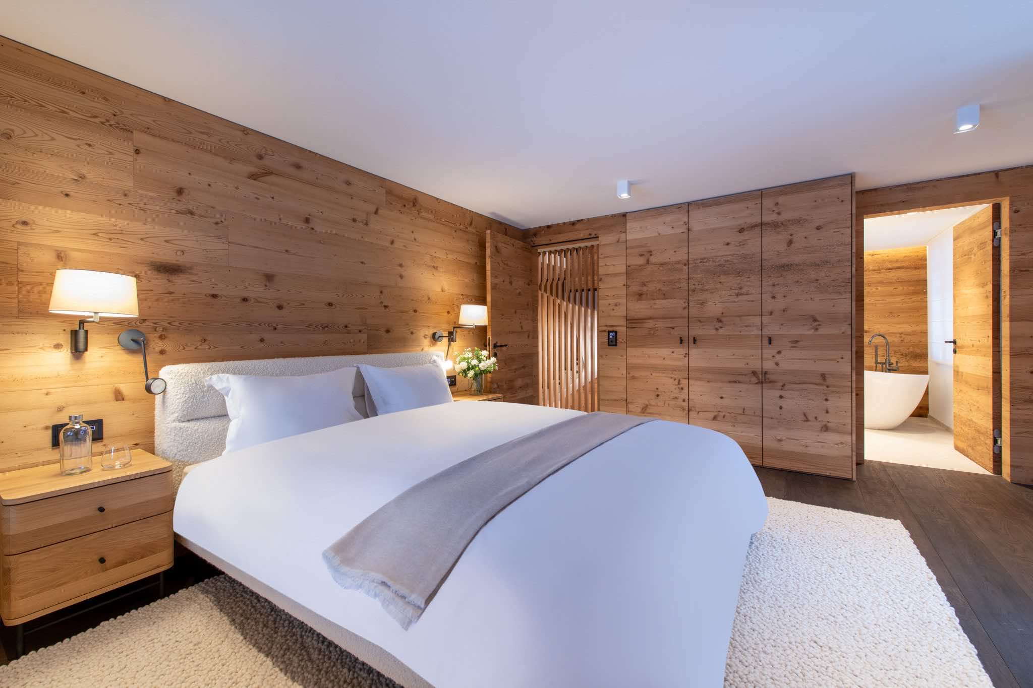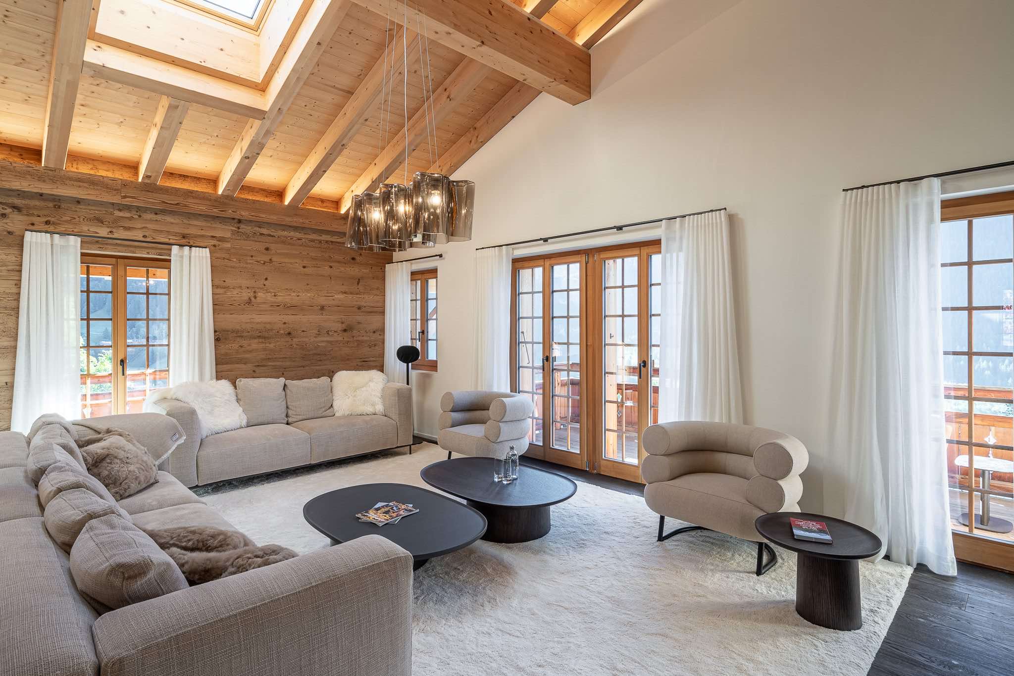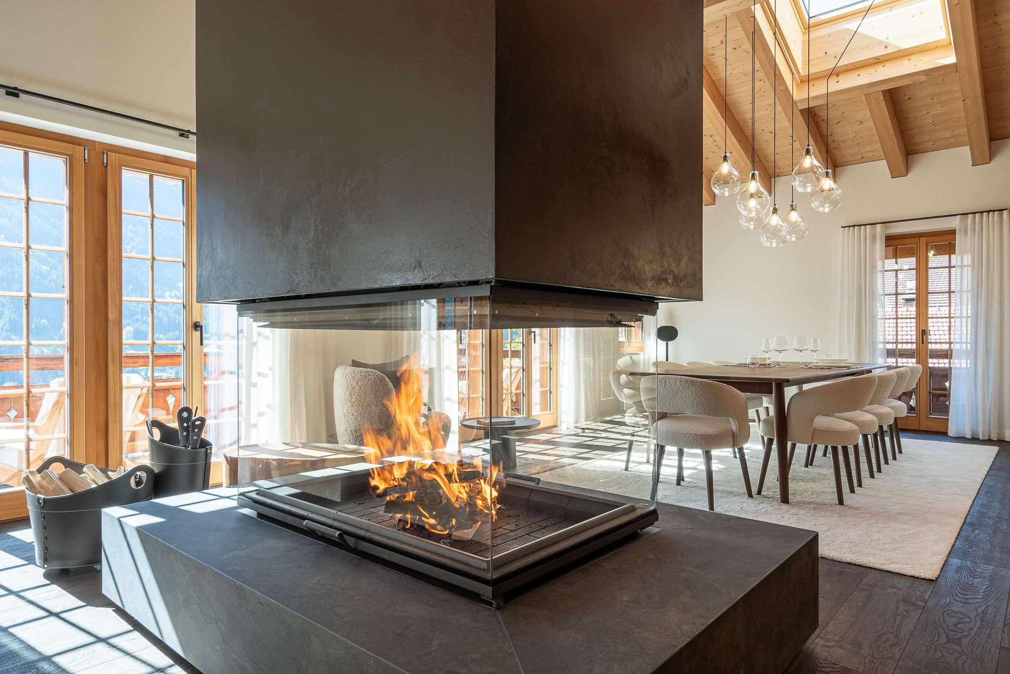 Spanning 405m², the chalet accommodates up to eight guests across four beautifully designed en-suite bedrooms. Light-filled interiors showcase natural wood, stone, and bespoke furnishings, creating a warm yet sophisticated atmosphere. At its heart, a striking 360° fireplace anchors the expansive living area, which flows seamlessly into a library, open-plan kitchen, and panoramic terraces.