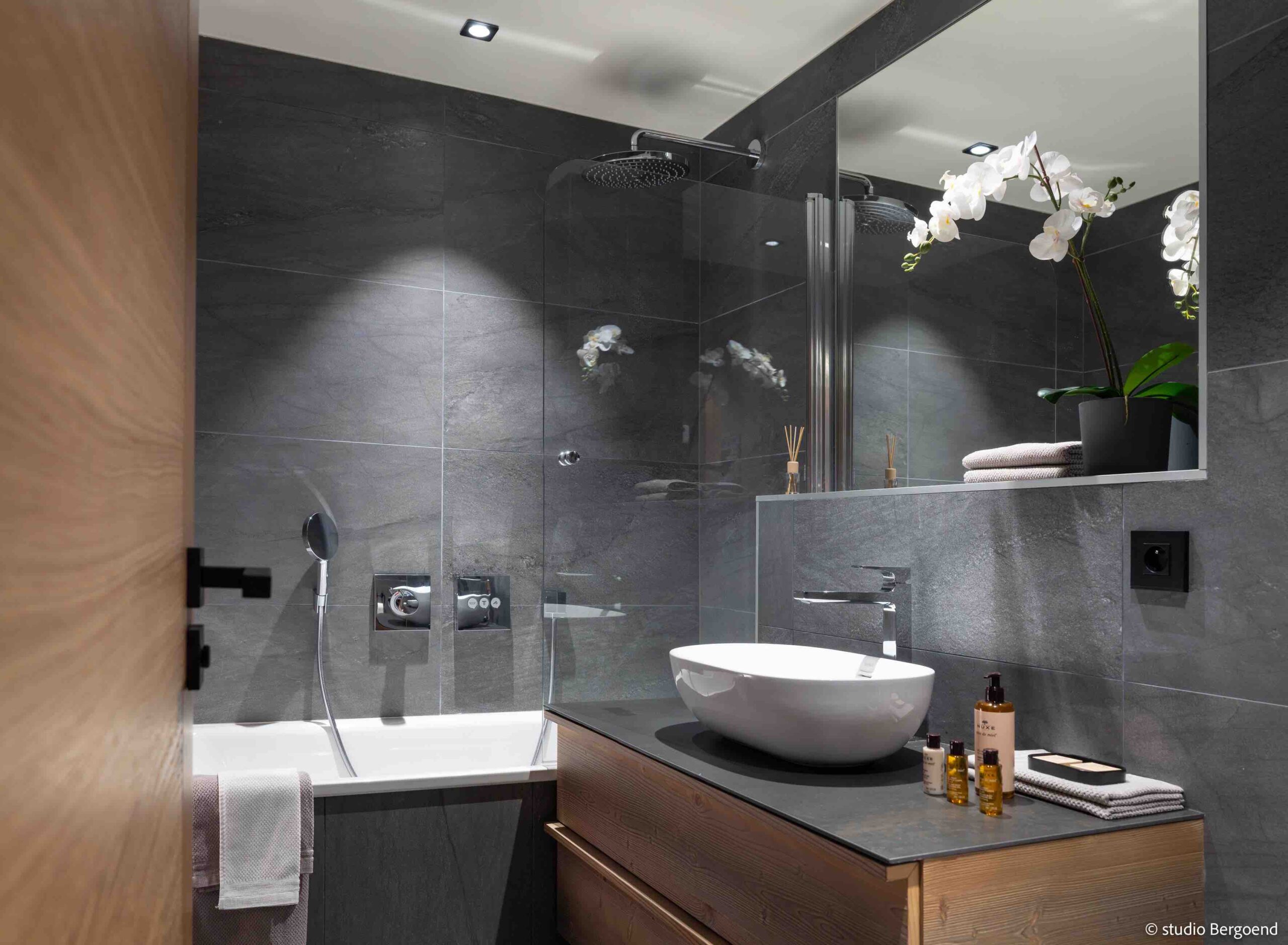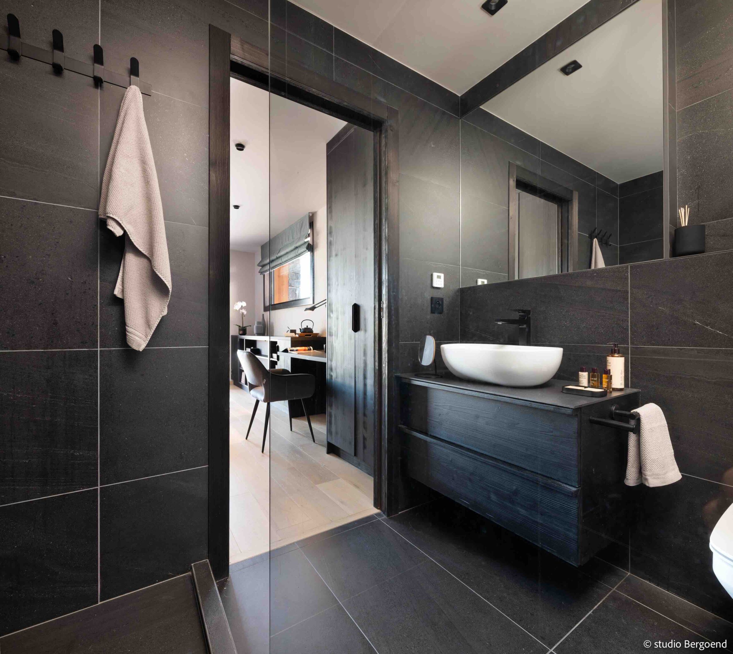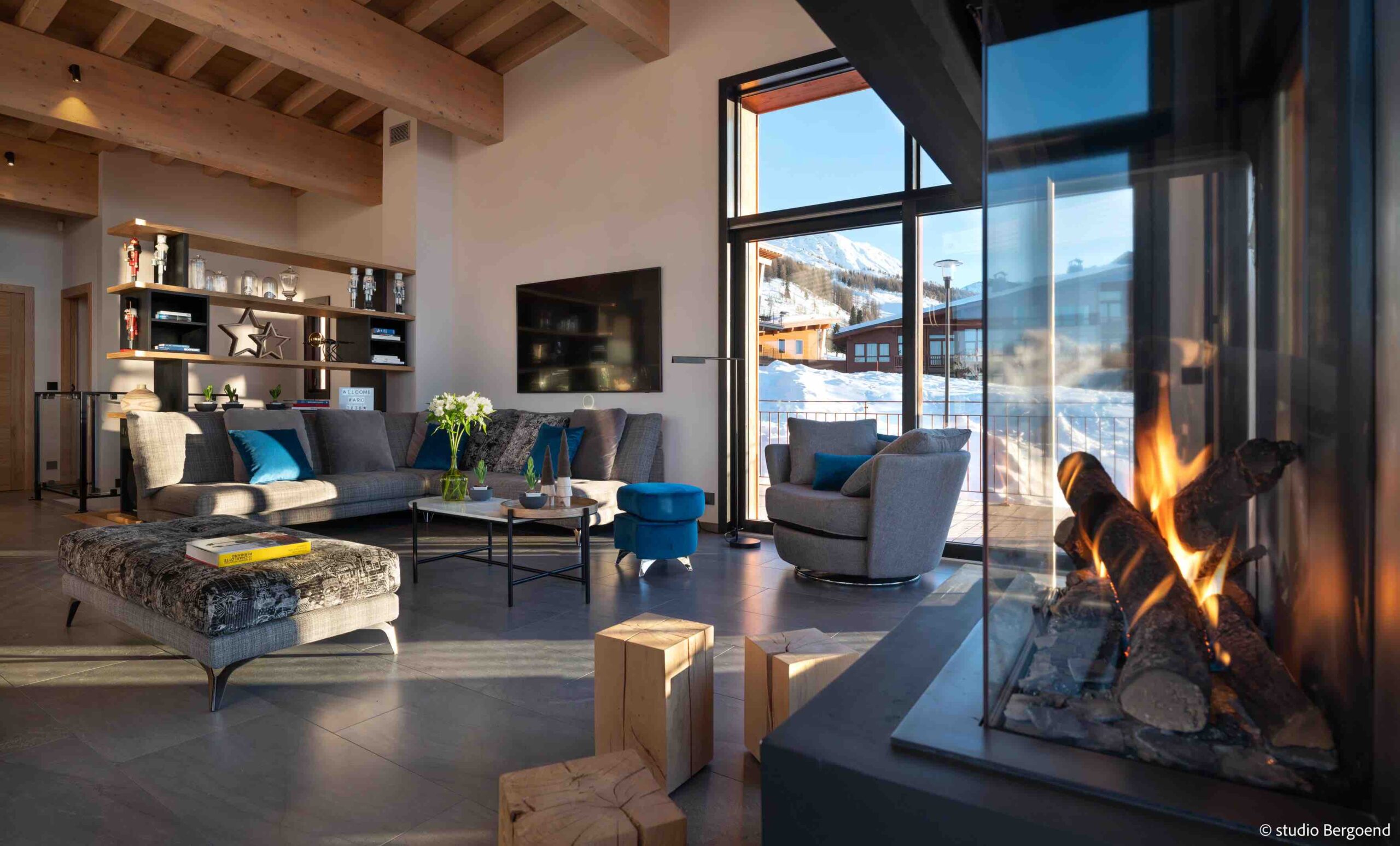 The heart of the chalet is its expansive living space, where floor-to-ceiling windows draw the mountains right into the room. Whether you’re gathering around the fireplace after a day outdoors or sharing long dinners at the dining table, the space is designed for effortless togetherness. Clean lines, bespoke furnishings and subtle alpine touches give the interiors a calm, understated elegance.