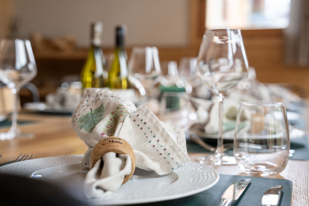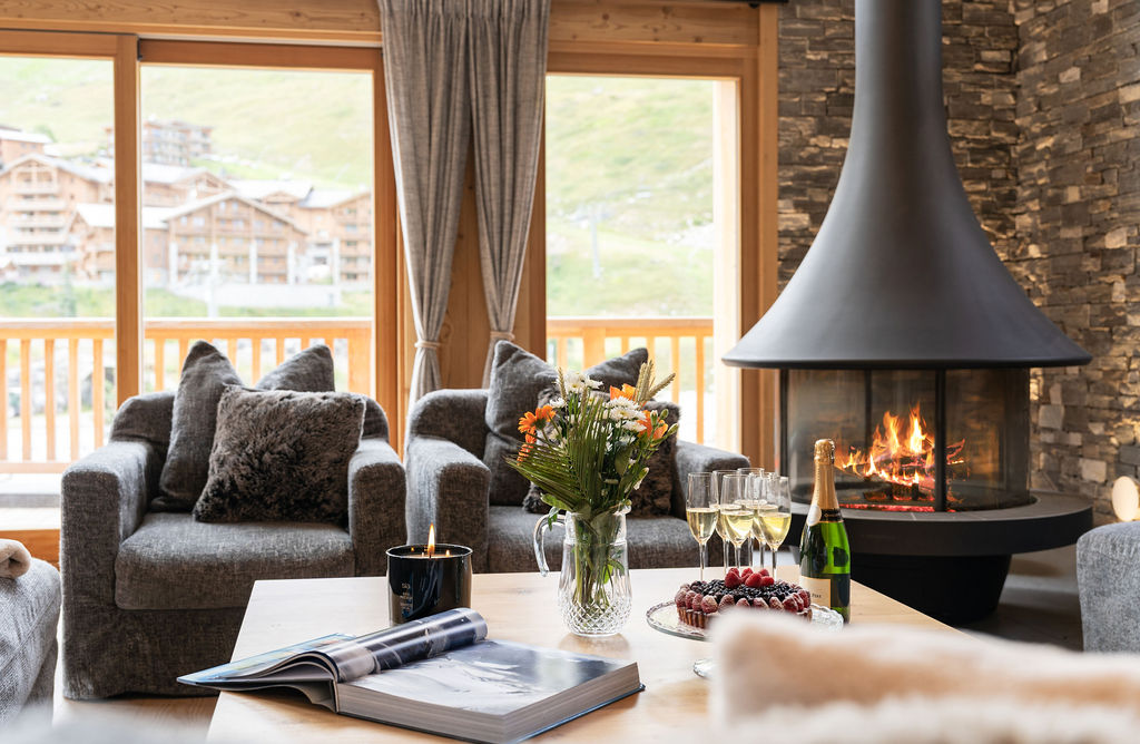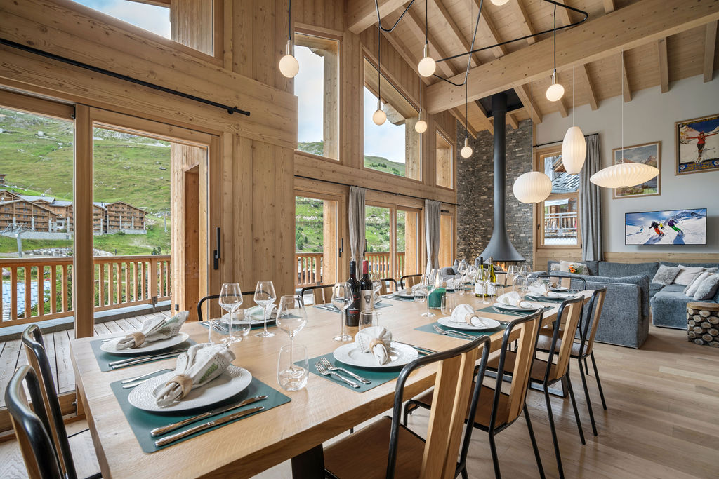 The open-plan living and dining area is filled with natural light from floor-to-ceiling windows and centered around a striking fireplace, creating a warm and stylish hub for après-ski evenings. A private chef and chalet team deliver a fully catered experience, serving cooked breakfasts, afternoon tea, canapés, and multi-course dinners paired with wine.