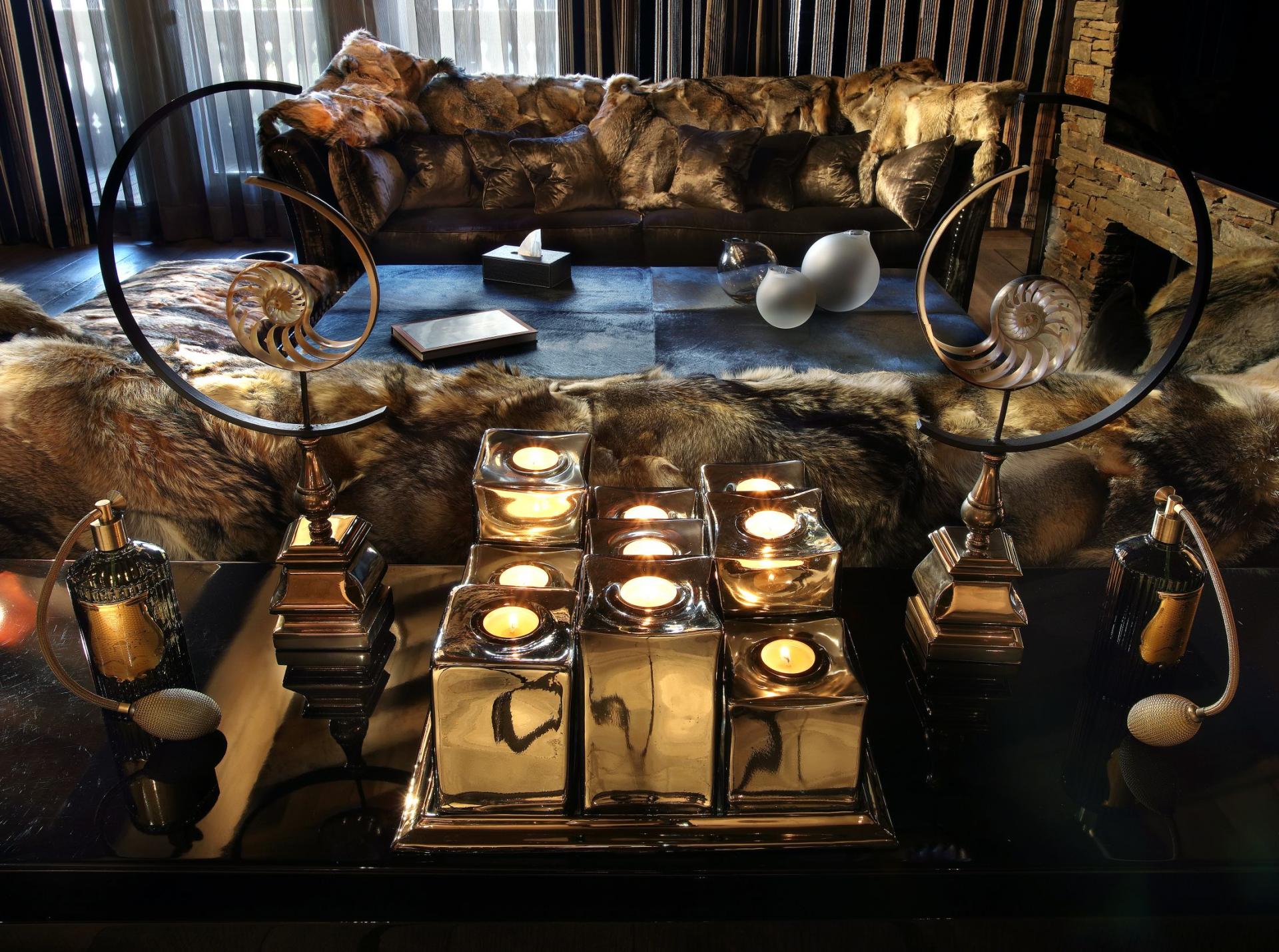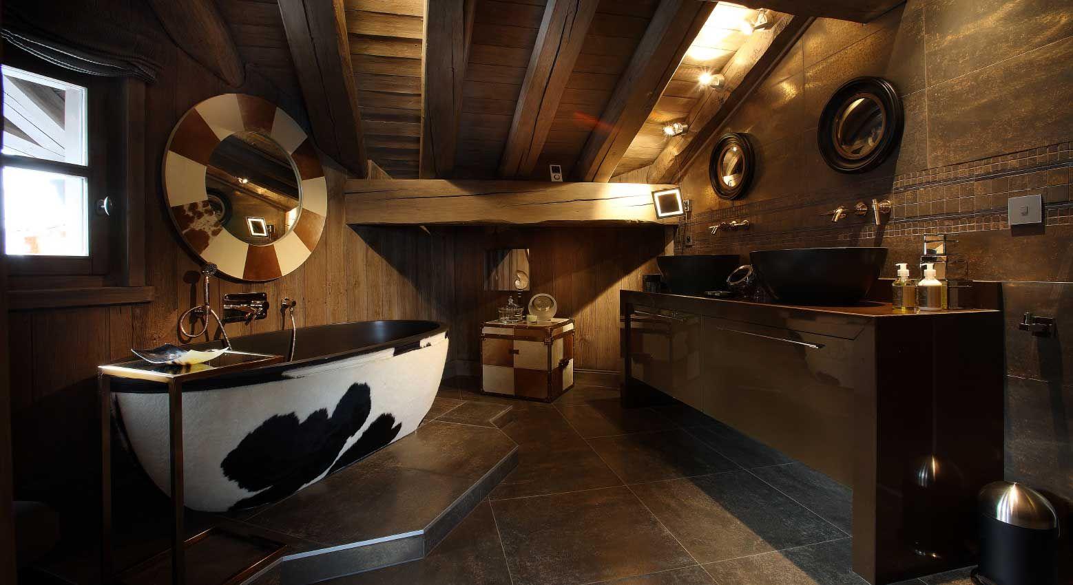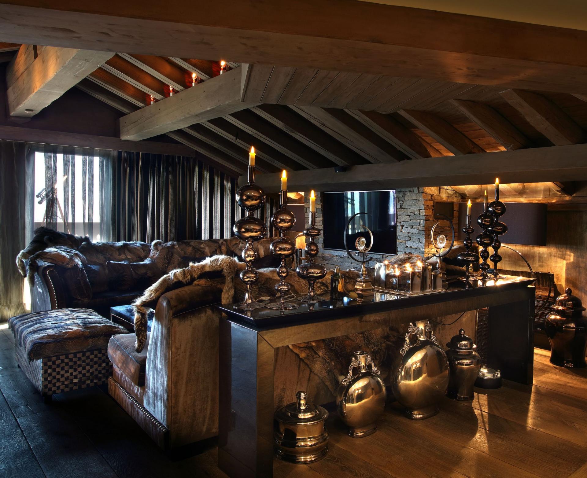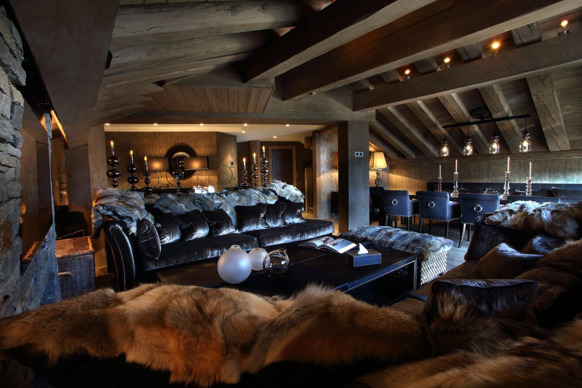 The main lounge features sumptuous leather sofas draped with plush fur throws, centred around an open stone fireplace for cosy evenings in. Reclaimed wood, vaulted beam ceilings, and rich, dark tones create an inviting rustic atmosphere, while carefully chosen décor adds sophistication. The living space flows into an elegant dining area that seats all 10 guests, with a separate professional kitchen to ensure privacy. Several balconies throughout the chalet frame panoramic mountain views in every direction.