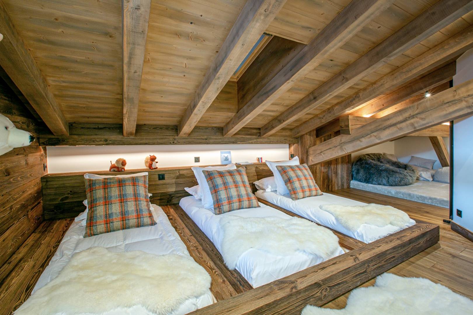 The top level of the chalet is dedicated to the master suite, which includes an en-suite bathroom with both shower and bathtub, a separate WC, a dressing room, a television and a balcony. This floor also includes a separate WC and an attic dormitory bedroom with three children’s beds, a shower room and a play area with a television.
