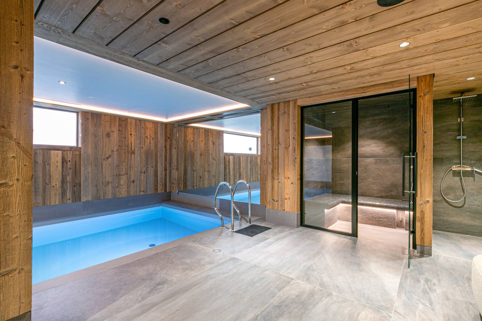 On the lower level of the chalet there is a wellness space that includes a hammam, a swimming pool, a shower and toilets. This floor also includes an elevator, a garage for two cars, a ski room with boot warmers, and the technical room.