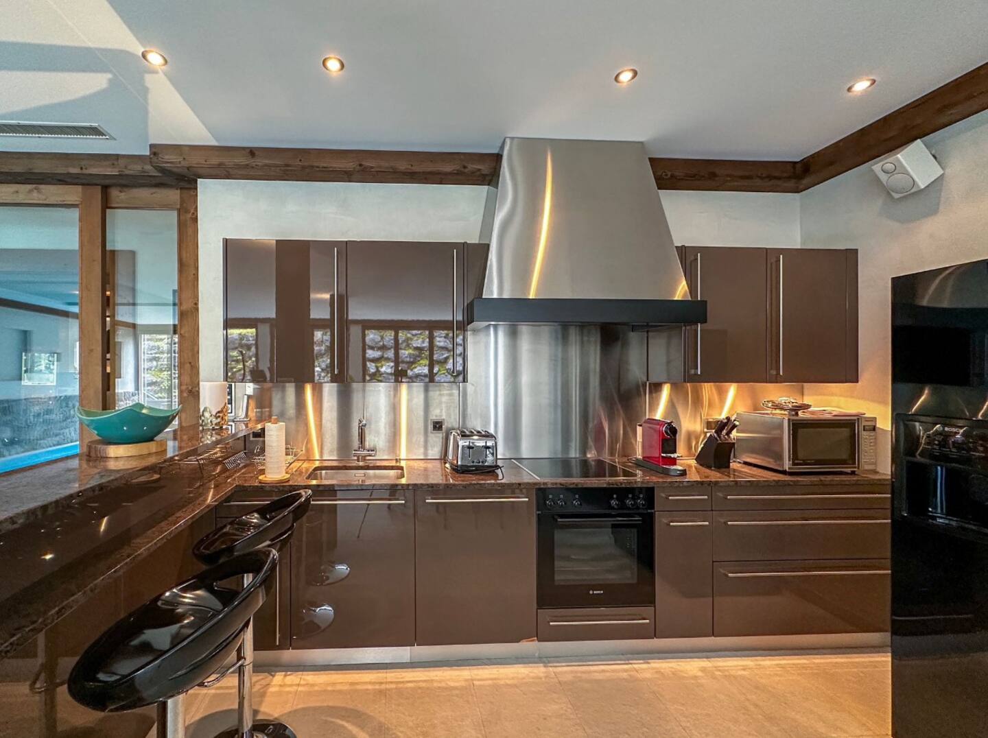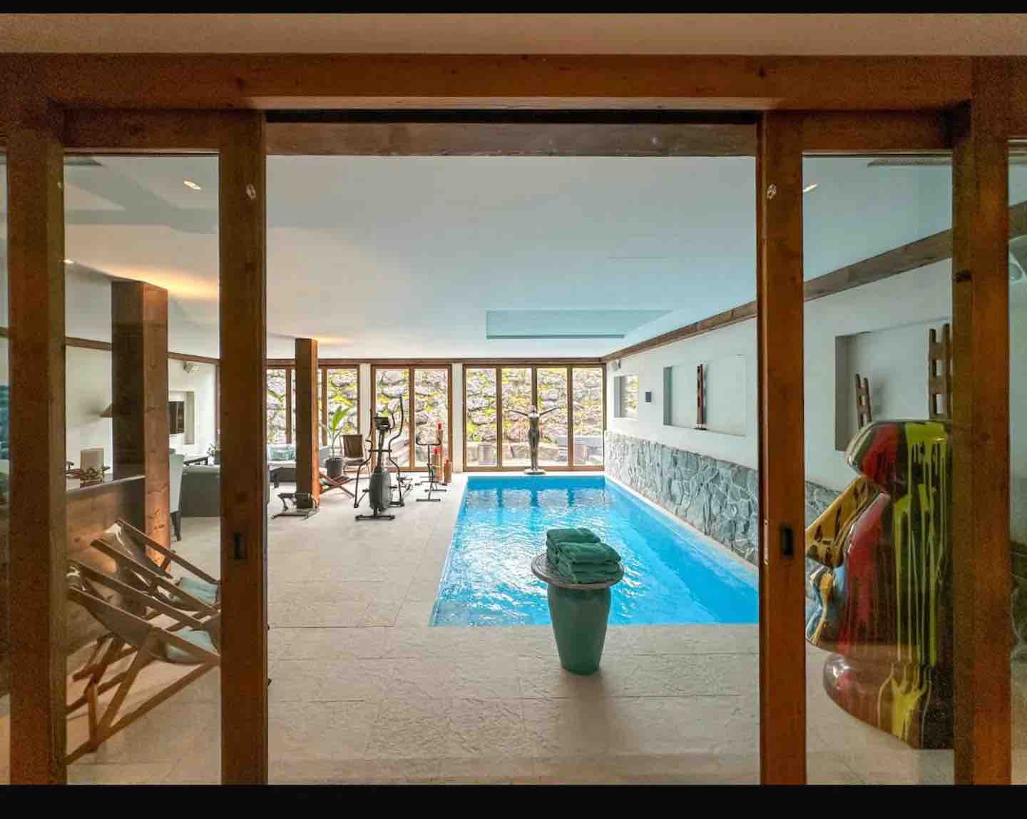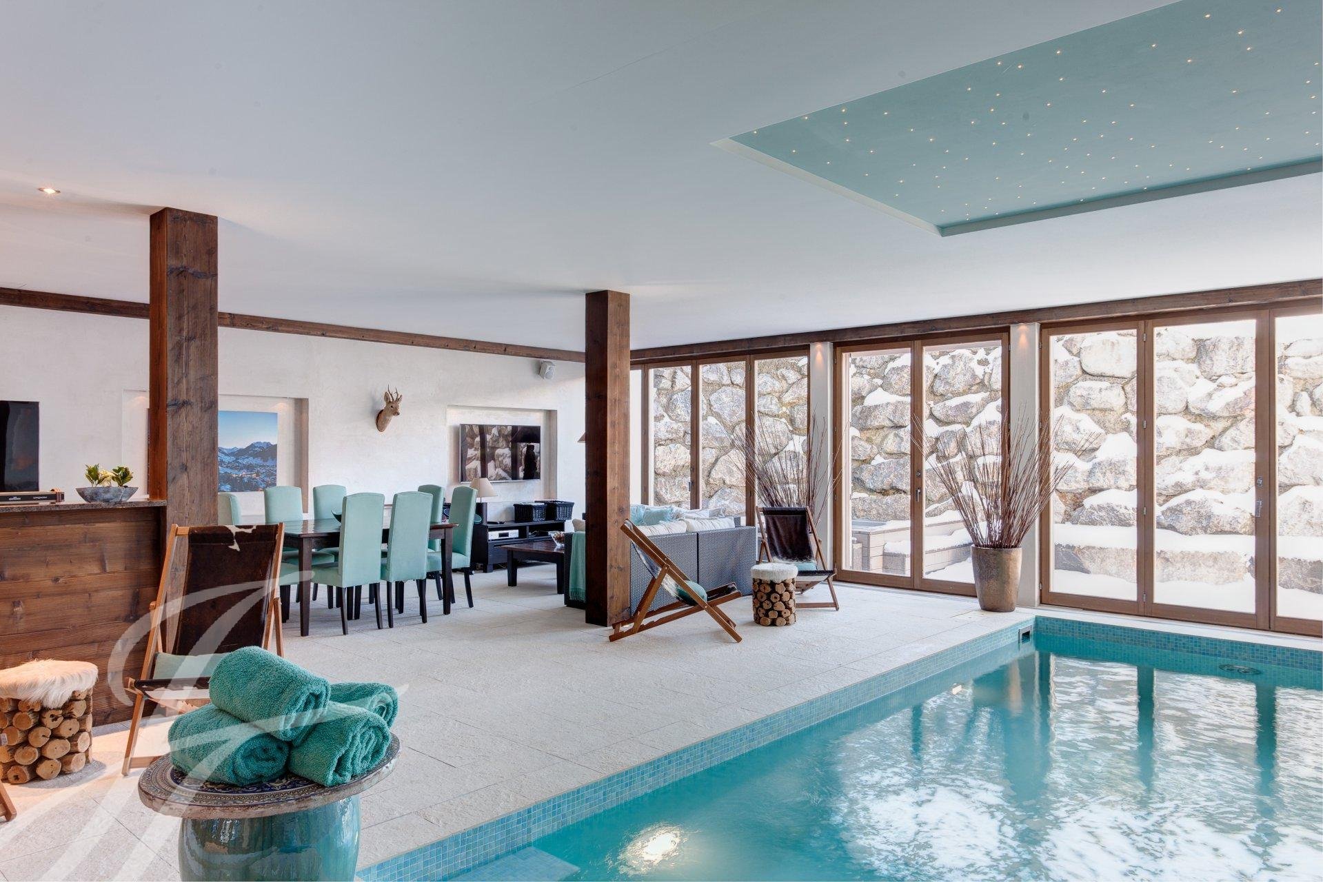 Each of the 7 bedrooms in this chalet features its own well-appointed bathroom, ensuring utmost privacy and convenience for every guest. With a total of 7 sumptuous beds, our chalet graciously accommodates up to 14 guests. The indoor swimming pool serves as an exquisite oasis of relaxation, providing the perfect venue to unwind after indulging in the picturesque surroundings.
