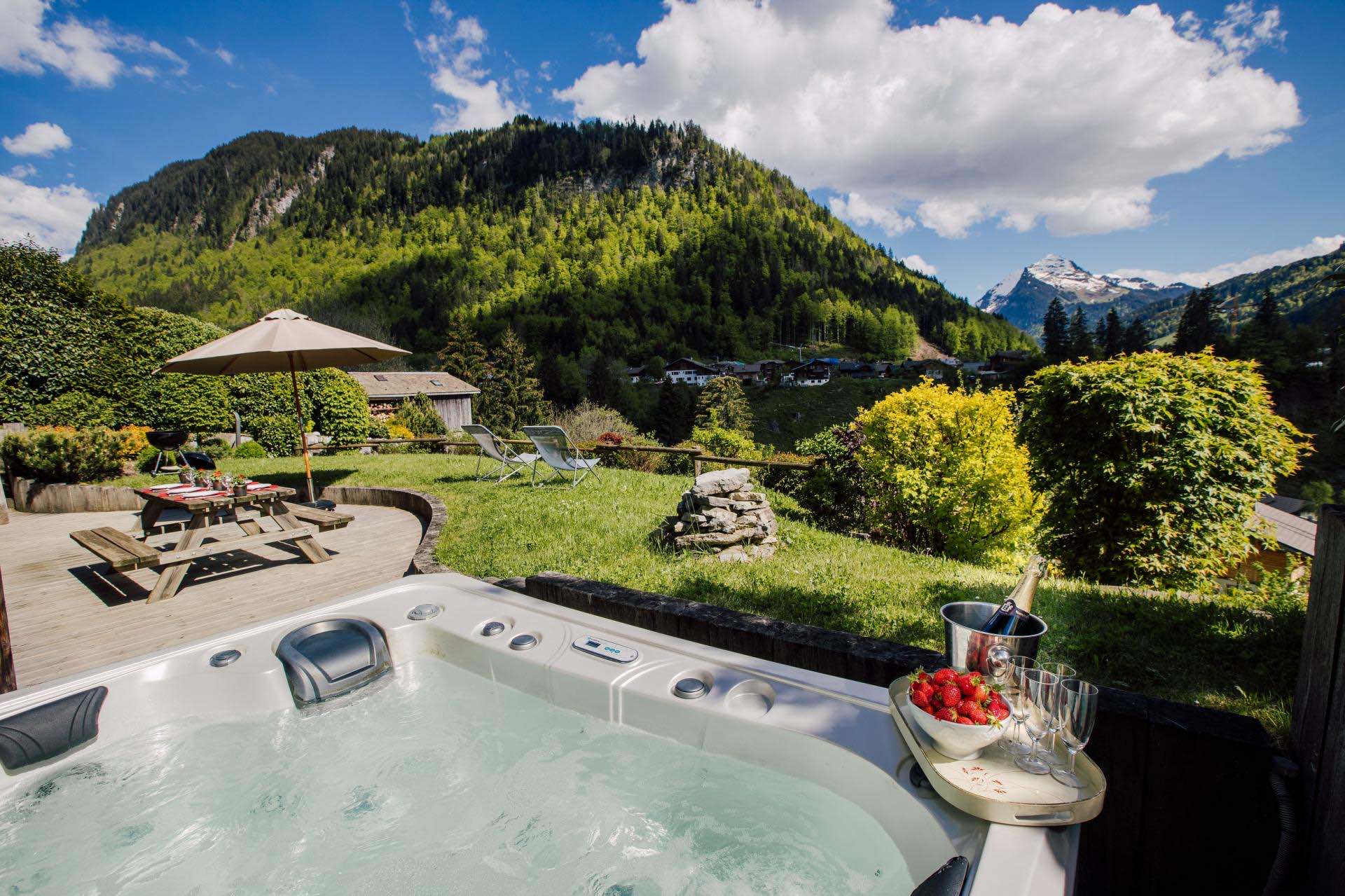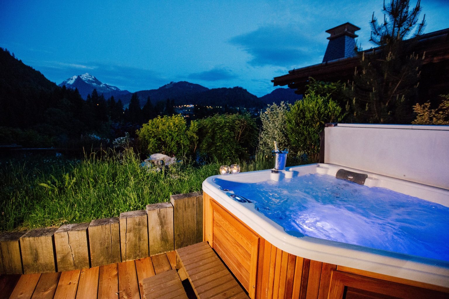 Step inside to discover a sophisticated open-plan living space where original wooden beams and rustic textures meet elegant, couture-inspired interiors. A statement fireplace divides the lounge and kitchen, while plush seating, a dedicated bar area, and handpicked furnishings create an atmosphere that is both indulgent and inviting. Large doors open onto a south-facing terrace, revealing breathtaking views across the Morzine valley and leading to a private outdoor hot tub, perfect for unwinding after a day in the mountains.